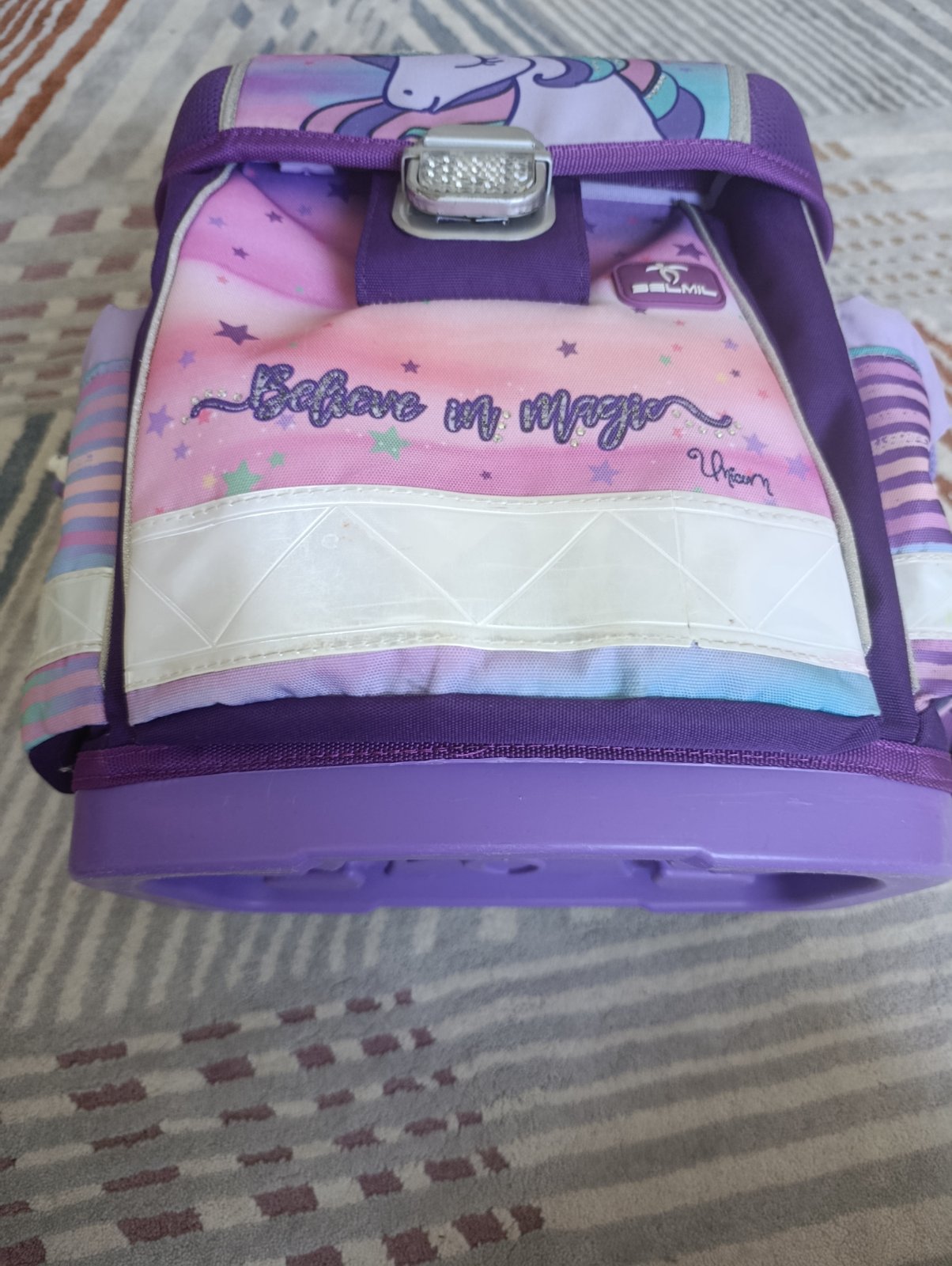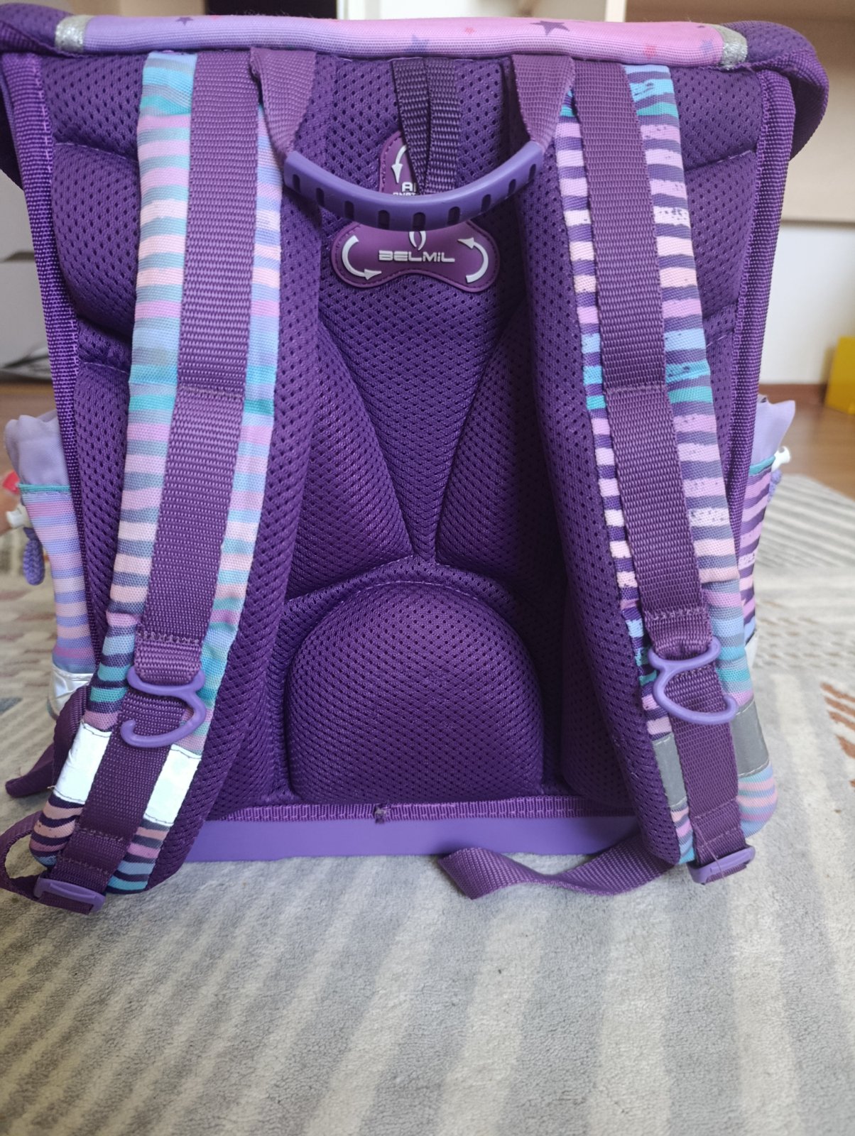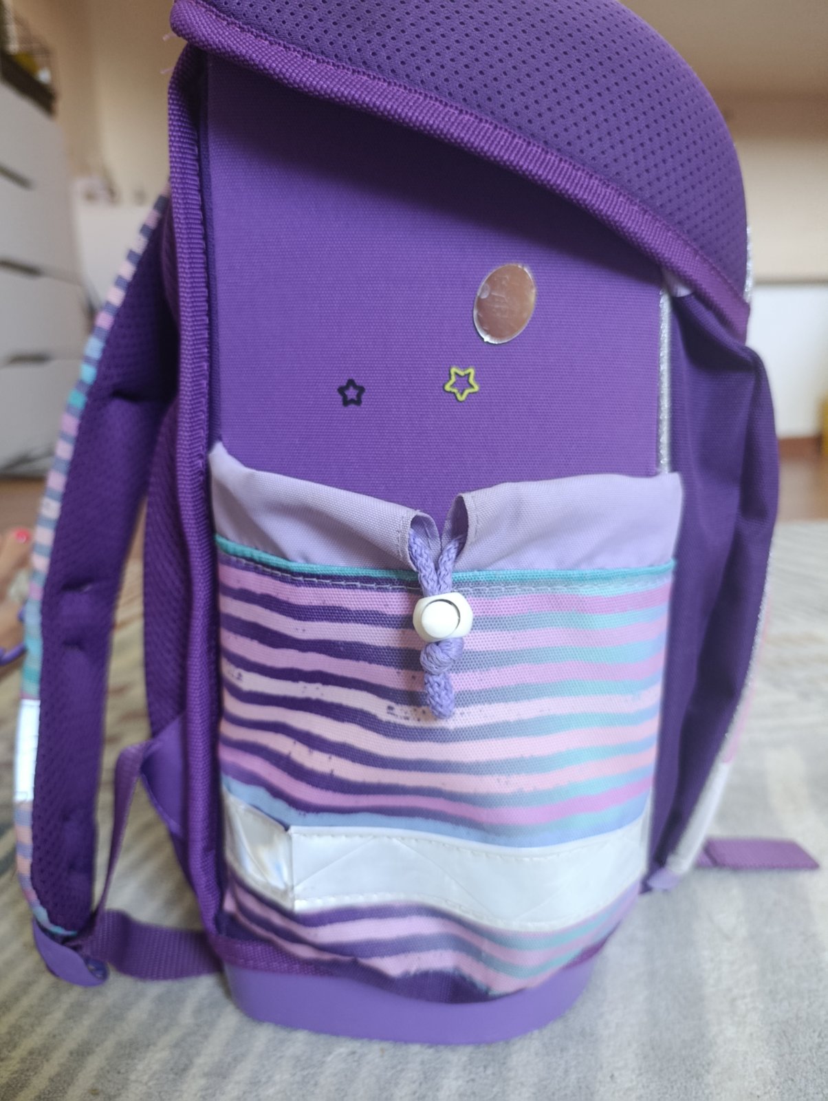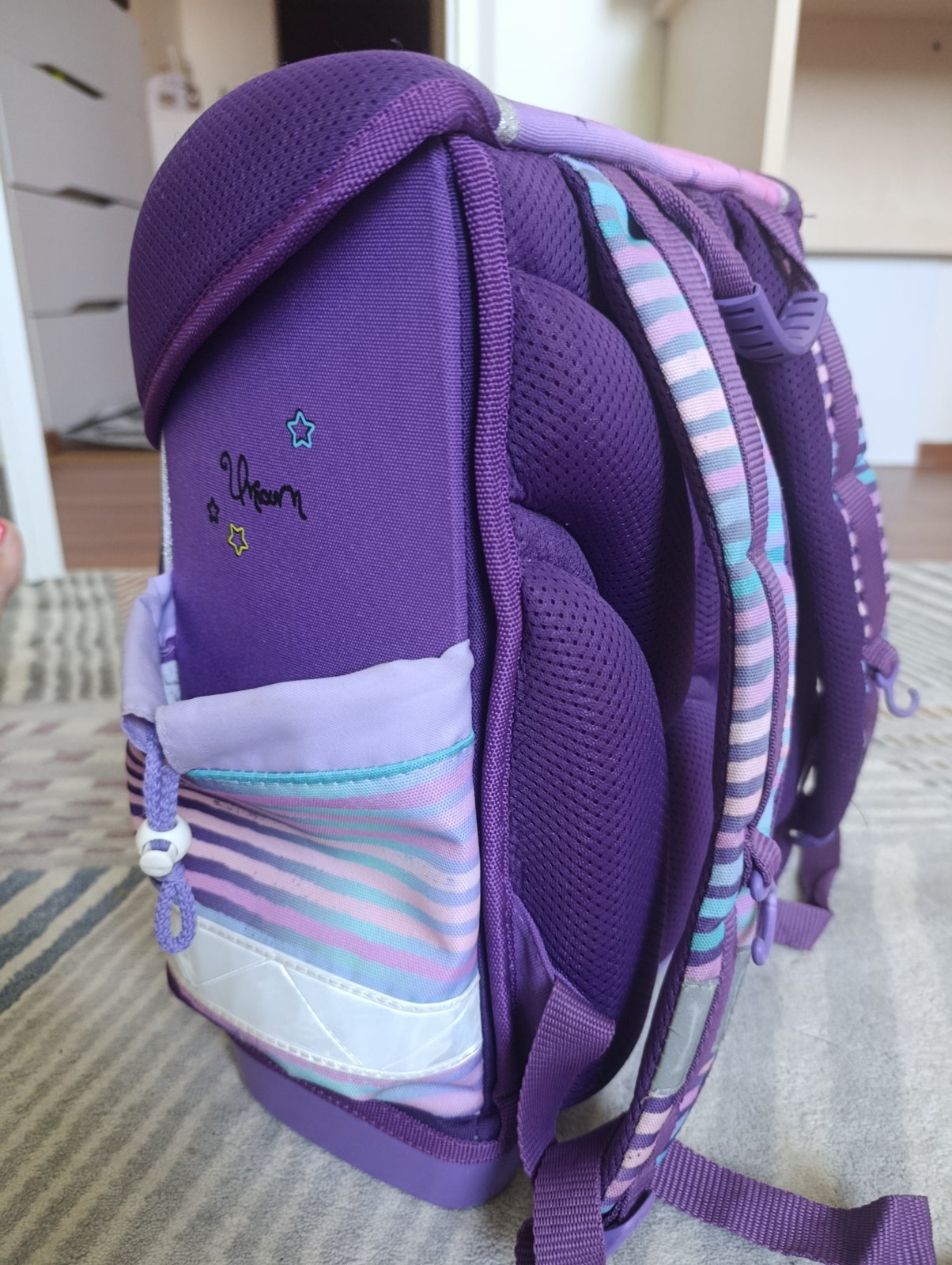 Školská taška po dcérke. Ponúkam na predaj, lebo dostala novú. Je vo veľmi dobrom stave, má bežné známky používania. Tašku som kompletne vyčistila (vyprala). Na reflexných prvkoch sú také malé praskliny. Iné chyby nevidím.