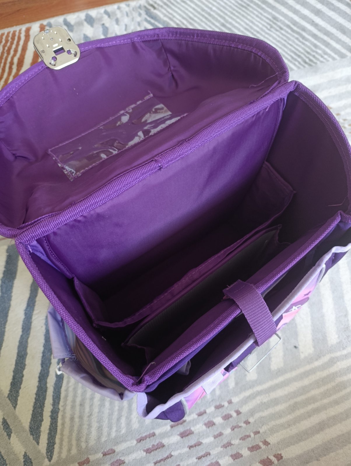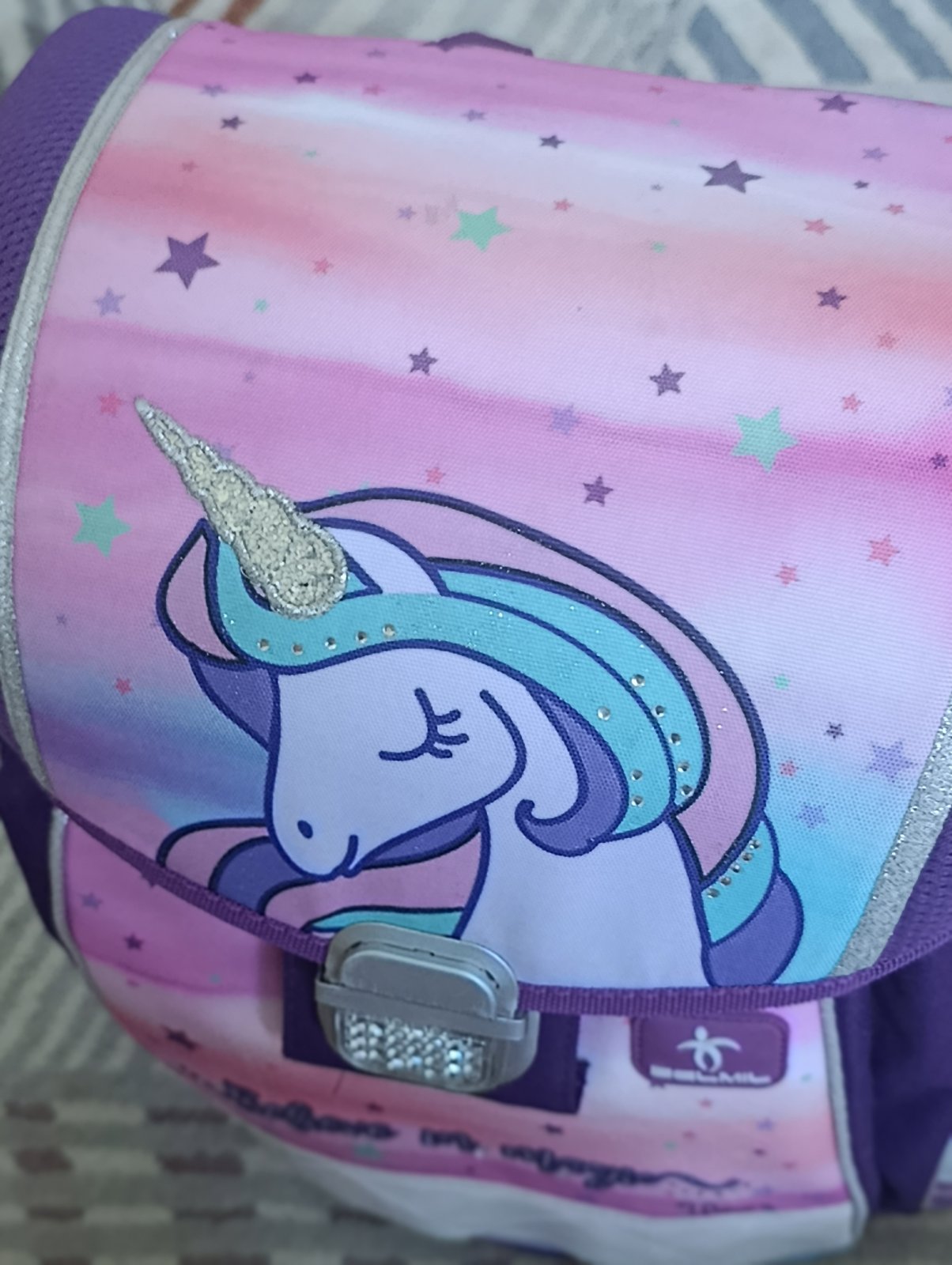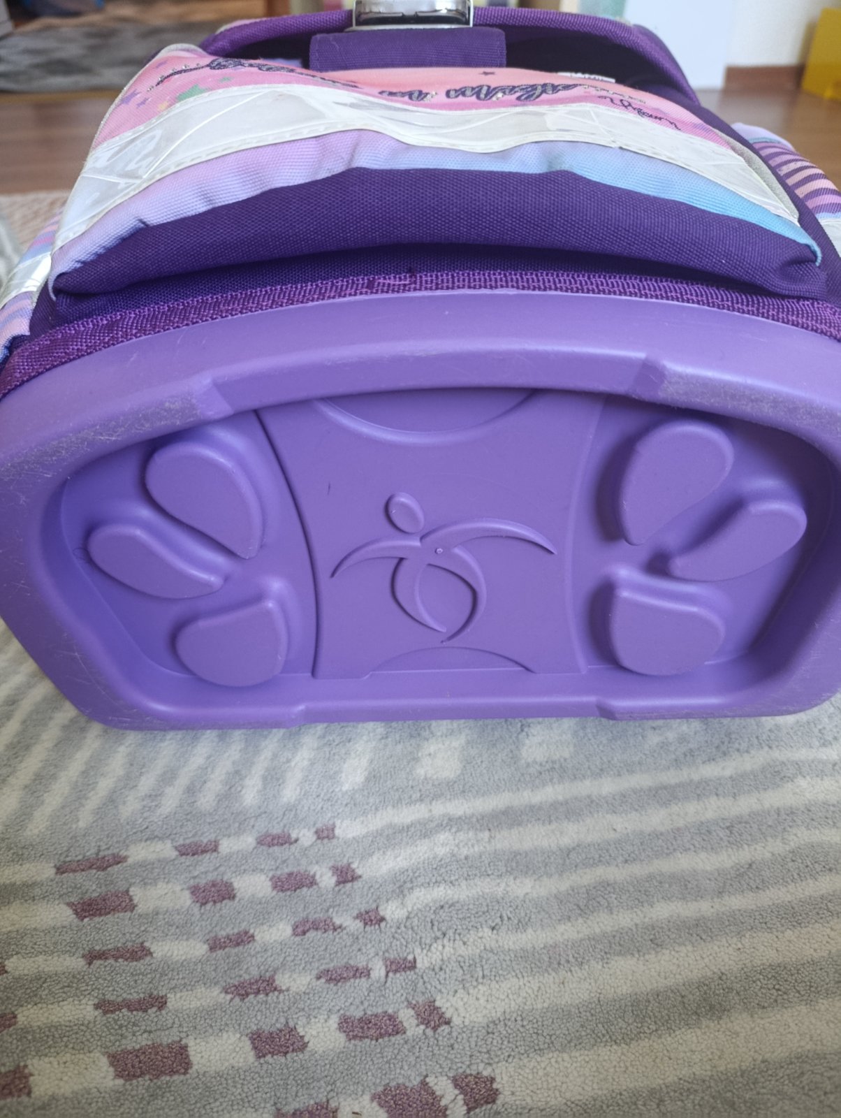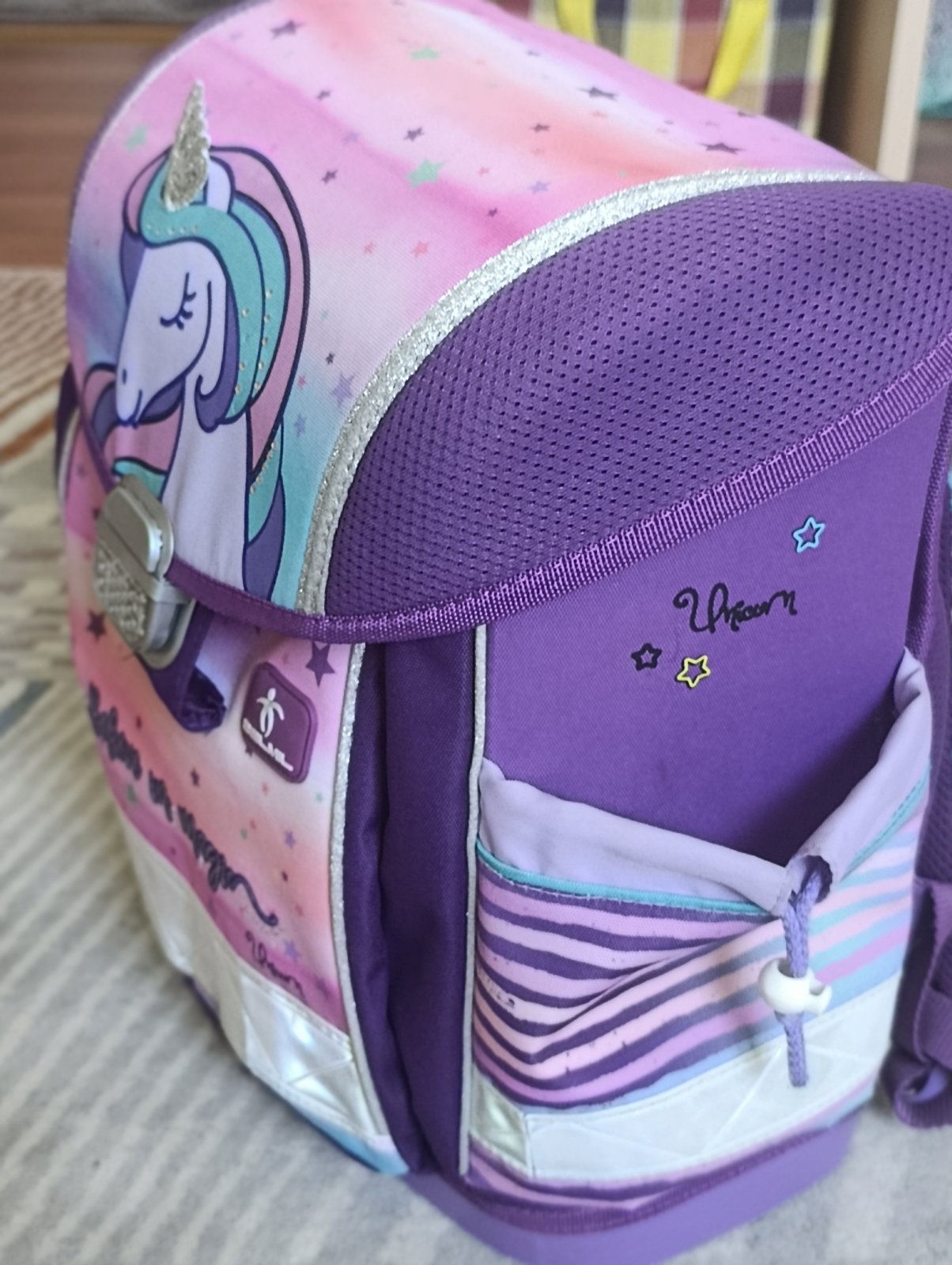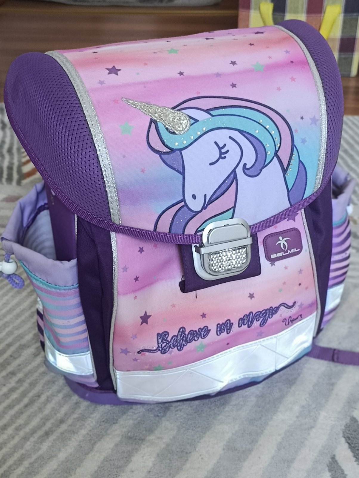 Školská taška po dcérke. Ponúkam na predaj, lebo dostala novú. Je vo veľmi dobrom stave, má bežné známky používania. Tašku som kompletne vyčistila (vyprala). Na reflexných prvkoch sú také malé praskliny. Iné chyby nevidím.