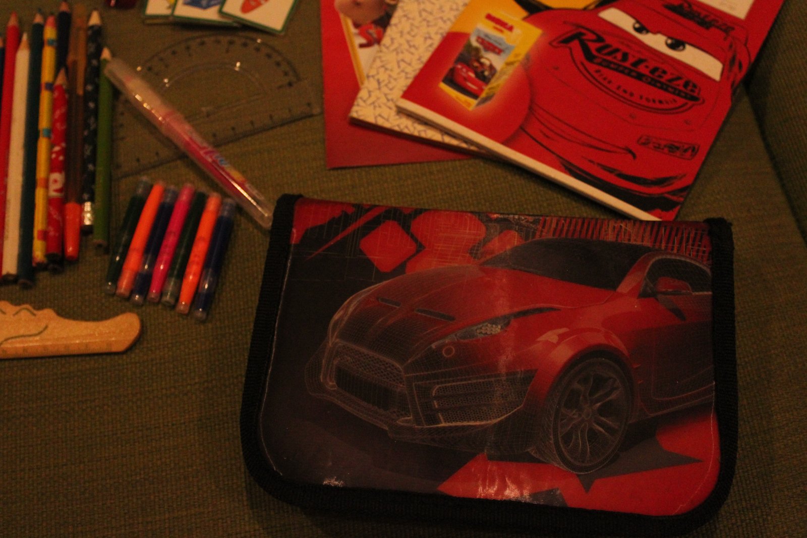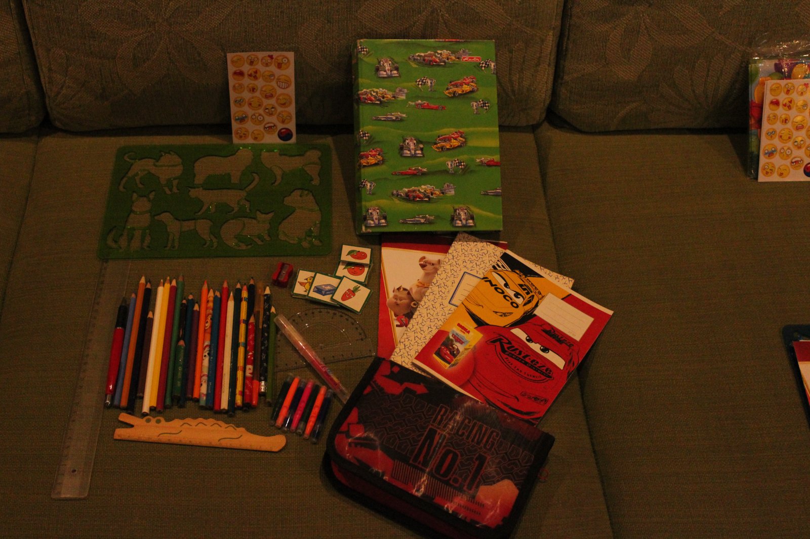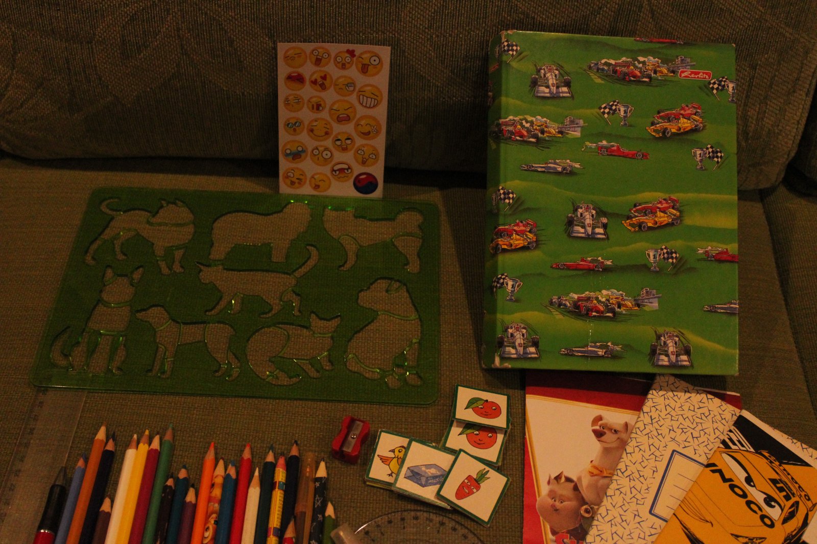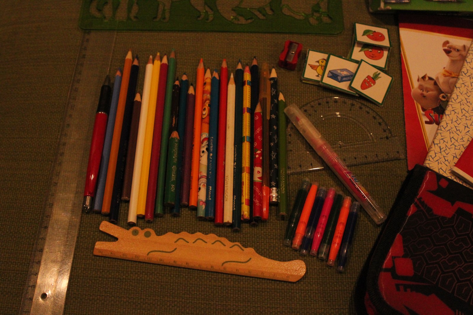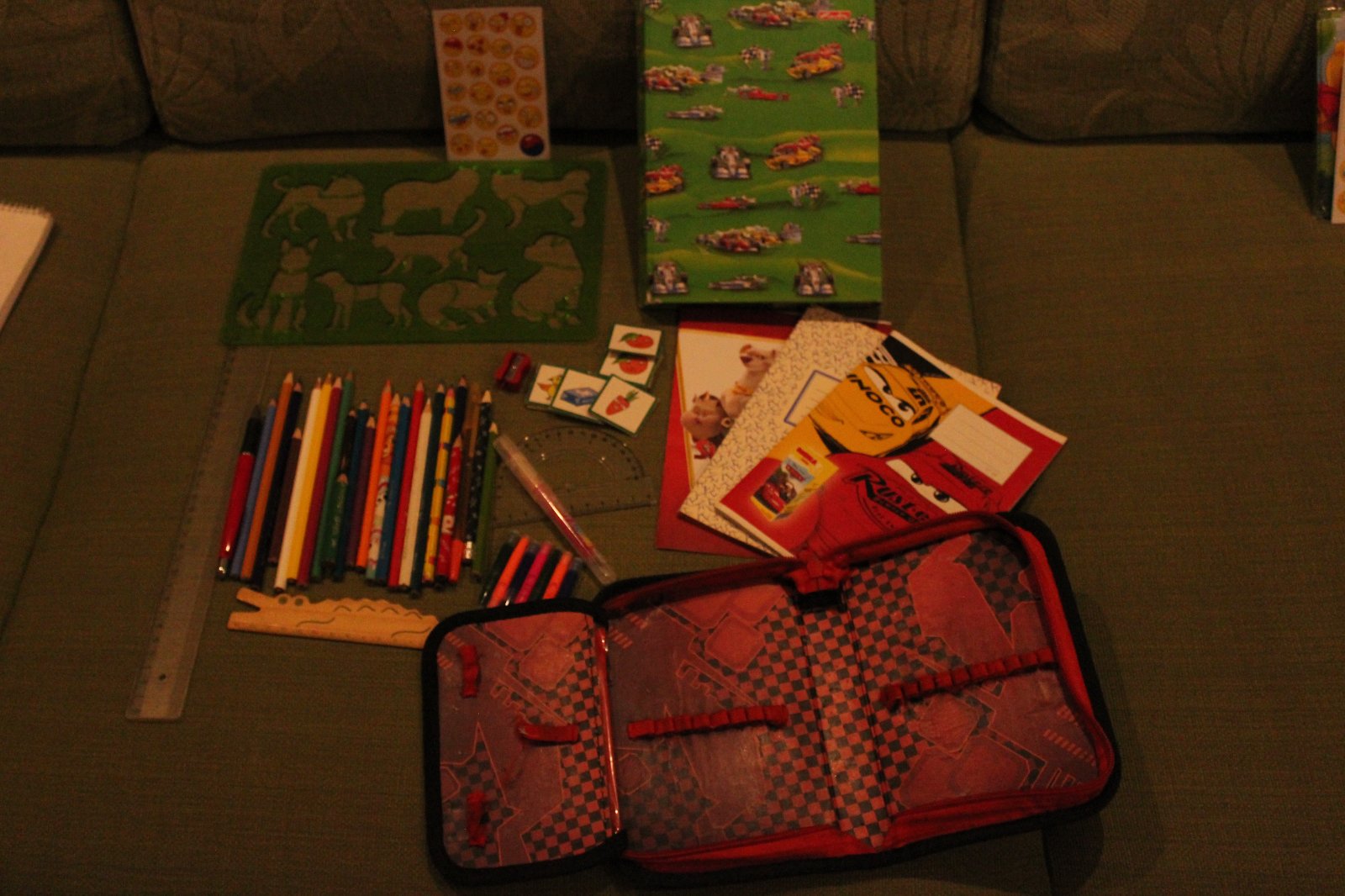 Veľká sada školských potrieb, niektoré viac, niektoré menej, niektoré vôbec nepoužívané. Sada obsahuje peračník, box na zošity, pravítka, uhlomer, šablónu na kreslenie, veľa ceruziek, strúhadlo na ceruzky, zvýrazňovač s náhradnými náplňami rôznych farieb, zošity, pexeso a veselé nálepky. Ako vidíte, mali sme zo všetkého veľa.