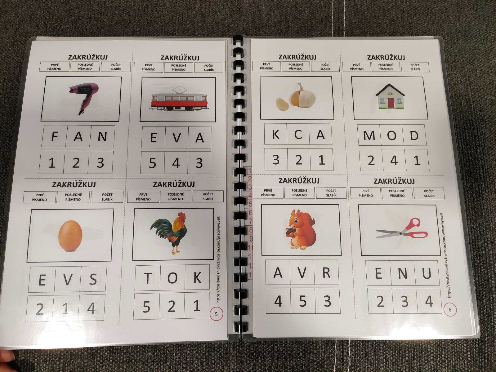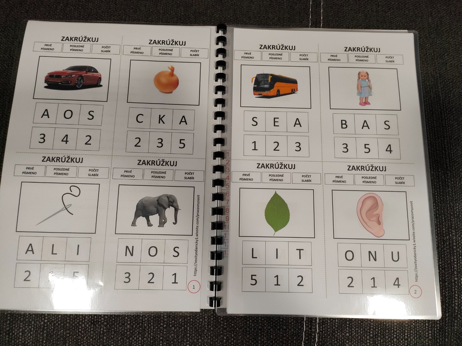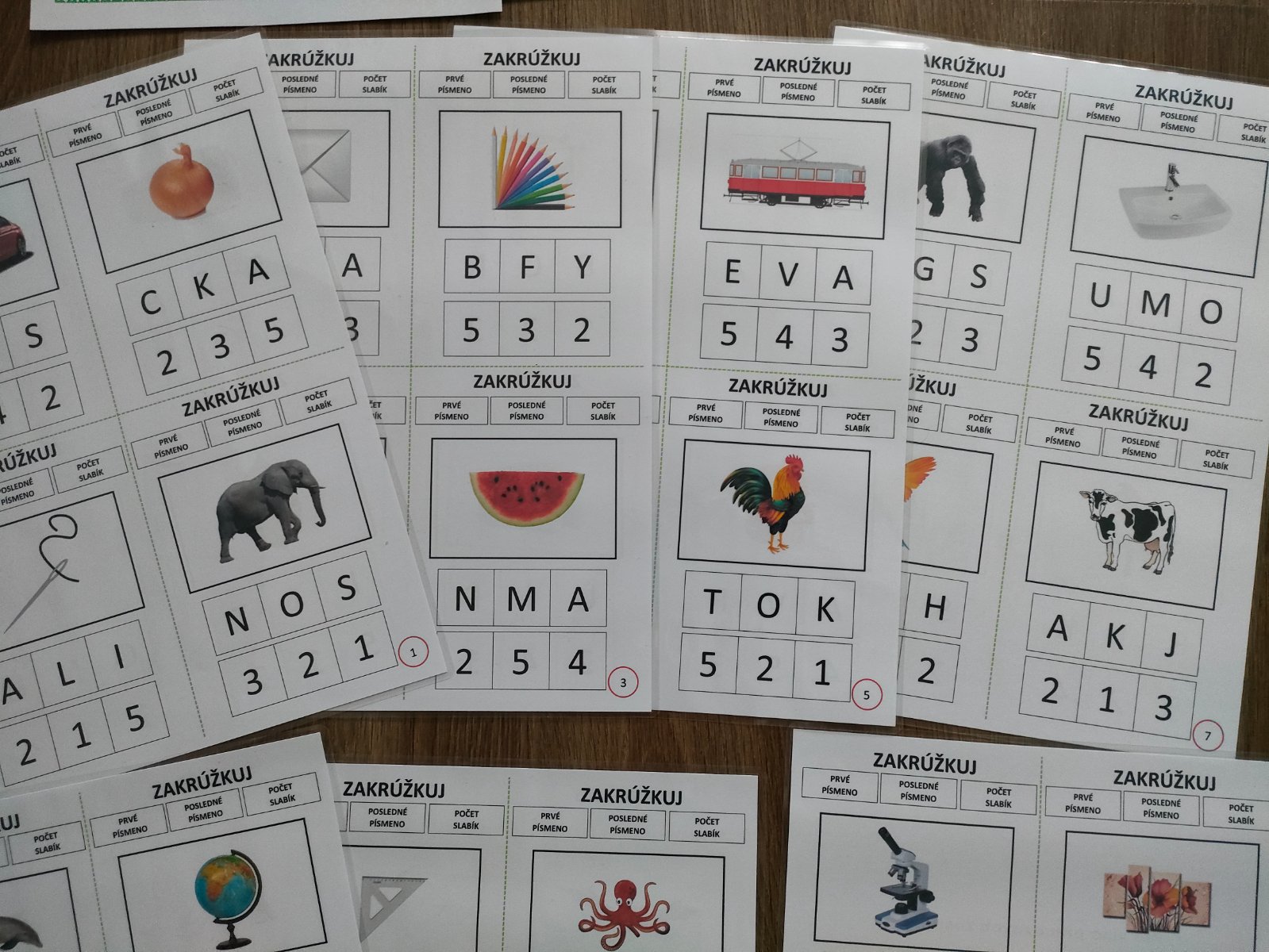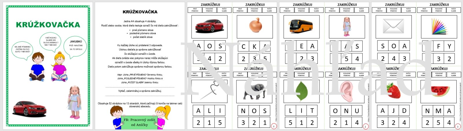 Dieťa sa naučí určiť : prvé písmeno slova ,posledné písmeno slova a počet slabík slova. Jedna A4 obsahuje 4 obrázky. Spolu teda 52 obrázkov na 13 stranách, ktoré začínajú či končia na takmer celú slovenskú abecedu. Súčasťou je aj pomôcka, ktorá obsahuje pomenovanie všetkých obrázkov rozdelených podľa strán. Ak dieťa potrebuje vidieť slovo tak odporúčam túto pomôcku rozstrihať a priradiť k obrázkom.