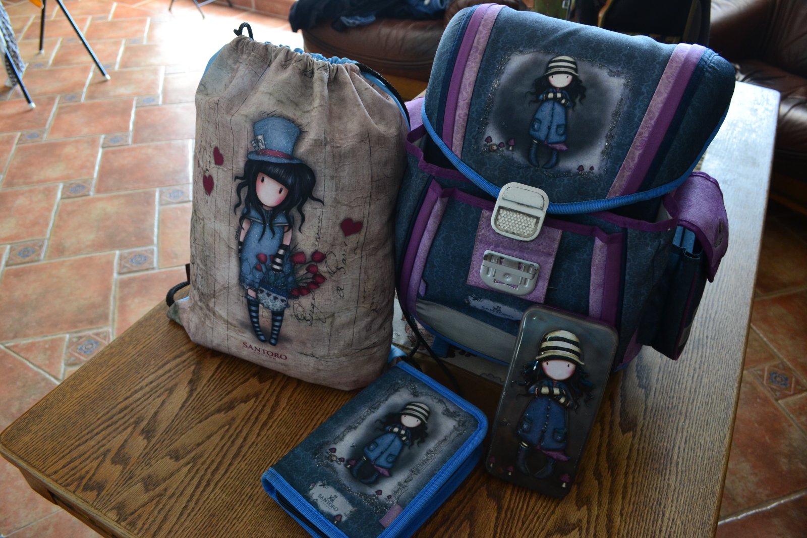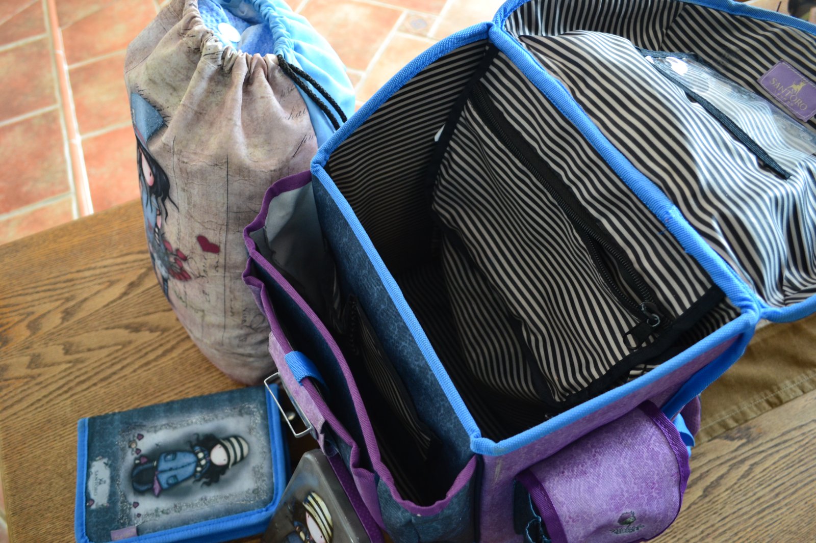 Školský set krásnej značky Santoro London pre dievča obsahuje školskú tašku, vrecko na prezuvky, peračník, plechový peračník. zachovalé, funkčné. Cena 30 eur + poštovné