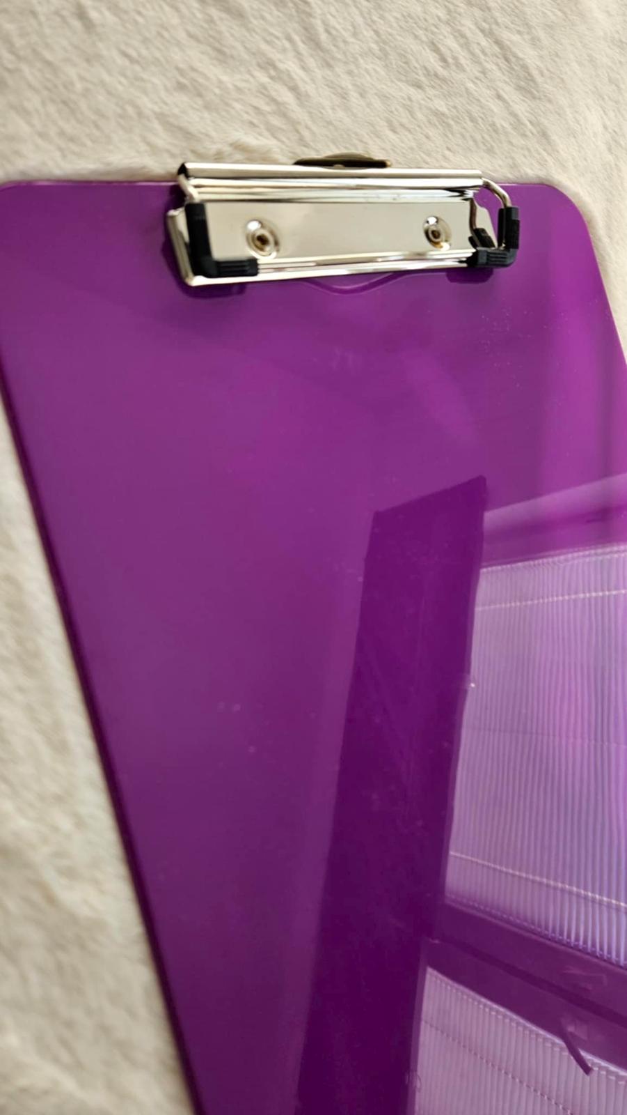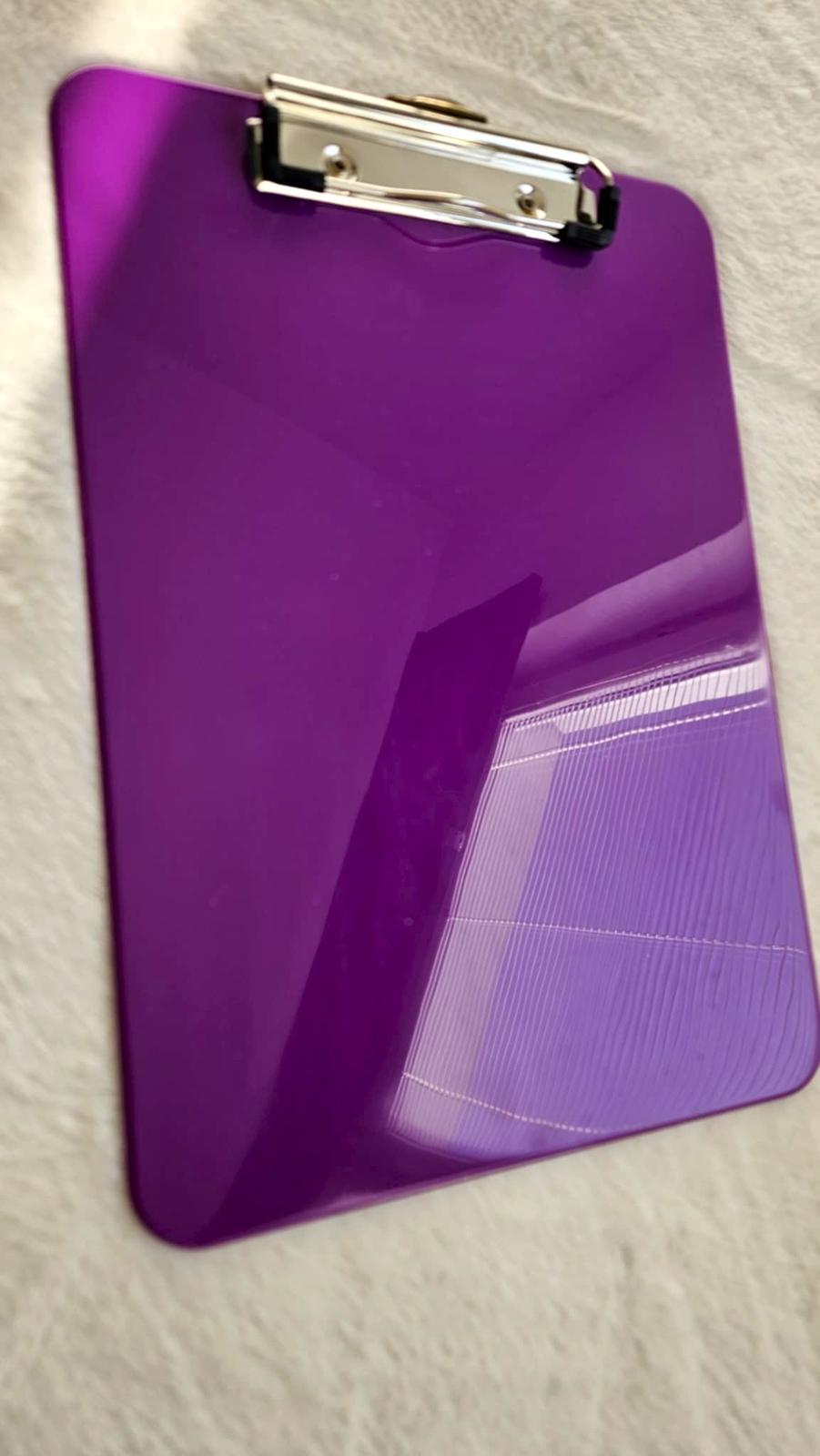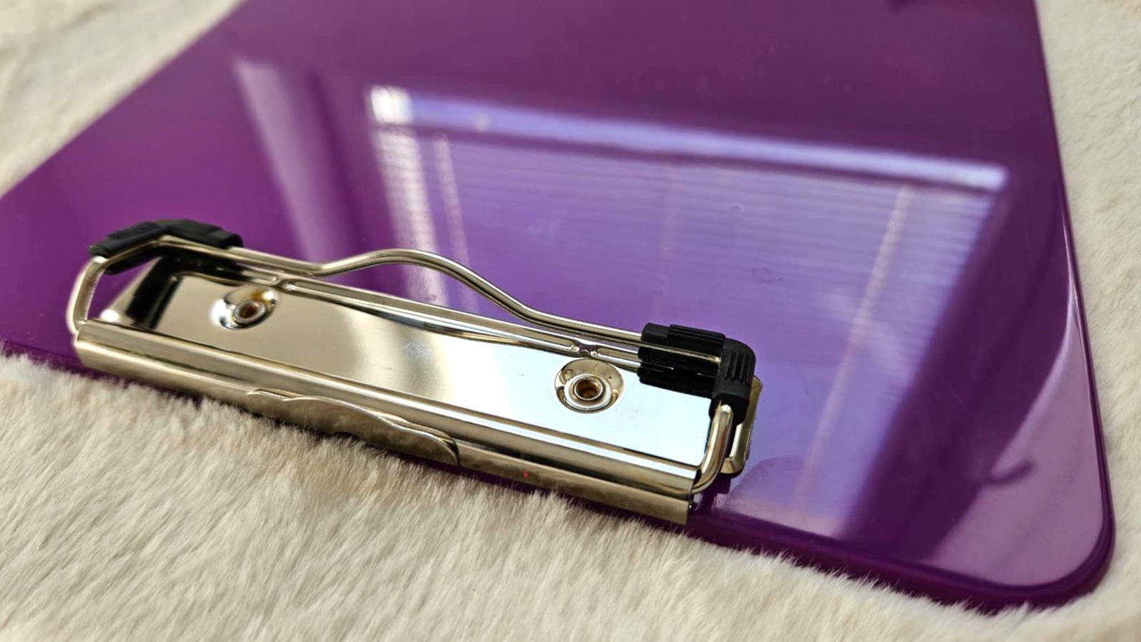 Plastová písacia podložka vo fialovej farbe s kovovým klipom, ktoré slúžia na uchytenie tlačiva, dokumentu alebo čistého papiera.