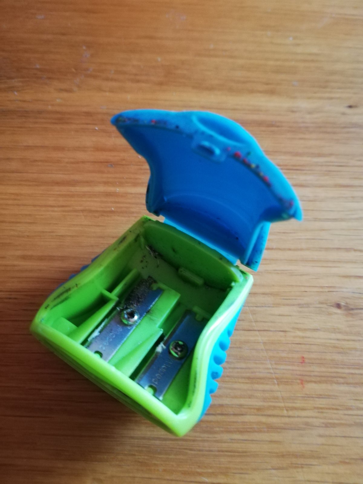 Strúhadlo vo výbornom stave, pekná farebná kombinácua pre dievča, aj chlapca. Na dve veľkosti farbičiek. Zn. Maped