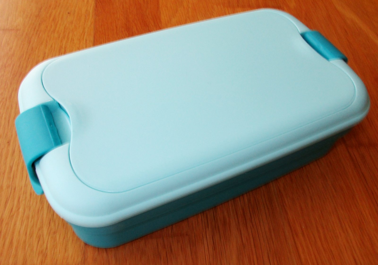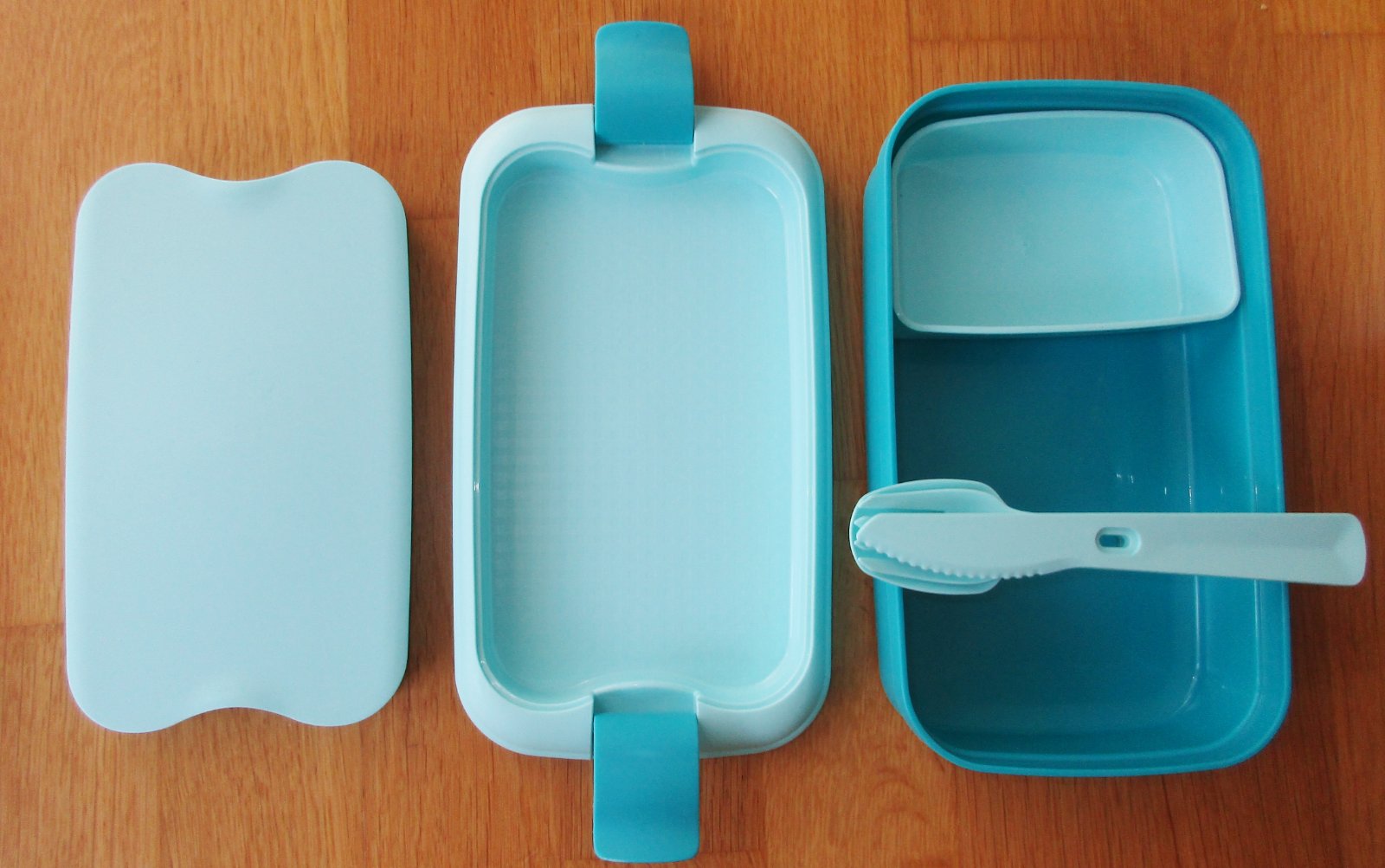 Tyrkysovy box na desiatu pre kohokolvek s velmi kvalitne riesenym tesnením proti vytečeniu. Funkcne a bez chyby. Komplet obsahuje: pribor komplet aj s lyzicou, misku a 2-dielny vrchnak s 2 klipmi. Kvalitny plast, vyrobene v EU, ziadna Cina. Rozmery: 32 x 13 x 7 cm, Objem udavany vyrobcom celkovy 1,3 l. Bez chybicky, ako z obchodu.