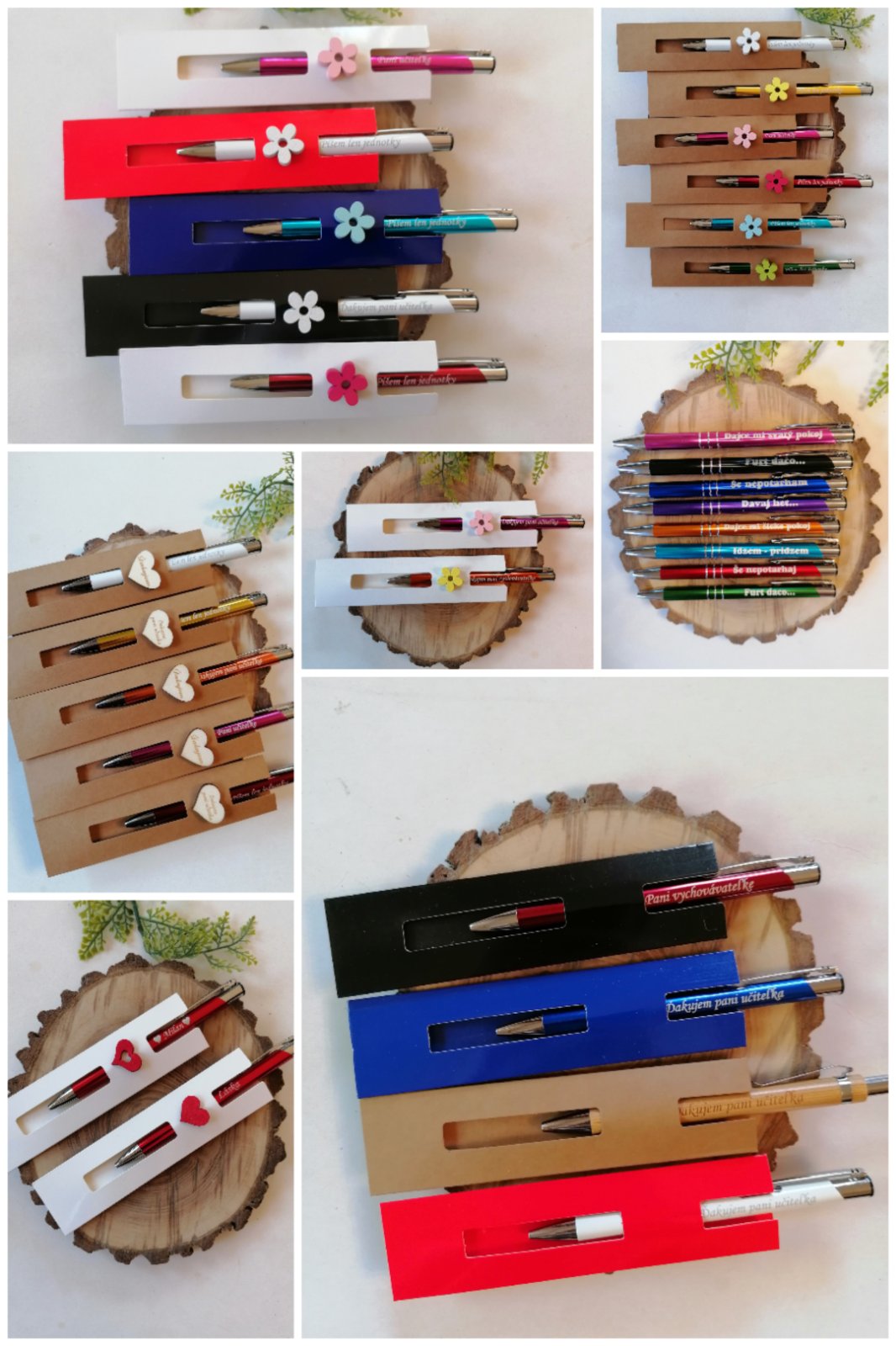 Vyrábam gravírovane farebné pera s rôznym textom alebo menom, samostatné gravírovane pero je 1,50e a v darčekovom balení od 1,90e po 2,50e podľa typu, farba pera je od bielej po čiernu.