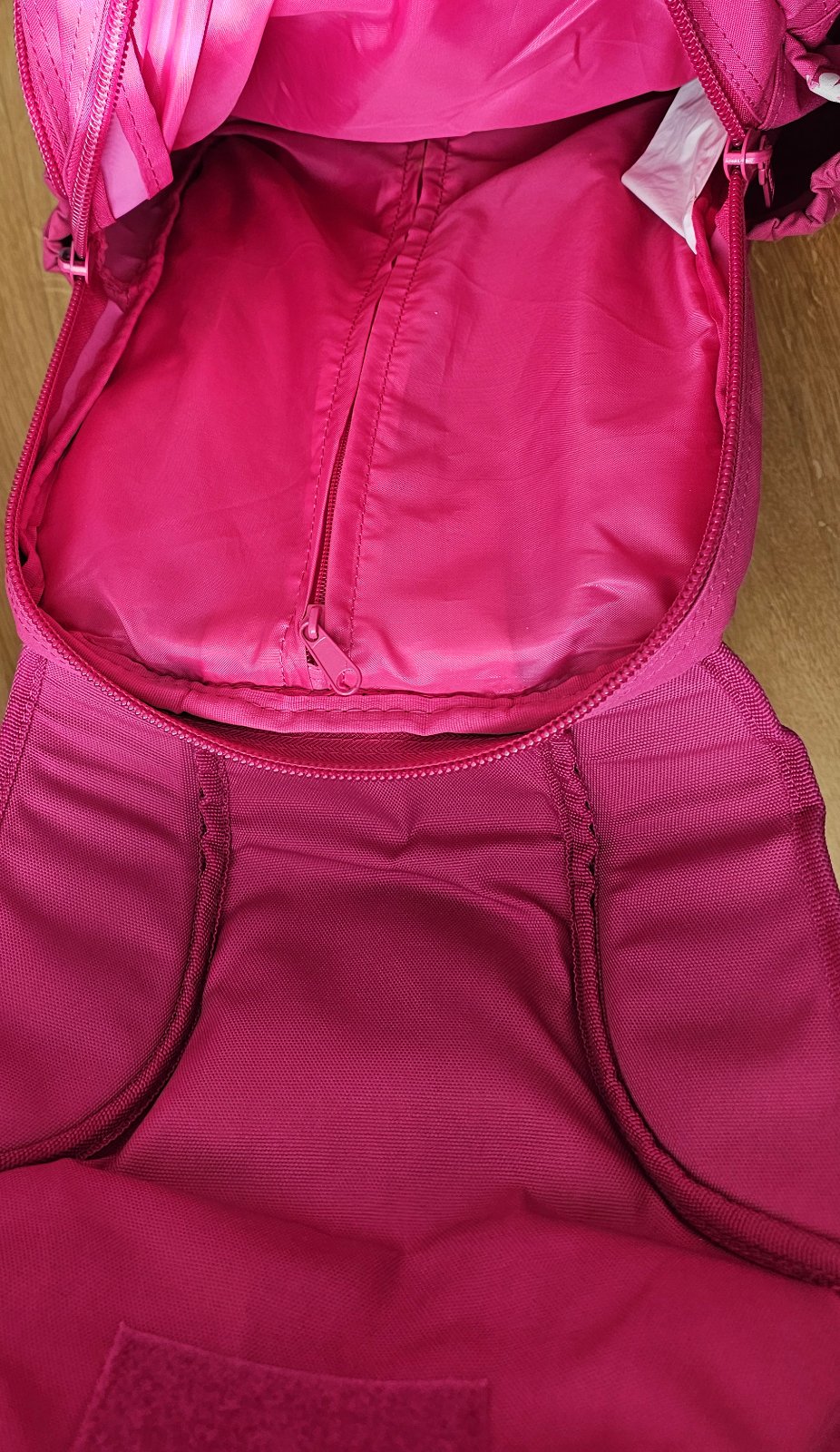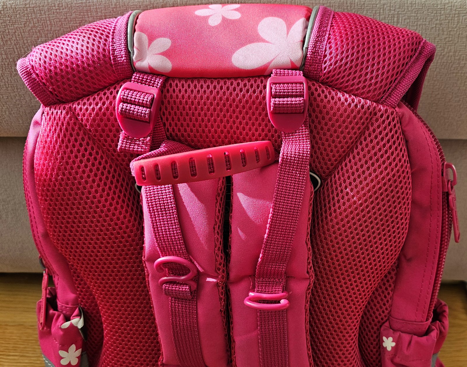 - na mäkko polstrovaných ramenných popruhoch s nastaviteľnou dĺžkou sú uchytené pomocné popruhy pre lepšie rozloženie váhy batohu