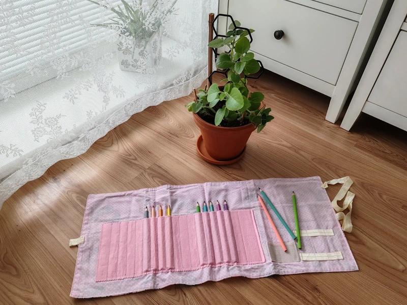Ušitý na objednávku. Nepoužívaný. Rozmery 67cm x 28cm. Na 20 farbičiek. Má aj miesto na gumu, strúhadlo... Mám 2ks. Pozri ostatné inzeráty. Bez farbičiek.