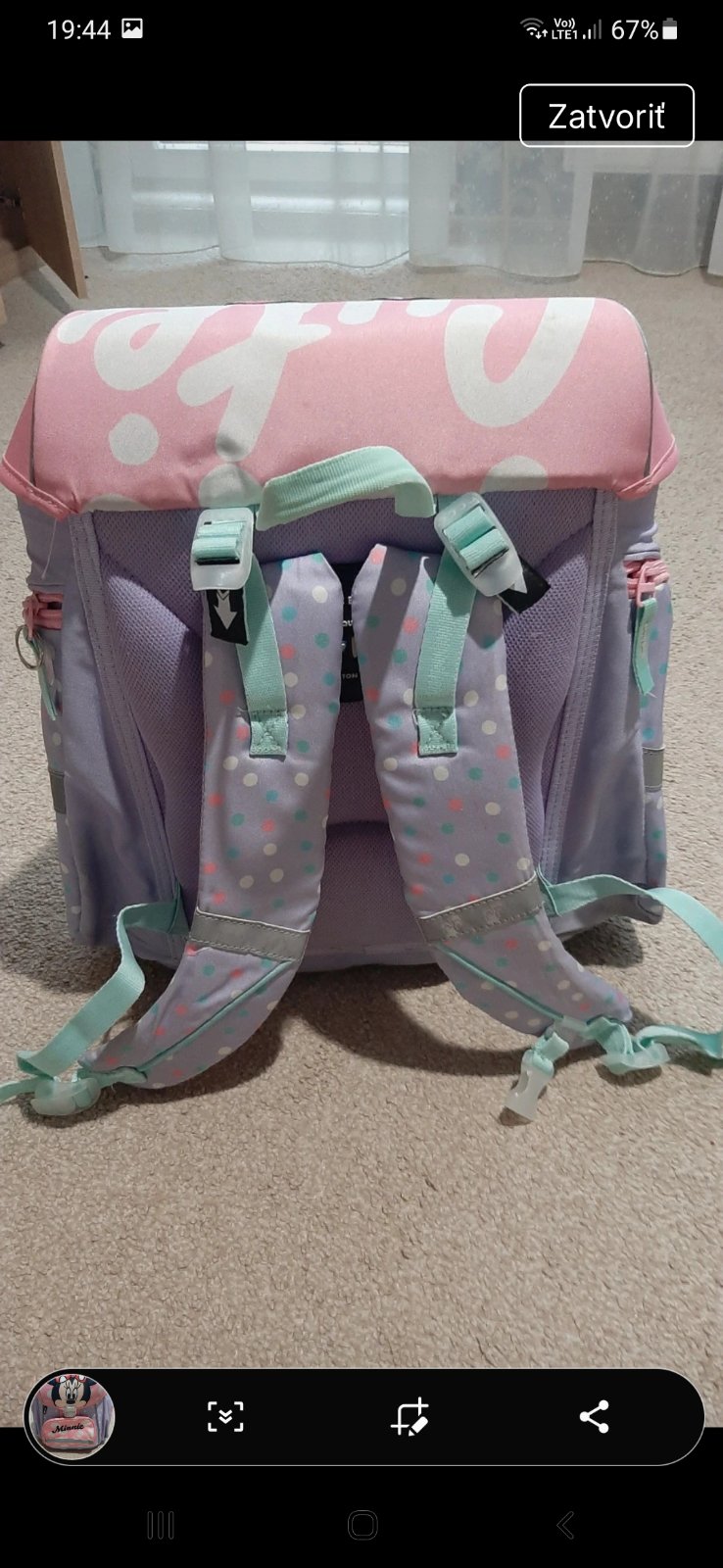 Ponukam na predaj pouzivanu skolsku tasku pre dievcata. Zvonku ma 3 vacky. Zozadu anatomicke tvarovanie s pachmi. Bezne znamky pouzivania.