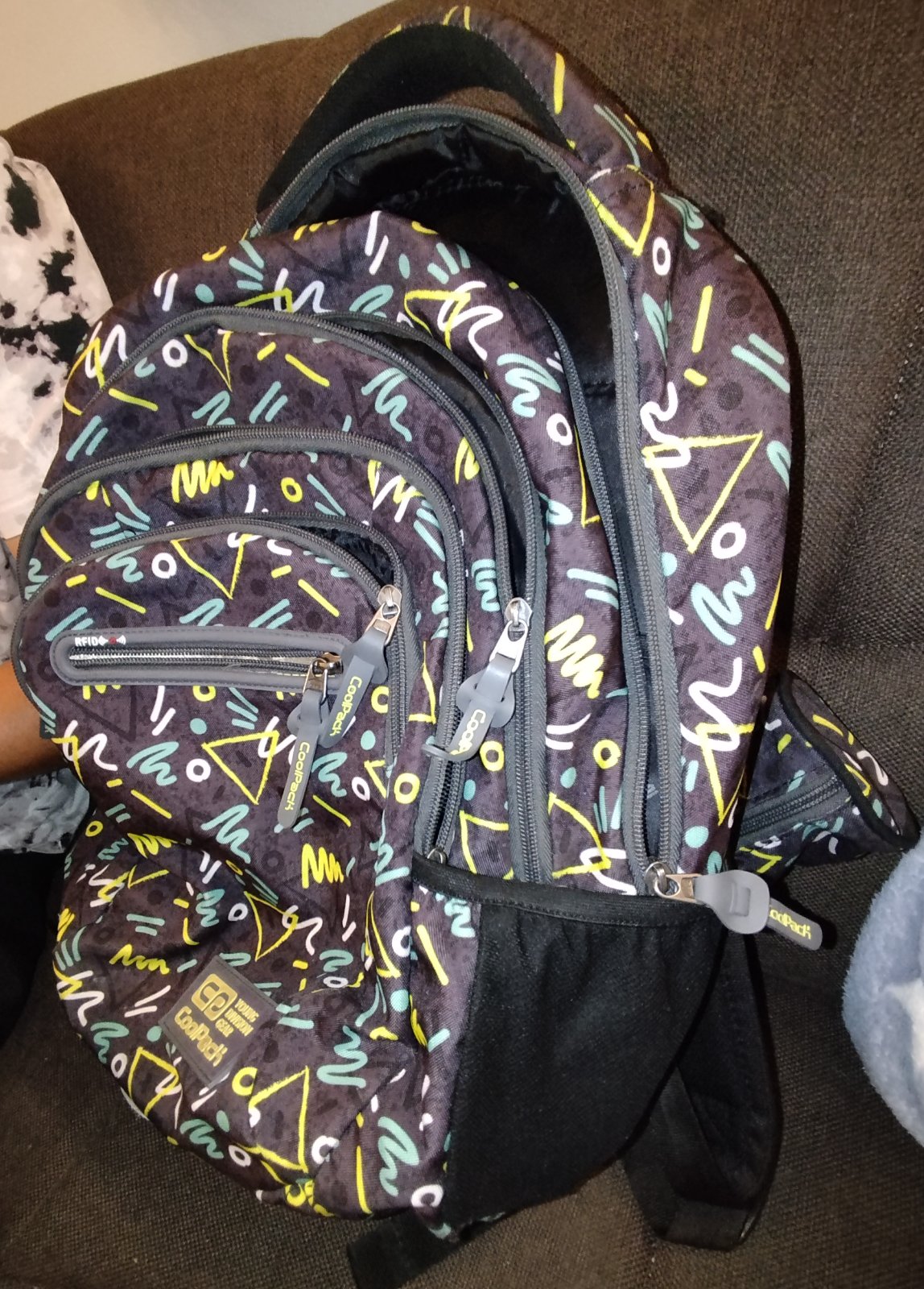 Super školská taška/batoh, využitý len 1 tok. Má 6 priestorov,ktoré sa spredu dajú odzipsovať. Po bokoch kapsy na fľaše. Vystužený a ergonomicky tvarovaný chrbát, ramienka sa dajú uťahovať. Peračník má 3 kapsy.