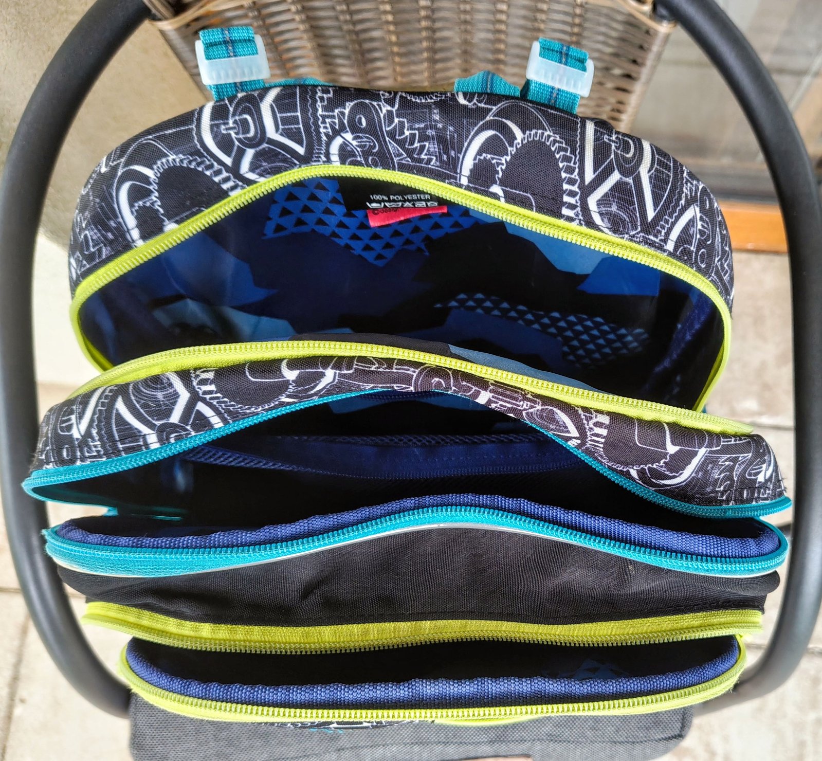 Zadná a stredná komora je širšia - odporúčame k chrbtu dávať najťažšie učebnice alebo dosky na zošity. V strednej komore je umiestnené ešte malé sieťované vrecko na zips a menovka. Predná komora je o niečo užšia, vhodná na desiatový box.