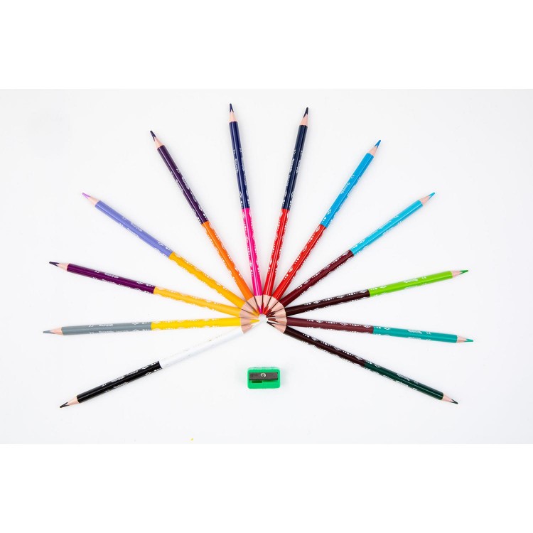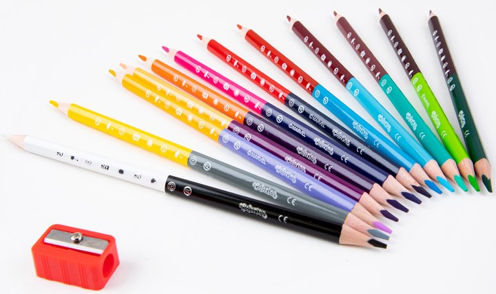 Toto balenie obsahuje 12 kusov tenkých 3-hranných farebných ceruziek na kreslenie, ktoré sú ľahko uchopiteľné pre detskú rúčku. Na každom konci ceruzky je iná farba, takže spolu sa dá kresliť až 24-mi farbami čo je praktické pre uloženie farebných ceruziek do školského peračníka. Farebné ceruzky sa dajú ľahko strúhať (strúhatko je súčasťou balenia), farebná tuha vo vnútri každej ceruzky je tvrdá.