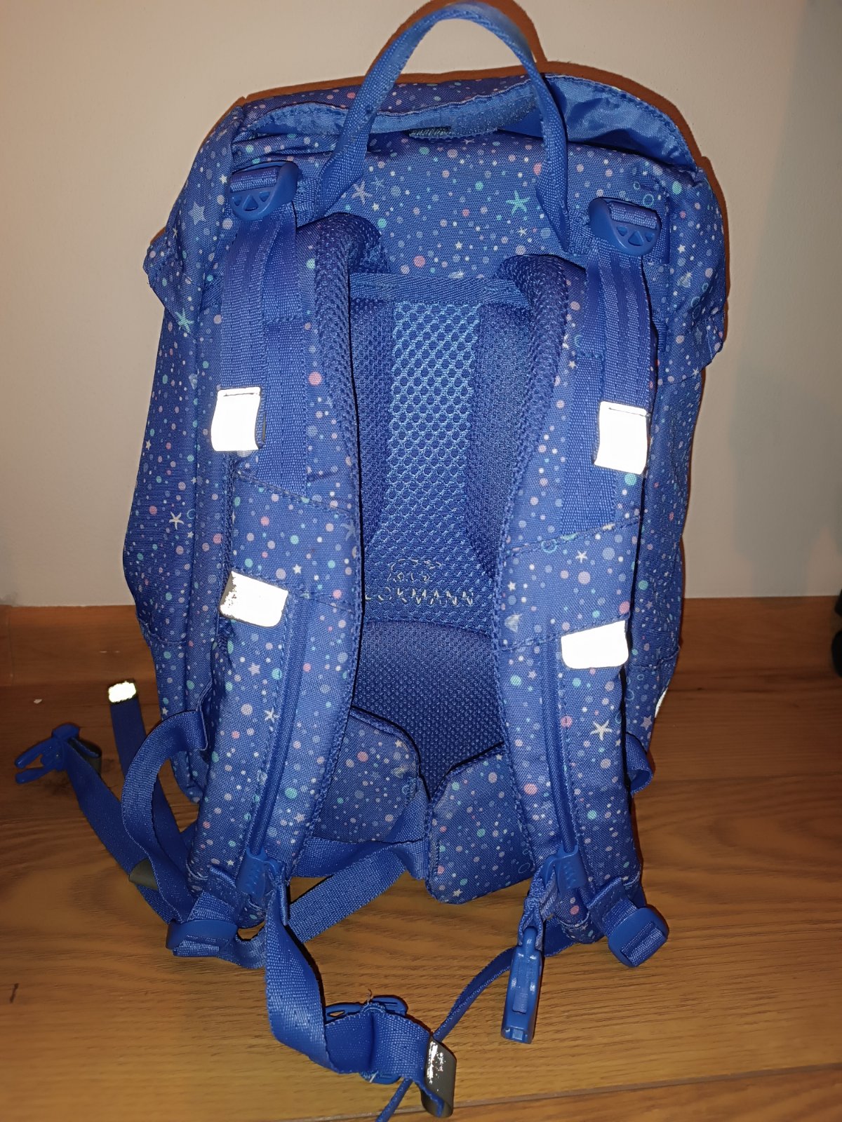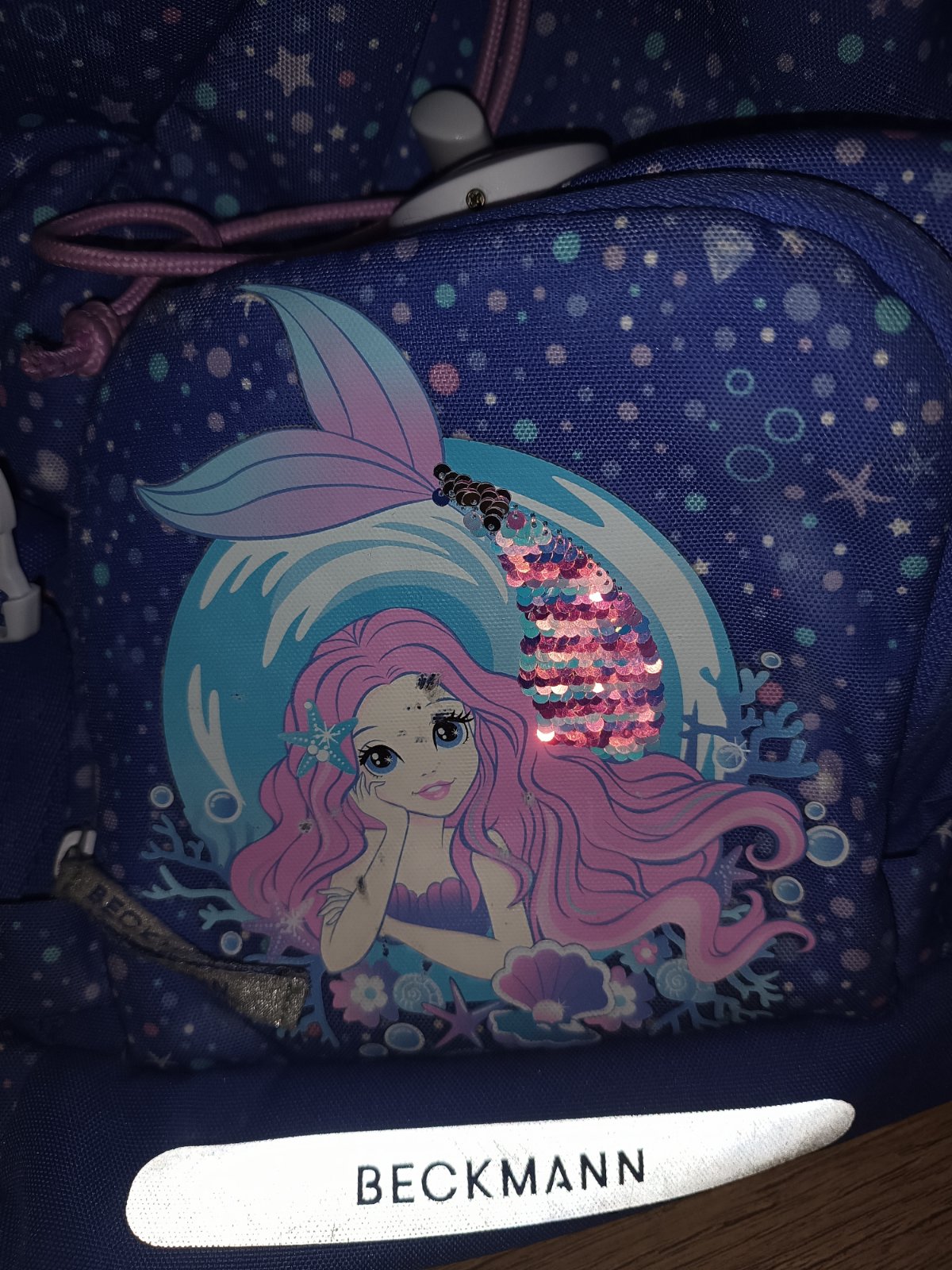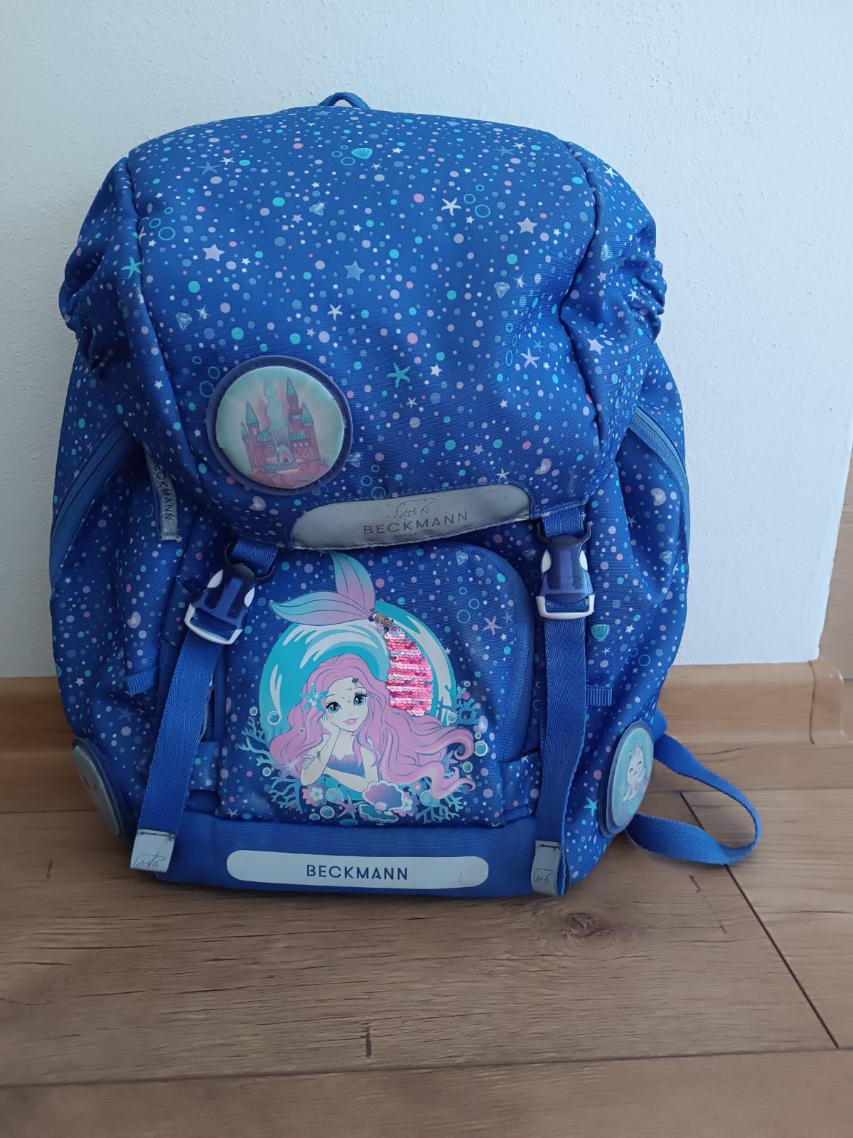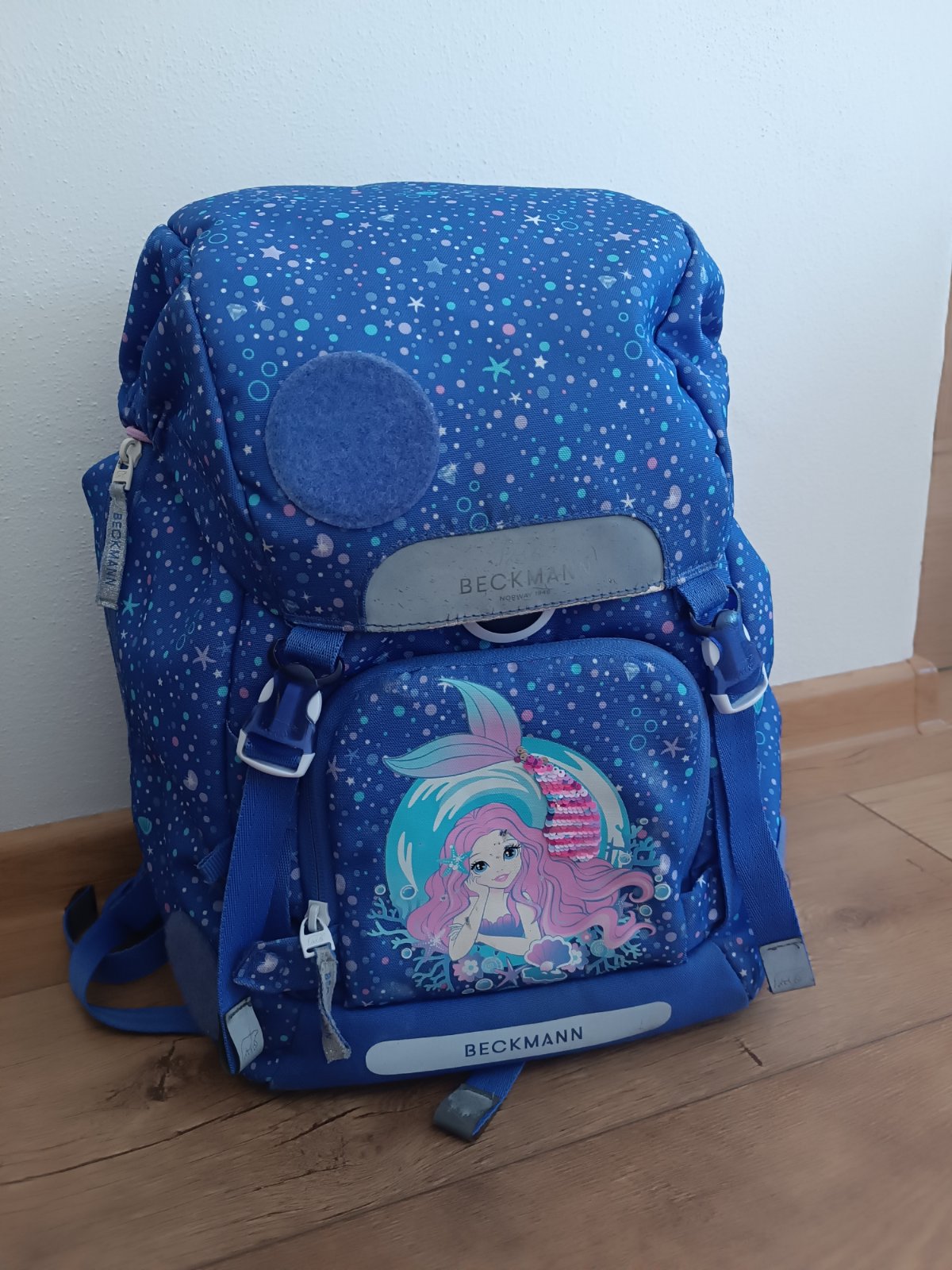 Školská taška značky Beckmann. Vhodná pre 1-3r. ZŠ. Používaná ale stále v dobrom stave. Jedna okrúhla nálepka na suchý zips je kus puknutá a svetielko už nesvieti ale inak je v super stave. Súčasťou je aj návlek na tašku proti dažďu.
