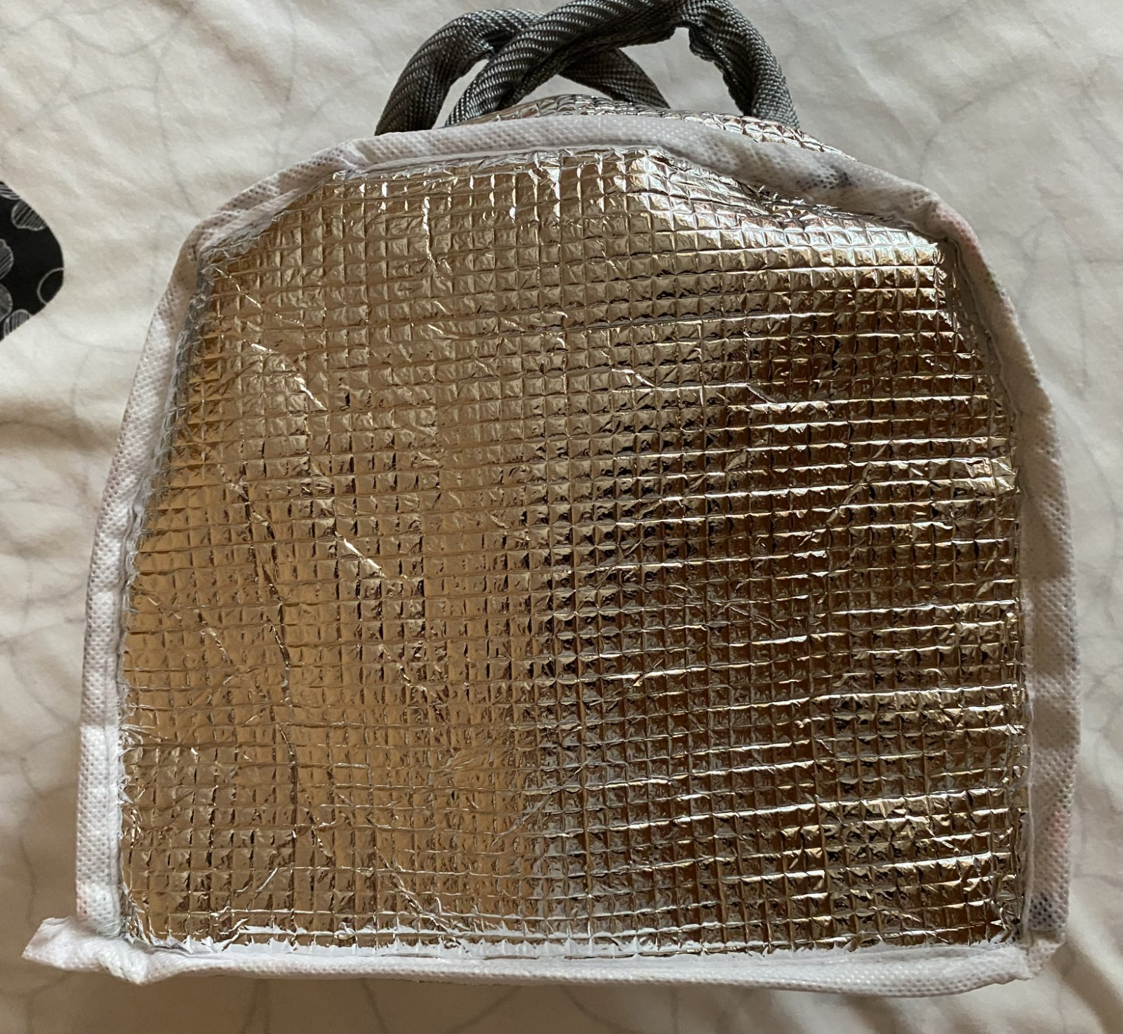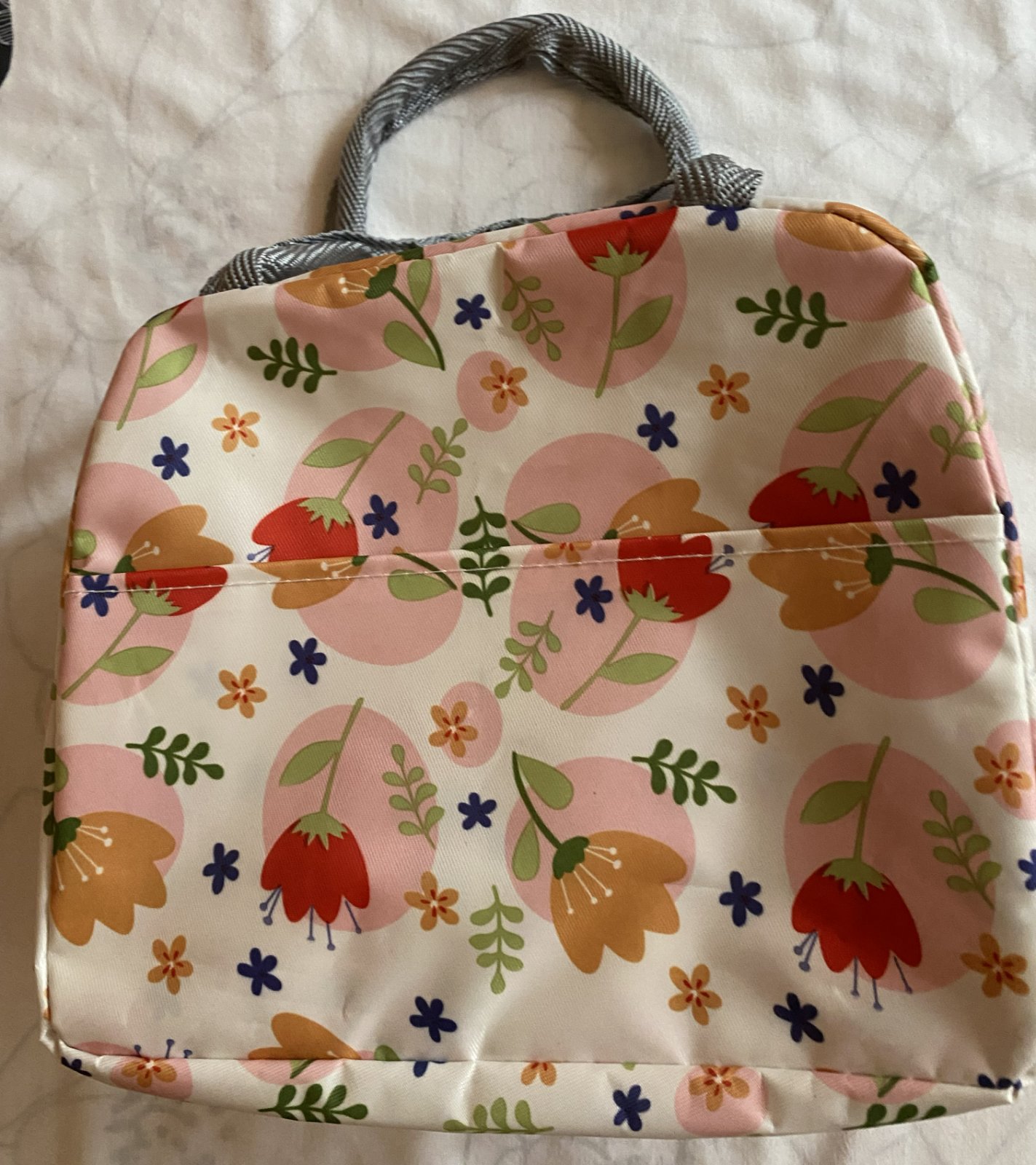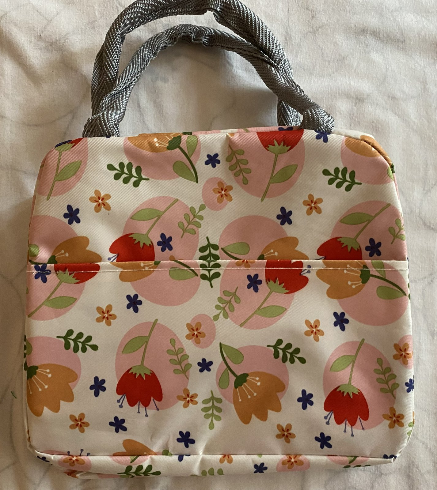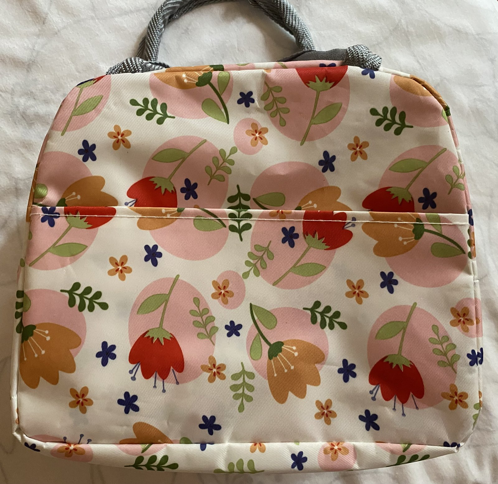 Detská termotaška na desiatu, vonkajšia vrstva umývateľný materiál, vpredu z vonkajšej strany vrecko, zapínanie na zips, vnútri má vrstvu termoizolačnej fólie, ktorá udrží potraviny dlhú dobu v správnej teplote a čerstvosti, raz použitá, v top stave. Miery: šírka: 22cm, výška: 16,5cm, hĺbka: 13cm + rukoväte.