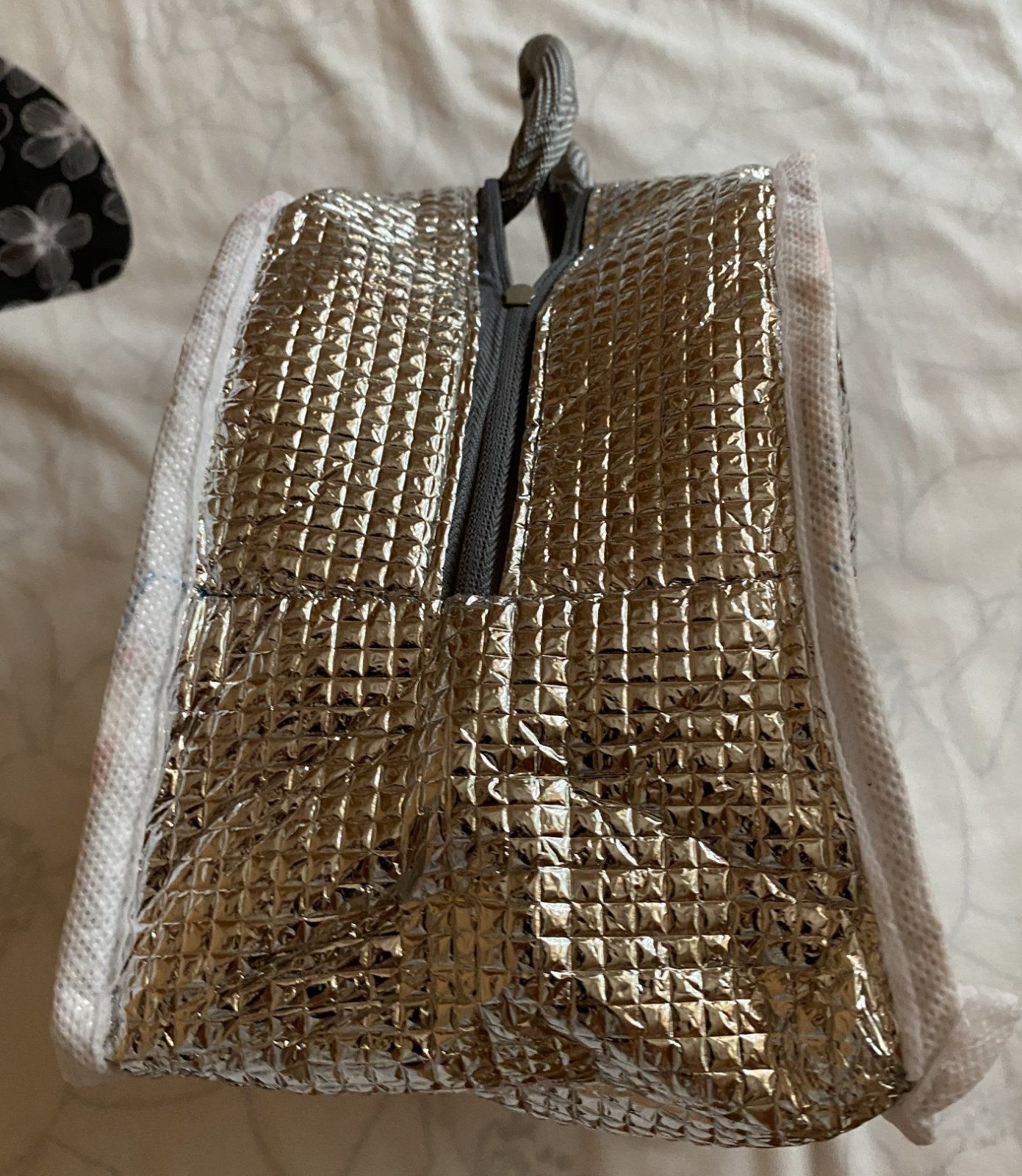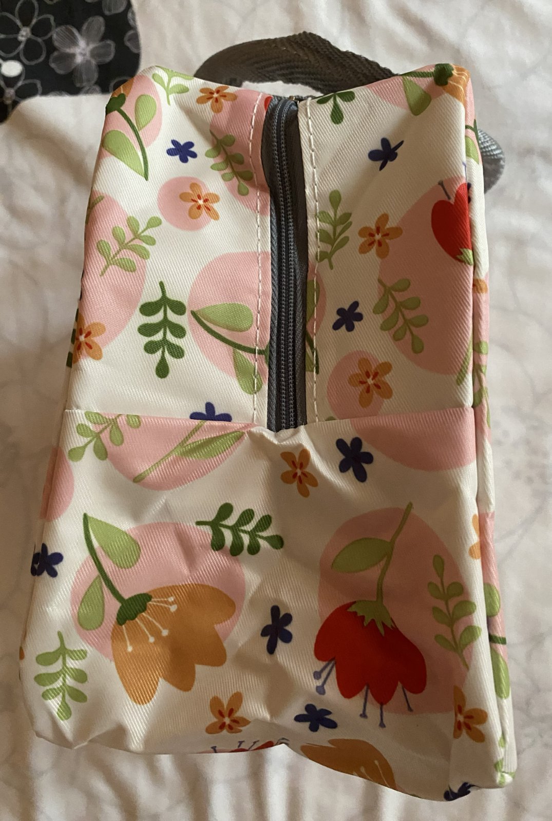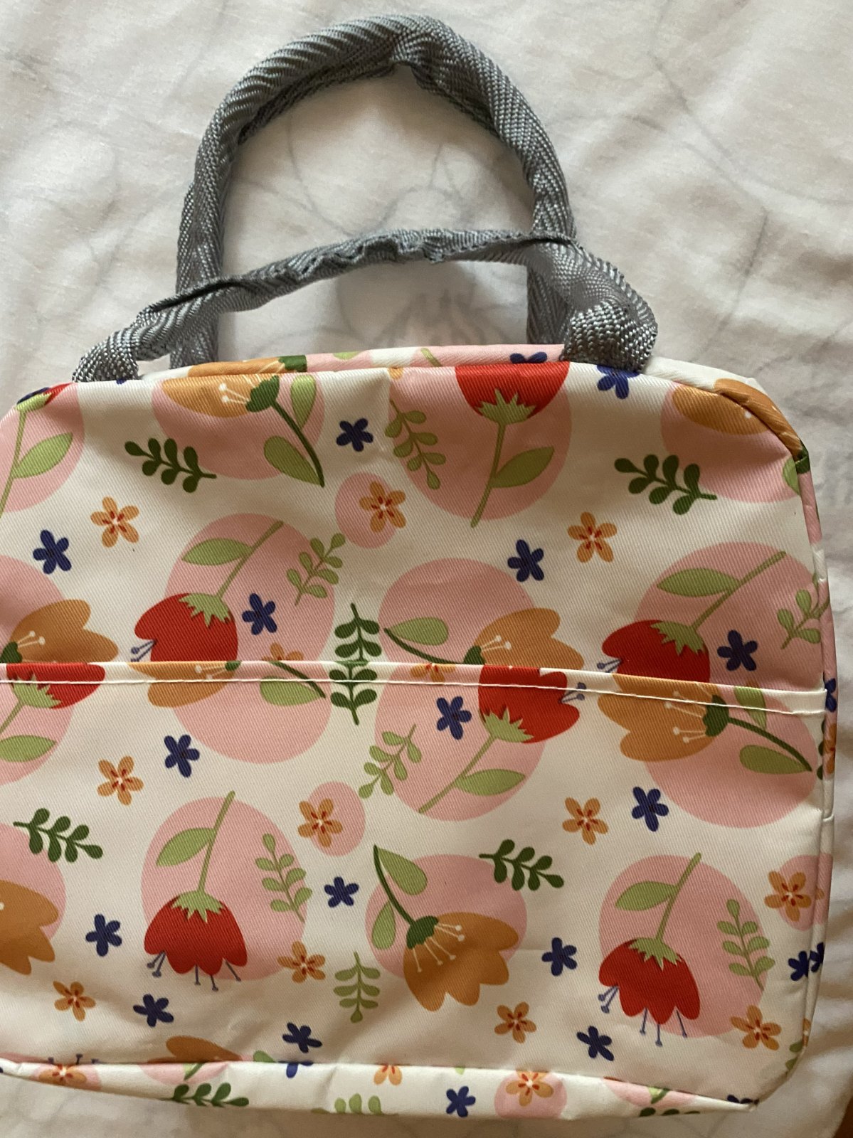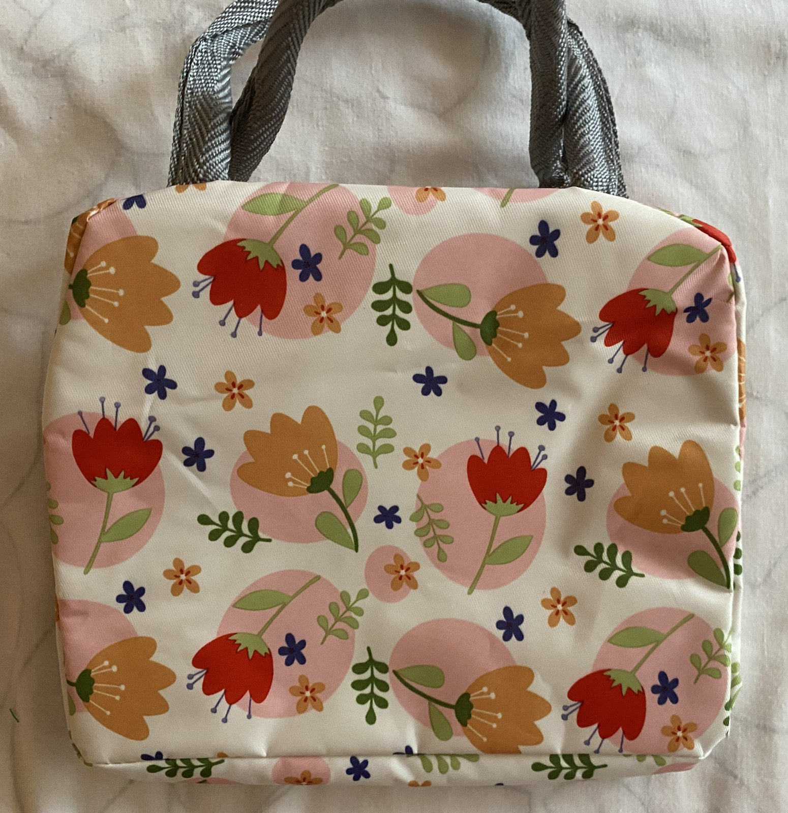 Detská termotaška na desiatu, vonkajšia vrstva umývateľný materiál, vpredu z vonkajšej strany vrecko, zapínanie na zips, vnútri má vrstvu termoizolačnej fólie, ktorá udrží potraviny dlhú dobu v správnej teplote a čerstvosti, raz použitá, v top stave. Miery: šírka: 22cm, výška: 16,5cm, hĺbka: 13cm + rukoväte.