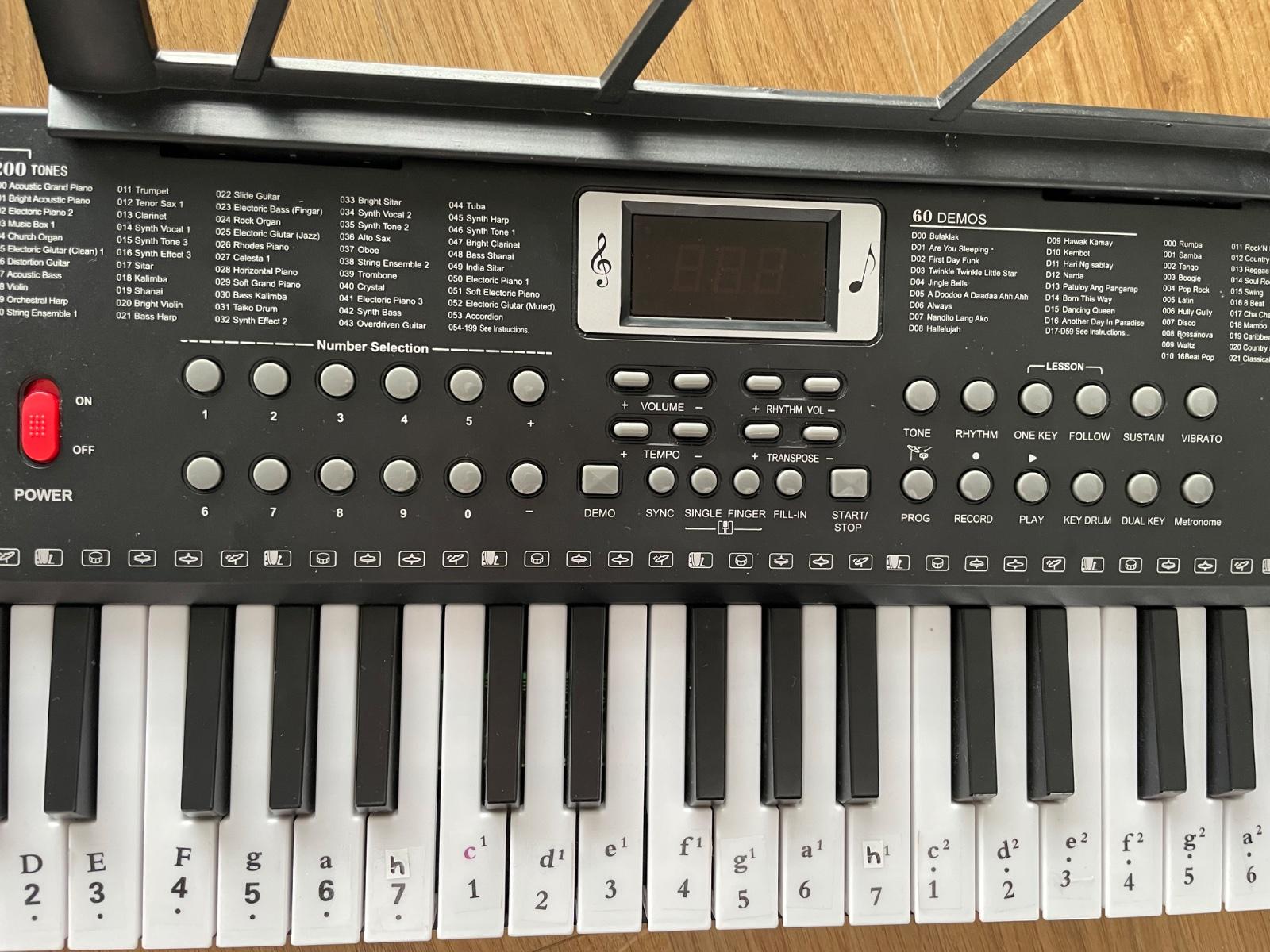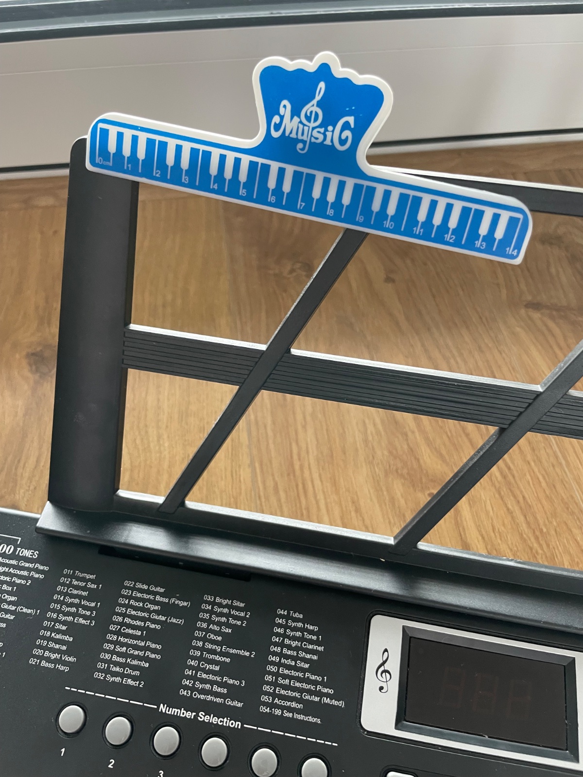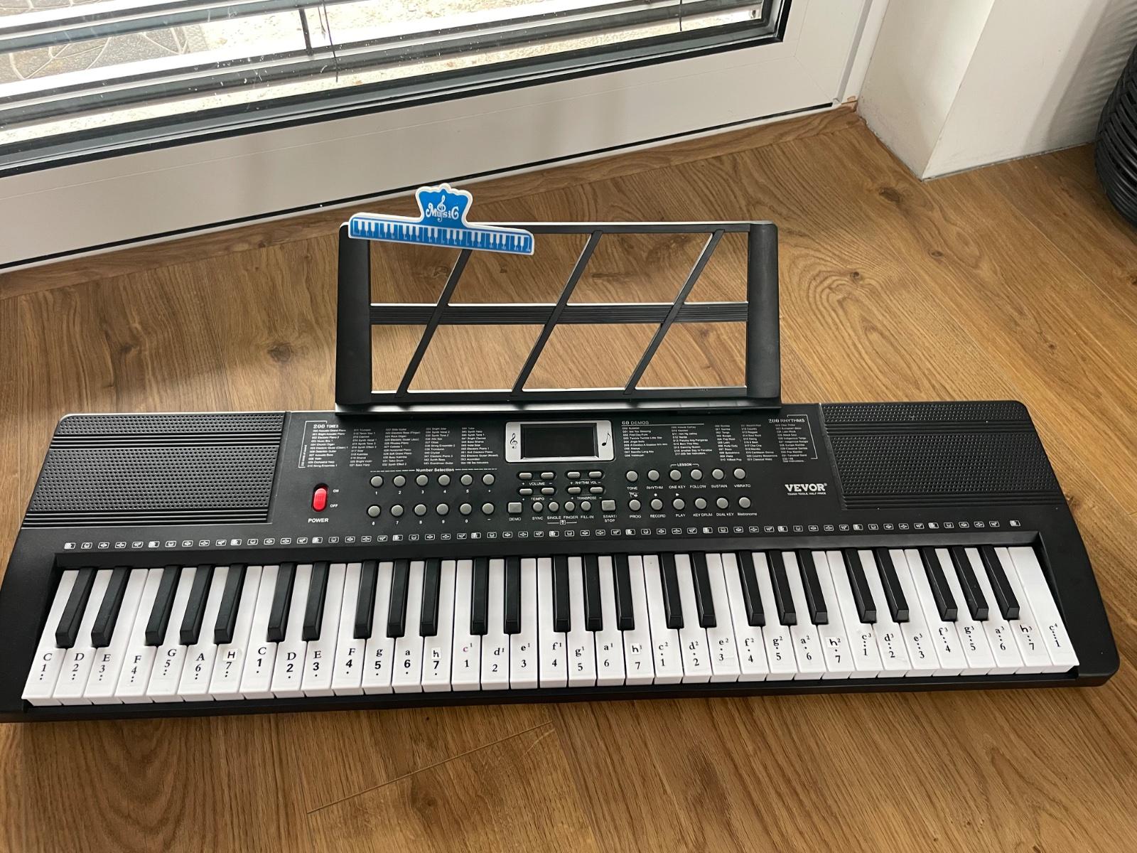Používaný asi 4 mesiace, perfektný stav. Na klávesoch sú nálepky, dajú sa dať dole, nám pomáhali(tón h je písaný ručne). Značka vevor. Nastaviteľná hlasitosť čo som veľmi ocenila, možnosť napojiť slúchadla aj mikrofón. 64 kláves. Vhodný pre prvý ročník ZUŠ pri hre na klavír. Dáva sa do zásuvky. Poštovné 5€.