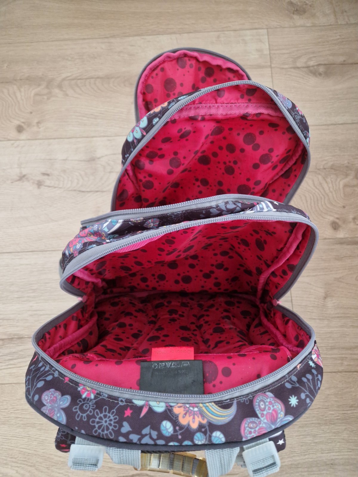 Používaná taška, veľmi pekná, ľahká, 3 komorova. Viď obrázky. Vnútorné sieťové vrecko -dierka ( z nožničiek alebo pravítka). Odtrhnuté pútko na zapnutie cez prsia. Zohladnene v cene. Podrobný popis na topgal.sk. PC 80e.