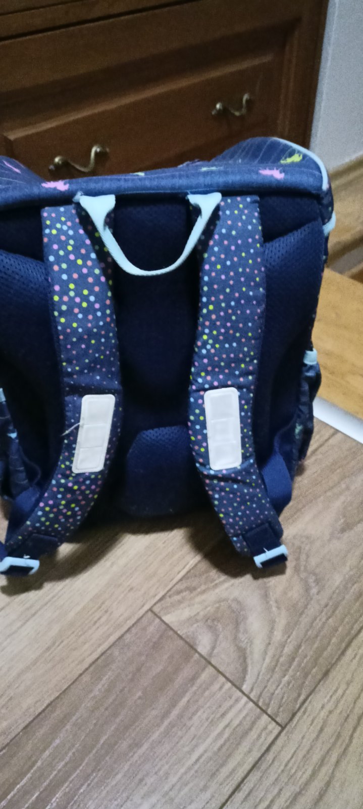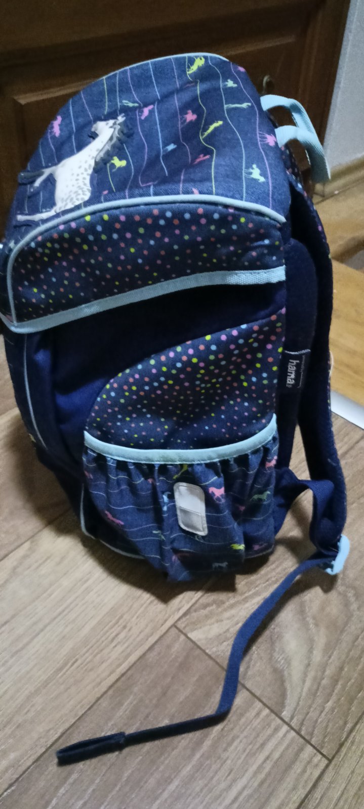 Predám zachovalú školskú tašku. Farba modrá, s koníkmi +reflexné prvky. Na obidvoch stranách sú vrecká na fľašu a podobne. Vo vnútri je jedno malé vrecko, jedna malá priehradka, priestor na menovku alebo rozvrh a dá sa stiahnuť šnúrkou. Pôvodná cena bola 70e, teraz predávam za 19 e.