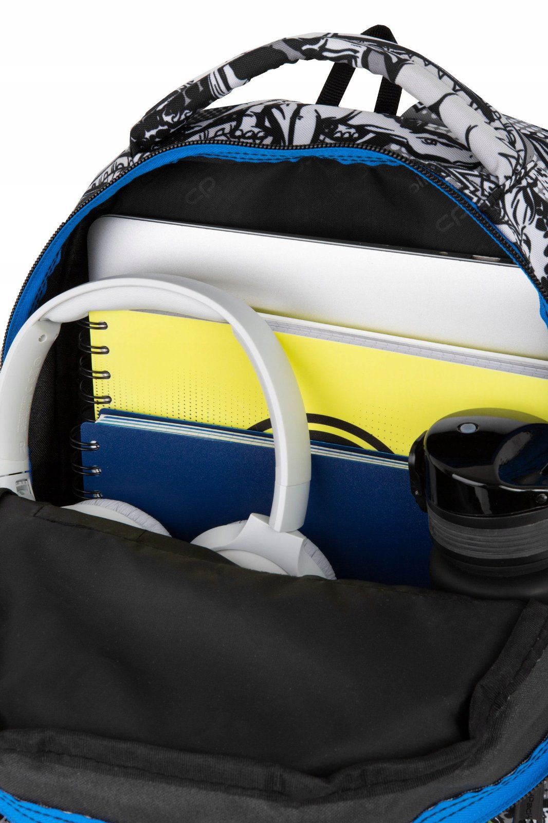 Prostorný batoh kde se pohodlně vejdou složky formátu A4 má dvě hlavní komory a přední velkou kapsu.