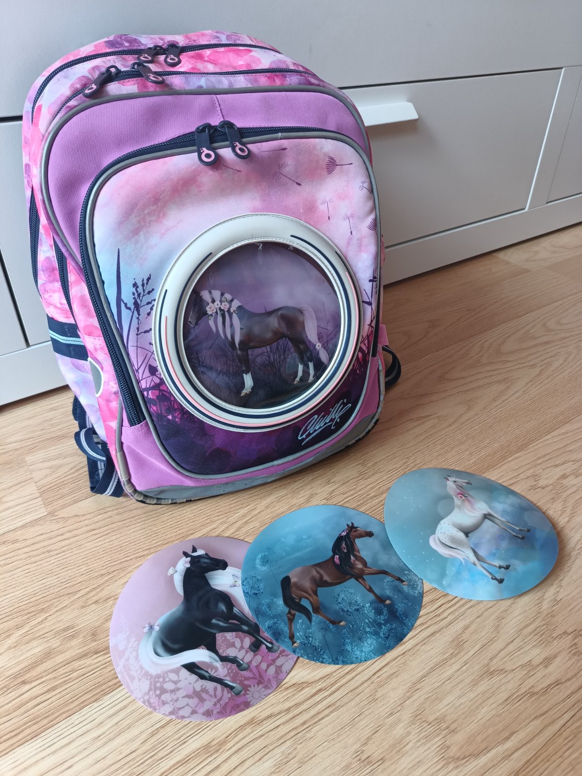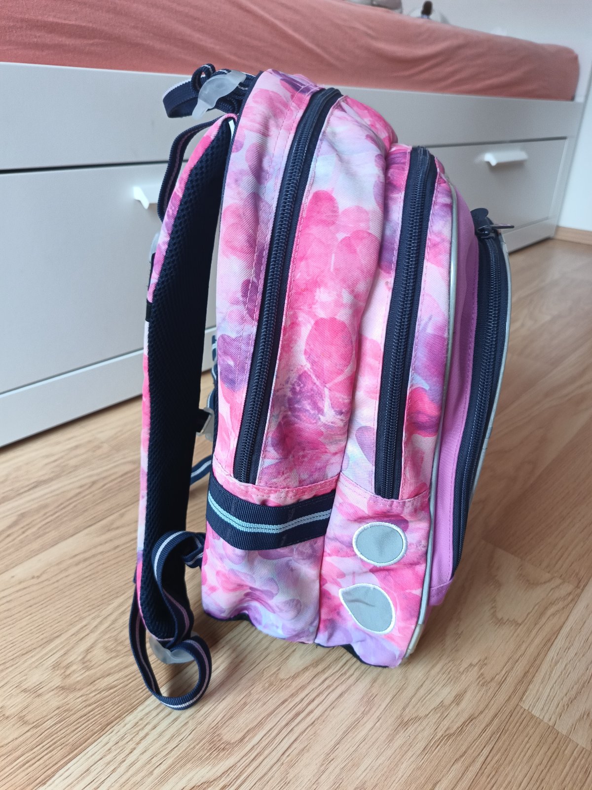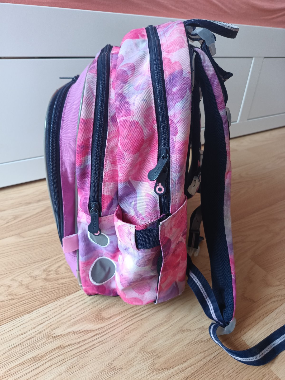Predám školskú tašku Topgal Endy, výborný stav, kupovaná nová, vyčistená, vhodná pre prvý stupeň. Hmotnosť do 1kg, rozmery udávané výrobcom (v x h x š): 39x19x28 cm, objem 21 l, ergonomická chrbtová časť, pevné dno. Na konci popruhov sú magnetky, obsahuje bočnú kapsičku na fľašu, v strednej komore je sieťovaná kapsička na zips, v poslednej komore je karabinka na kľúče. Drobné nedostatky sú nafotené. Veľmi praktická, dobre riešená, boli sme s ňou naozaj spokojní.