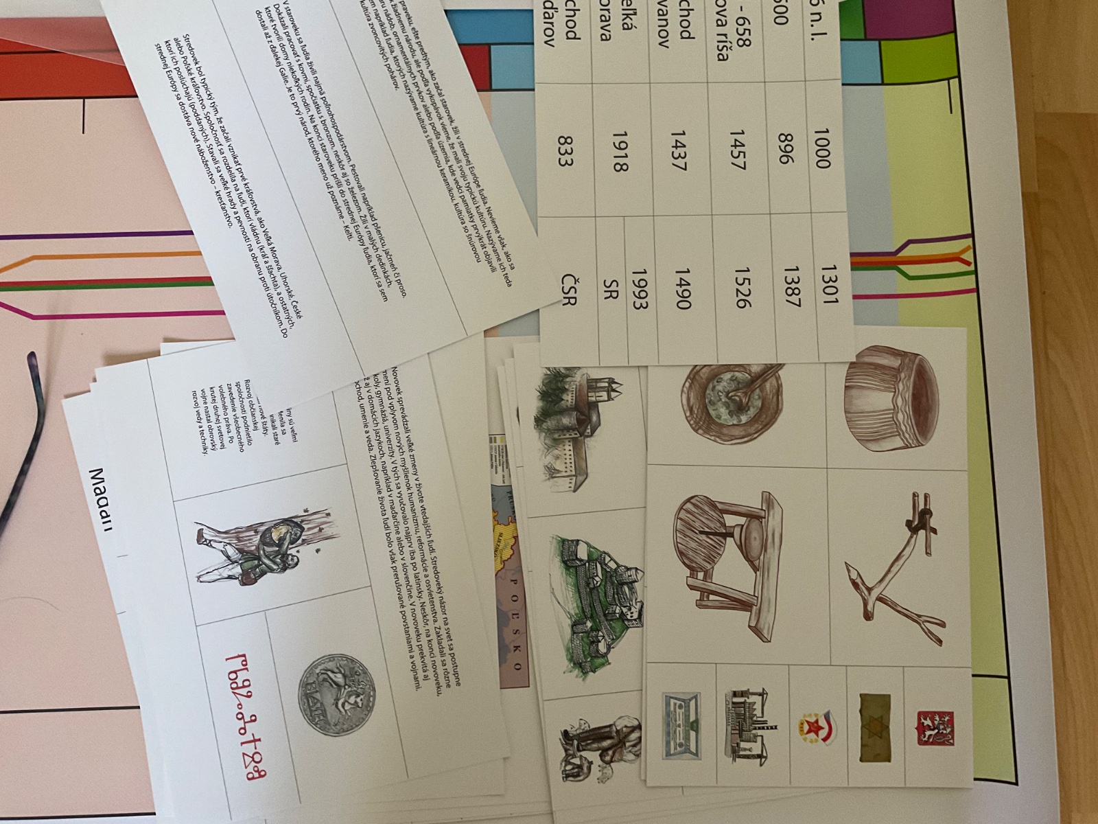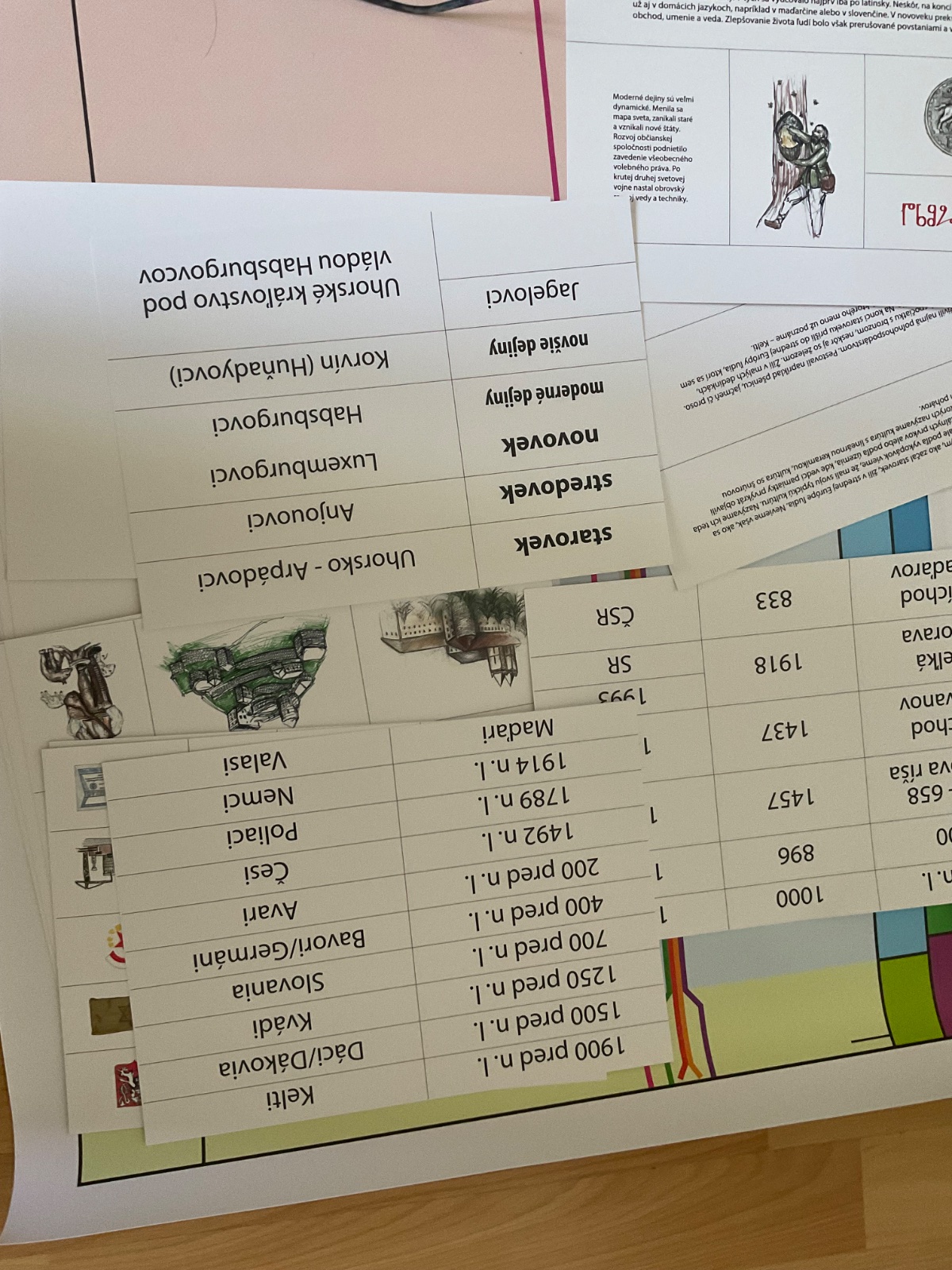 1x plná časová os s dátumami, obrázkami, textami, 1x prázdna časová os a k nej prináležiaci doplnkový materiál (dátumy, texty, obrázky), ktorý sa prikladá na prázdnu os.