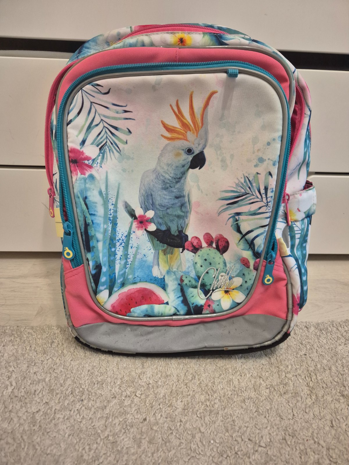 Krásna školská taška, dcéra ju nosila v 8 ročníku, na striedačku s inými taškami. Je v peknom stave, ako nová. Jedine na usku je odratá koža.