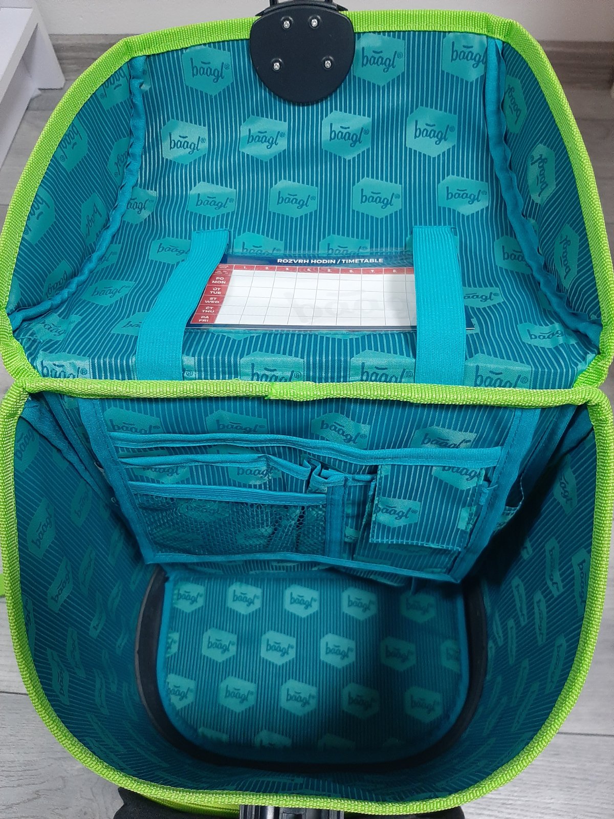 - Vo vnútri aktovky sa nachádza priehľadné vrecko na rozvrh hodín a vnútorný organizér, ktorý umožňuje rovnomerné rozloženie hmotnosti.