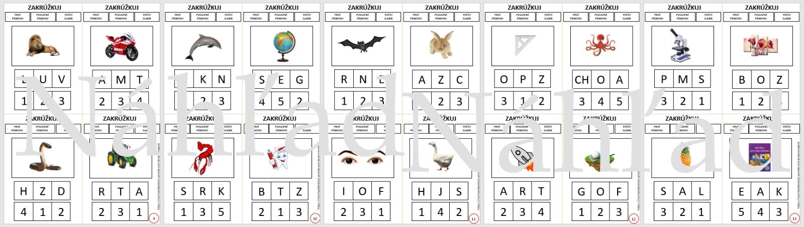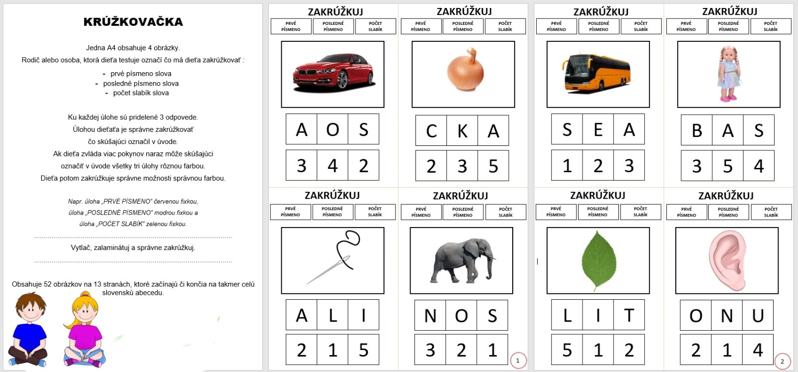 Dieťa sa naučí určiť : prvé písmeno slova ,posledné písmeno slova a počet slabík slova. Jedna A4 obsahuje 4 obrázky. Spolu teda 52 obrázkov na 13 stranách, ktoré začínajú či končia na takmer celú slovenskú abecedu. Súčasťou je aj pomôcka, ktorá obsahuje pomenovanie všetkých obrázkov rozdelených podľa strán. Ak dieťa potrebuje vidieť slovo tak odporúčam túto pomôcku rozstrihať a priradiť k obrázkom.