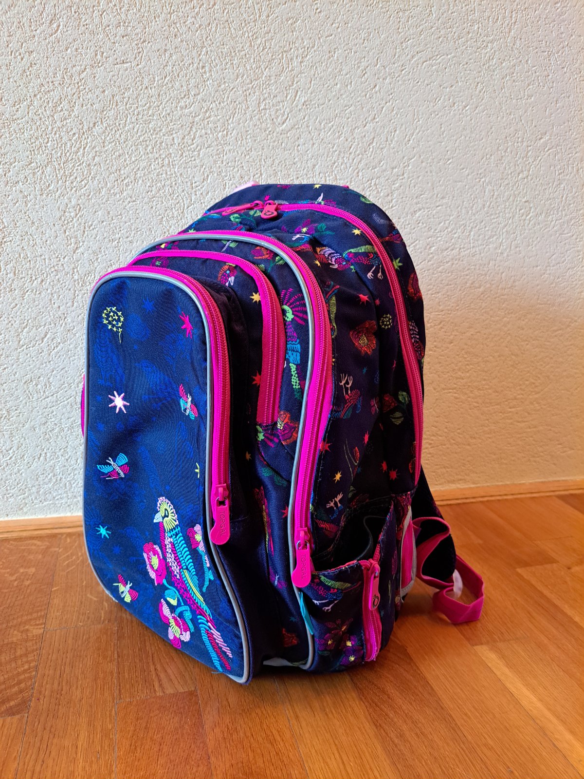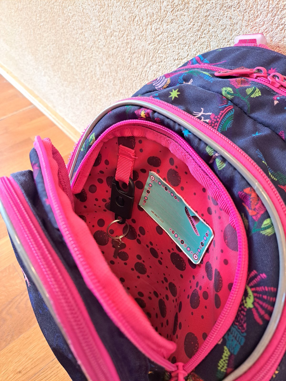Jedna priehradka na veľké zošity, druhá širšia na dosky, peračník, desiatu a dve užšie na drobnosti a osobné veci. Háčik na pripnutie kľúčov, bočný vačok na fľašu.