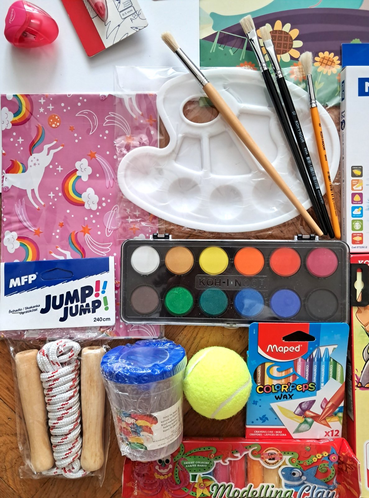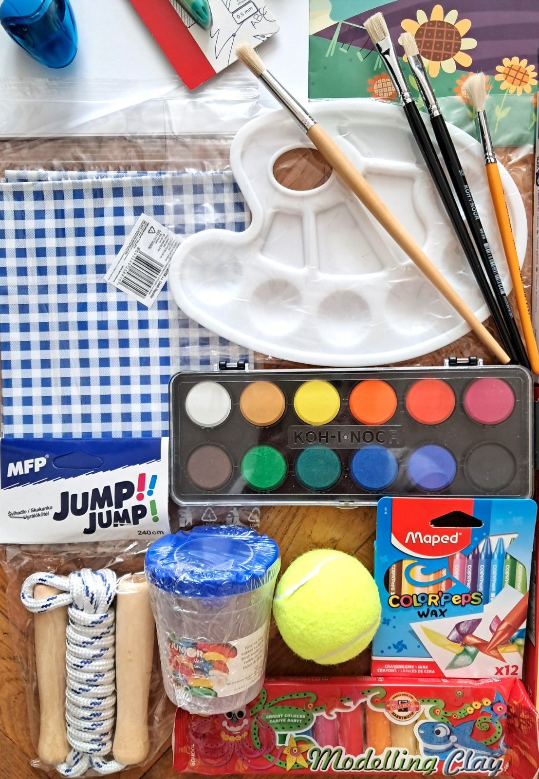 Kompletný balík školských potrieb pre 1. ročník. Kvalitné pomôcky, farbičky, ktoré farbia, lepidlo, ktoré lepí a nožnice, čo sa nerozpadnú za dva dni. Vrátane loptičky a švihadla s drevenou rúčkou (a lanom, nie ten plastový nezmysel, cez ktorý sa ani nedá skákať).