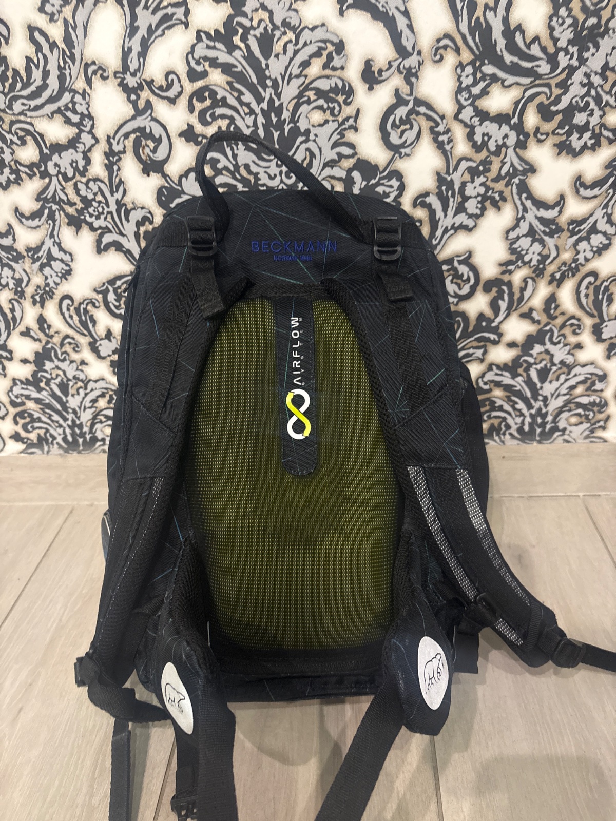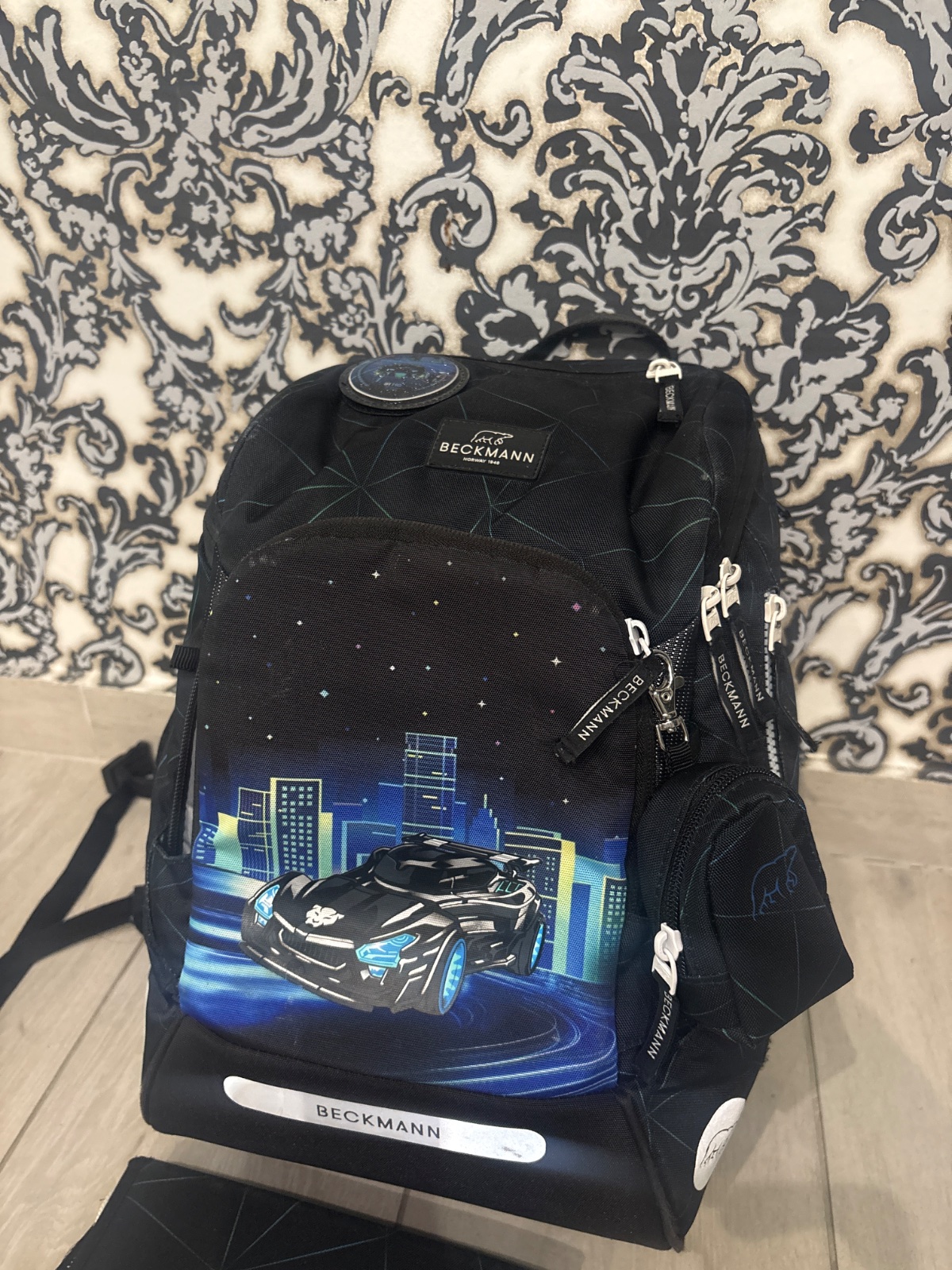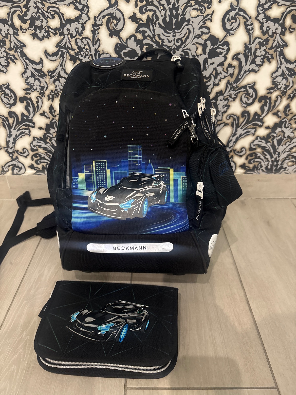 Skolska taska super stav, oblubena a kvalitna znacka Beckmann, peracnik aj desiatovy box s tym istym motyvom pribalim. Vhodna od 1-4 rocnika ZS. Male poskodenia - dve male suchnutia vpredu na hornom vrecku, je to vidno na fotkach a dve dierky na sietke kde sa dava flasa s vodou- da sa zasit.