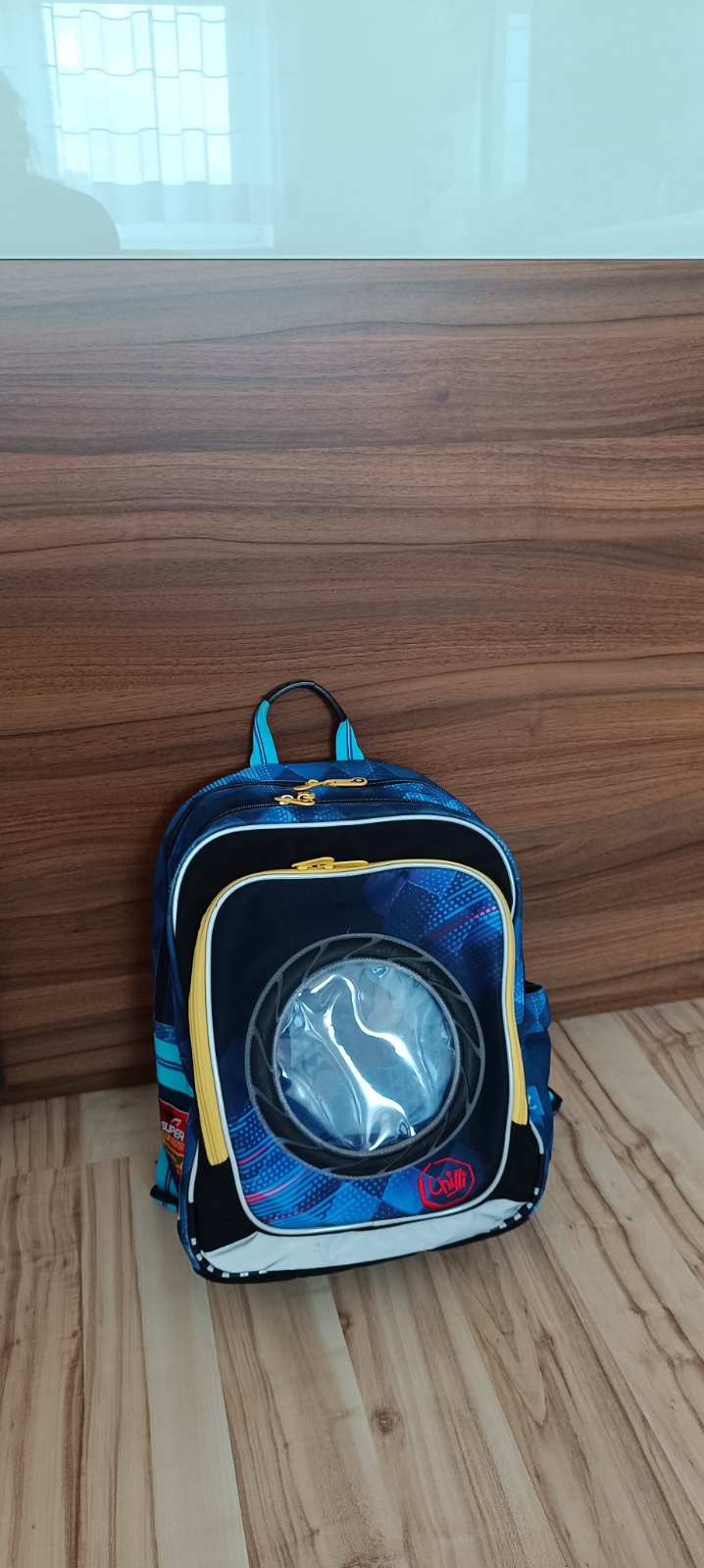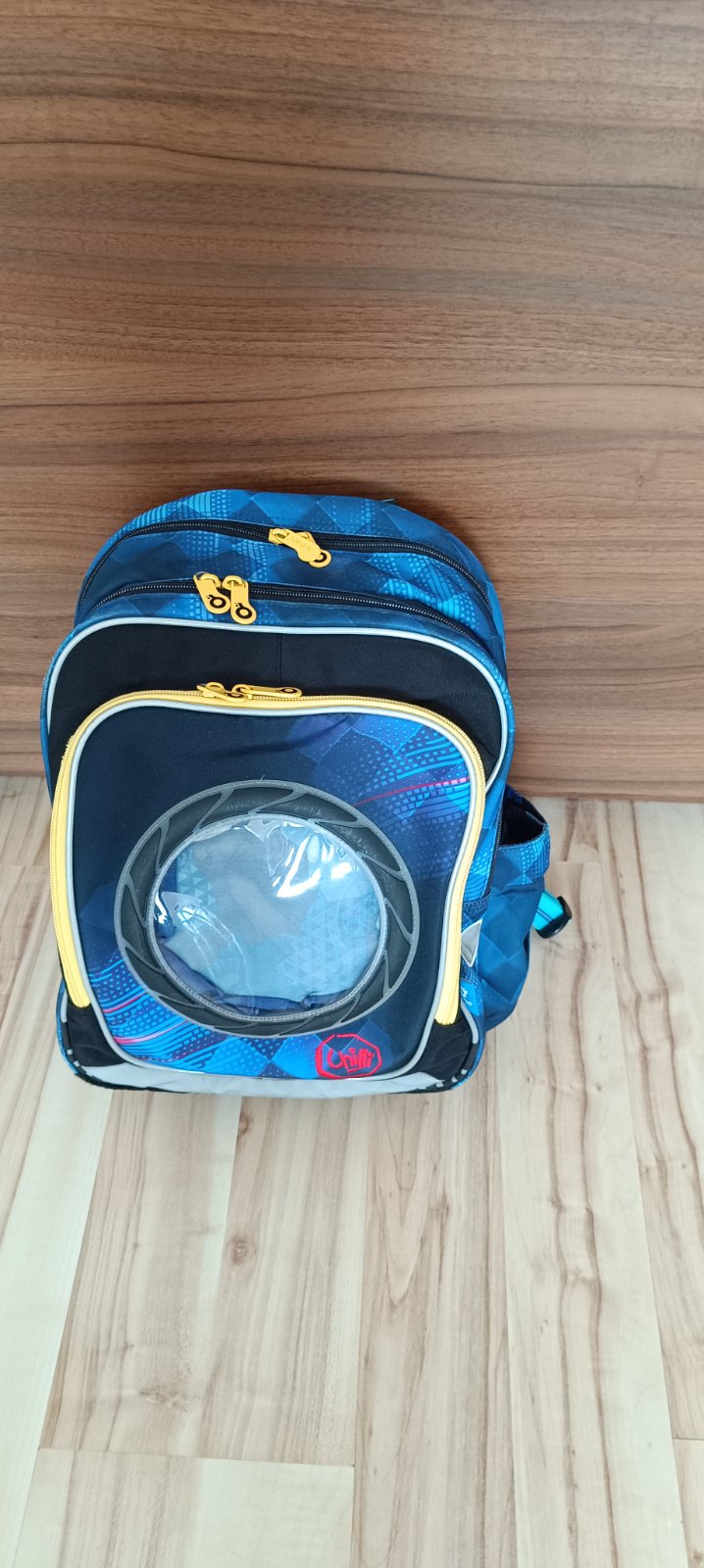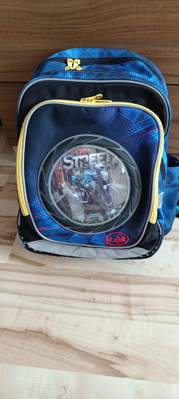 V prednom vrecku má schované priehľadné vrecko so 4 rôznymi obrázkami s motorkami (na fotosu 3 plastové obrázky motorky ,ale mám aj 4 obrázok) , ktoré si môže meniť podľa ľubovôle, alebo si tam dať obrázok napr. svojej vlastnej motorky ... dvojkomorový batoh s veľkým predným vreckom, súčasťou sú 4 vymeniteľné obrázky motoriek pevný lisovaný chrbát a nízka váha 0,98 kg! Chrbtový systém je vďaka anatomicky tvarovanej lisovanej pene ultraľahký. Aj na chrbte malého školáka bude batoh sedieť ako uliaty. Ramenné popruhy sú polstrované, ergonomicky tvarované a hlavne - dajú sa utiahnuť v hornej i spodnej časti batohu. Výškovo nastaviteľný hrudný pásik zabezpečí, že popruhy nebudú schádzať ani z drobného chrbta. Najťažšie školské potreby dávajte vždy do zadnej komory. Tá je širšia ako predná a pojme všetko potrebné do prvých tried ZŠ. Predná, užšia komora unesie všetko ostatné a navyše v nej určite využijete praktické sieťové vrecko na zips. Menovka ( taktiež nepoškodena )ukrytá v prednom vrecku nad sieťovým vrecúškom pomôže batohy rozoznať.keď sa v triede stretnú dva rovnaké. Ten ľahko umiestnite do prednej komory alebo do predného hlbokého vrecka, kde určite oceníte aj odnímateľnú karabínku na kľúče. Pre fľaštičku na pitie je vrecko na boku batohu. Batoh má Reflexné prvky Presvedčiť sa môžete na detailných fotkách, kde je batoh nafotený s bleskom a vidieť reflexné prvky , pútko na prenášanie batohu v ruke a pútko na lavicu.