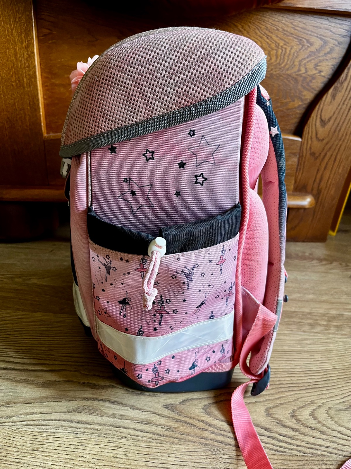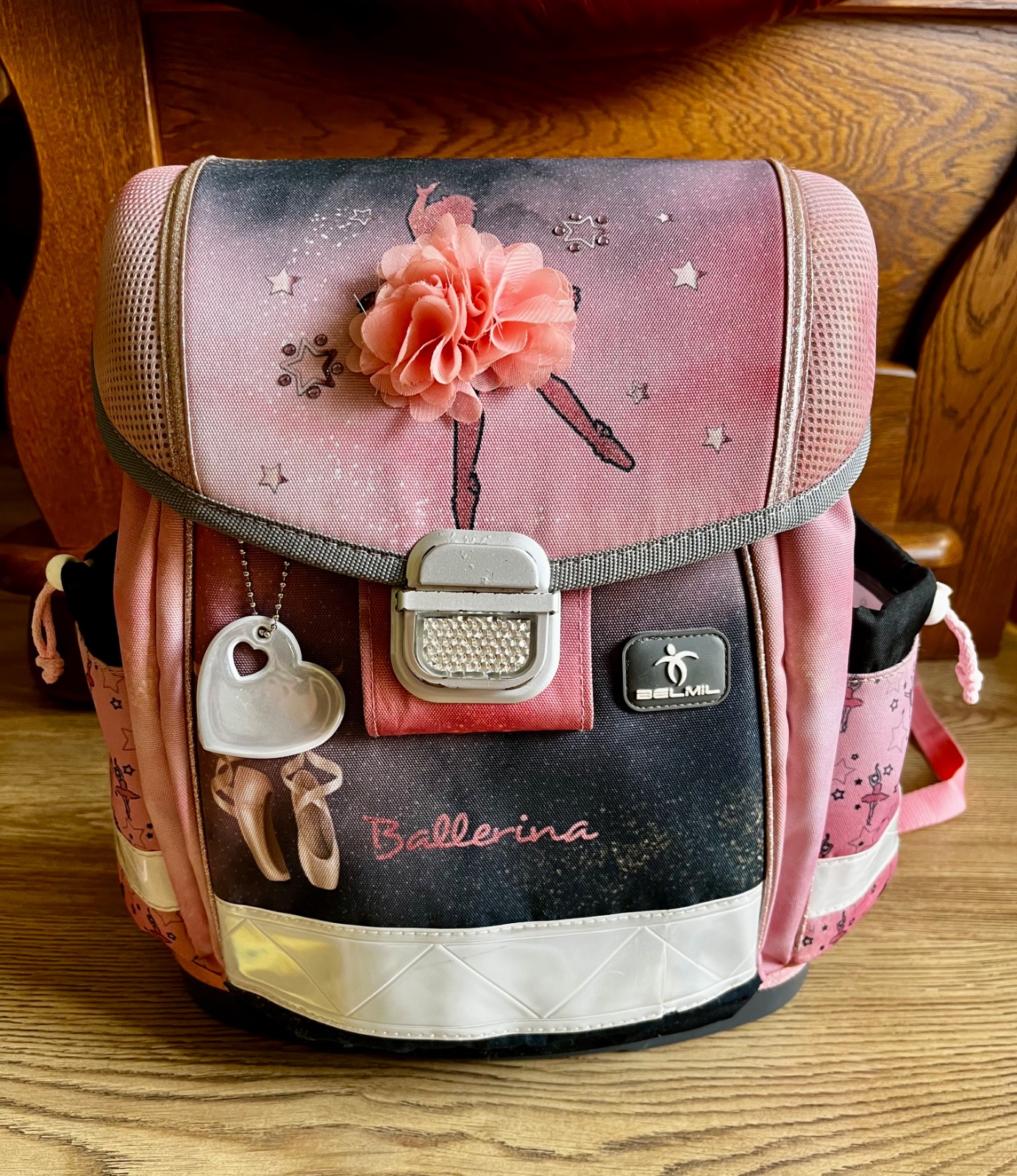 Veľmi dobrý stav, používaná necelý rok. Školská taška s motívom Ballerina Black Pink, peračnik a vrecko na telesnú výchovu.