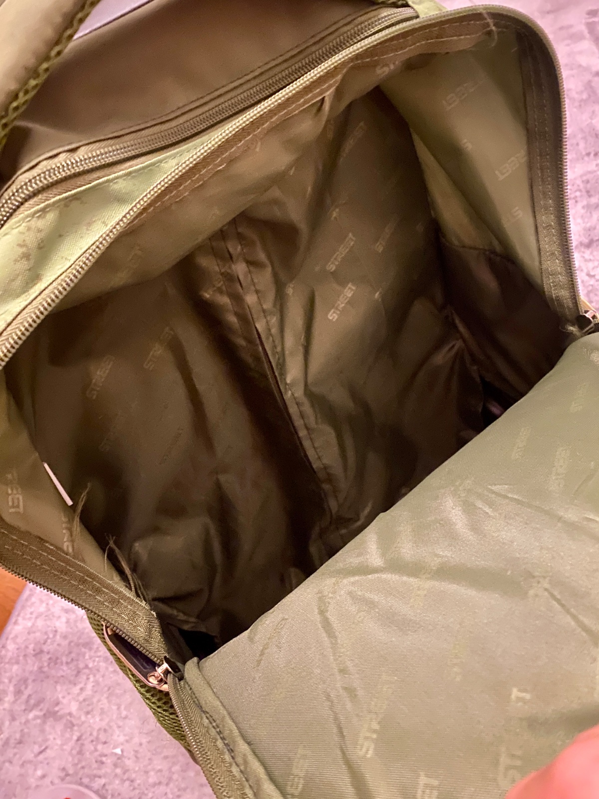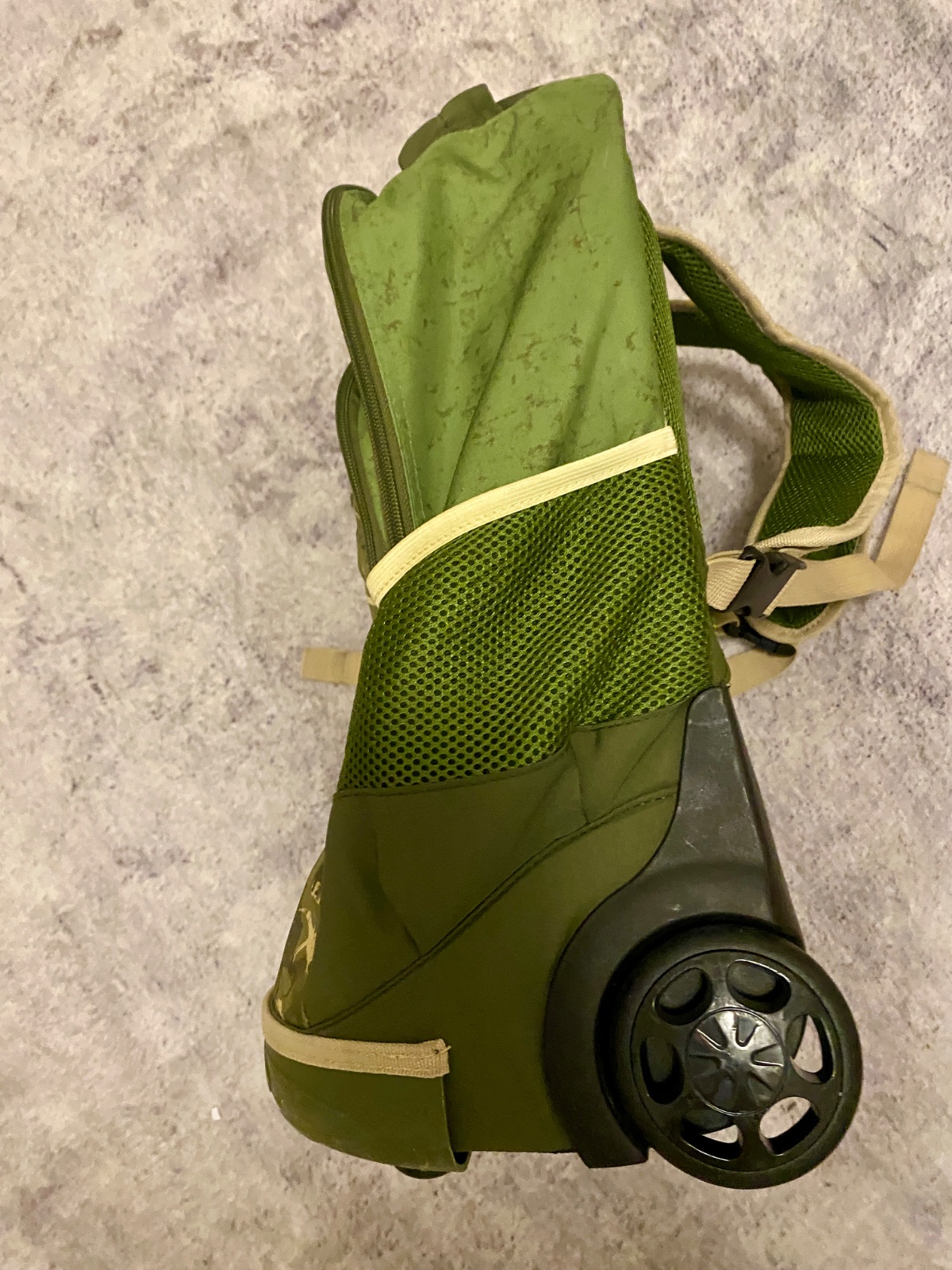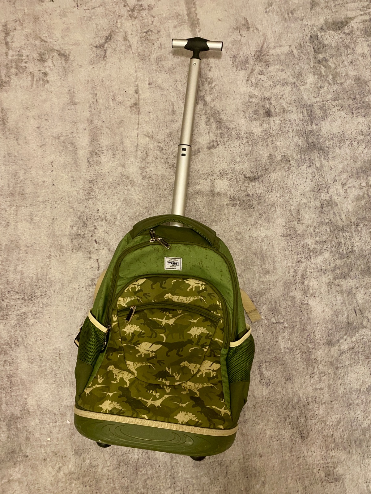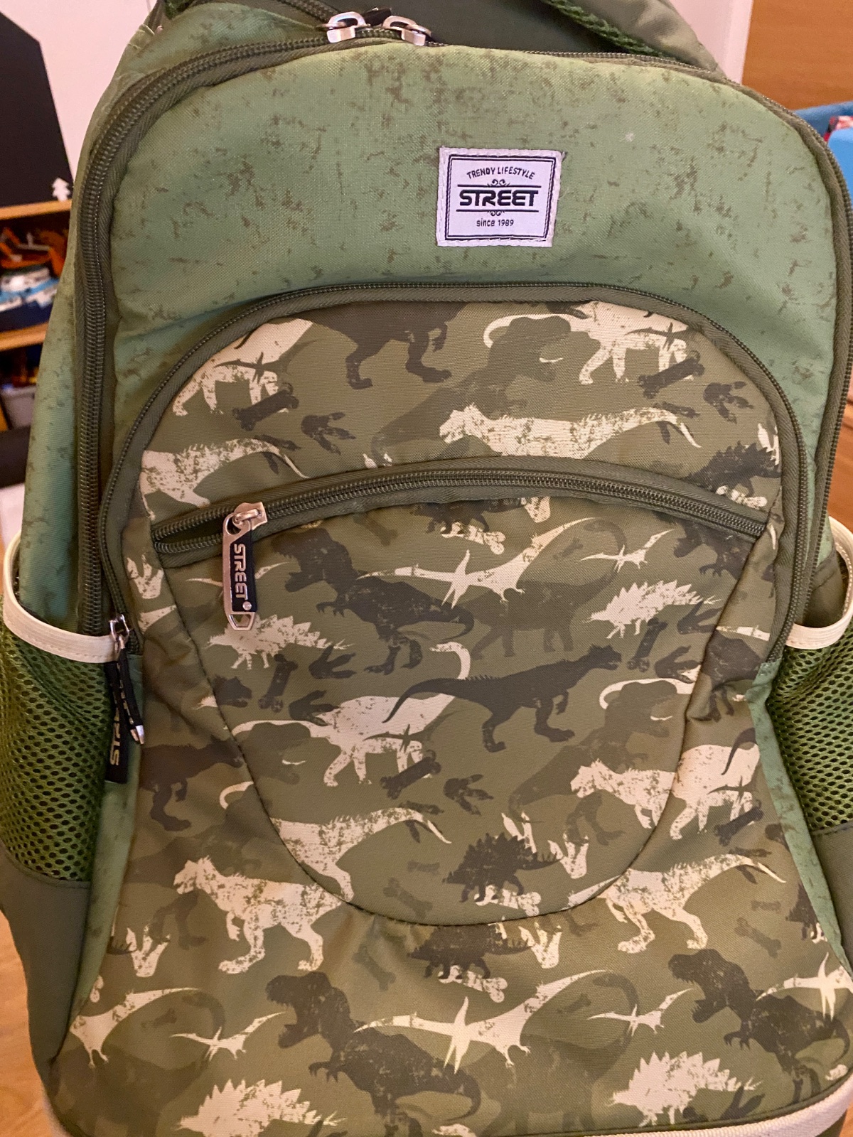 Školská taška na kolieskach v obľúbenom motíve Dinosaury od výrobcu Street pre všetkých Dino fanúšikov. Školský batoh je určený pre deti do 1.-4. triedy. Exkluzívne batoh môžu vaše deti nosiť do školy alebo na voľný čas. Hmotnosť tašky je 1,8 kg a objem 36l. Na čelnej strane batohu je vrecko na zips, pričom vo vnútri má dve veľké vrecká uzatvárateľné zipsom a ďalšie na drobné predmety. V najväčšom vrecku sú z každej strany umiestnené dve priehradky na uloženie väčších vecí. Na batohu sa nachádzajú aj dve bočné vrecká, kde môžete umiestniť fľašu na pitie alebo drobnosti. Ergonomická, pohodlná vysúvacia rukoväť, vďaka ktorej je možné batoh tlačiť pred sebou, alebo ho ťahať za sebou. Batoh je na spodku vybavený tichými kolieskami. Rozmer: 47x34x22cm Používali sme veľmi málo nakoľko sme mali viacero tašiek. Taška je krásna a pohodlná, pre ťažšie a väčši množstvo predmetov. Bez poškodení, plne funkčná, ako nová. Pôvodná cena: 80€