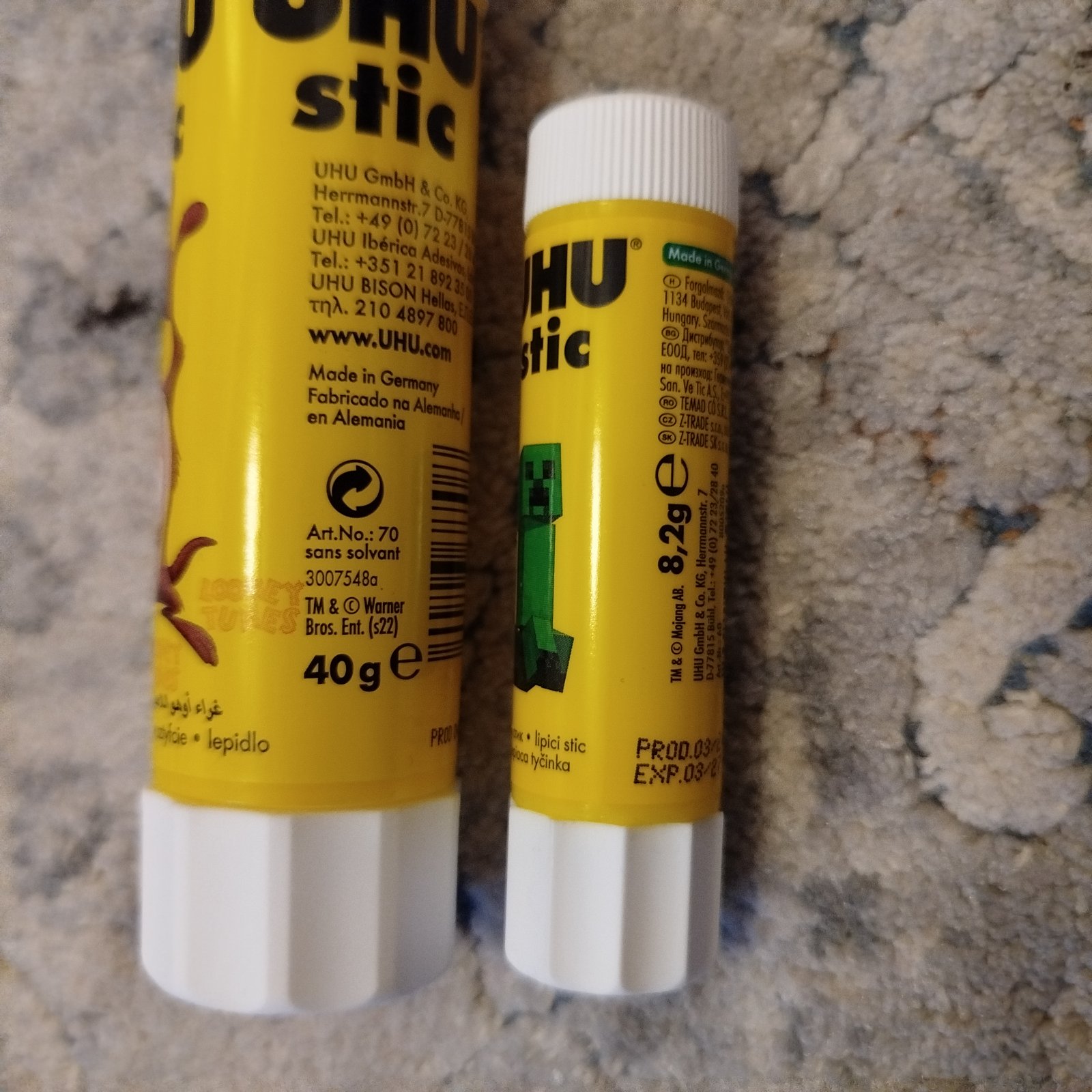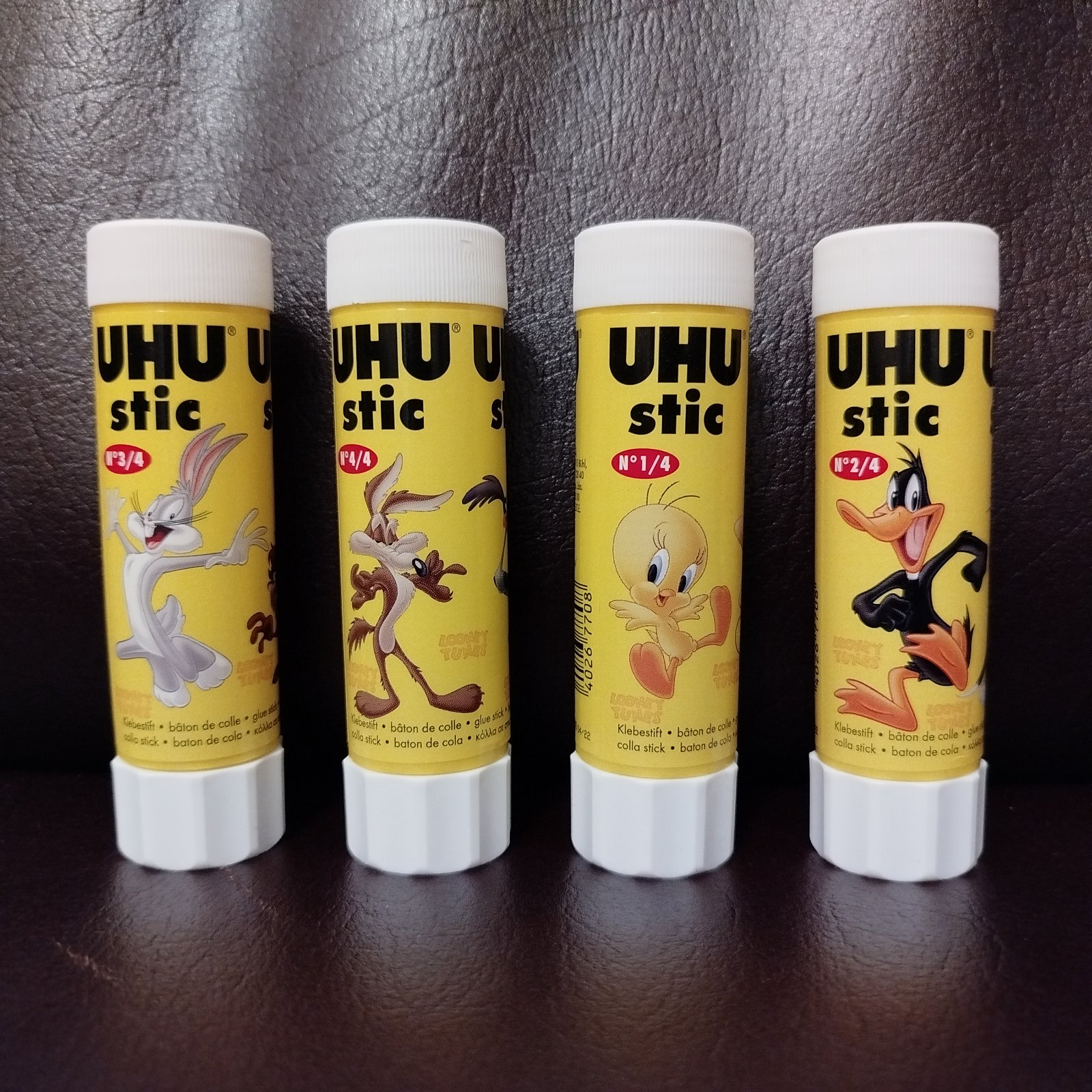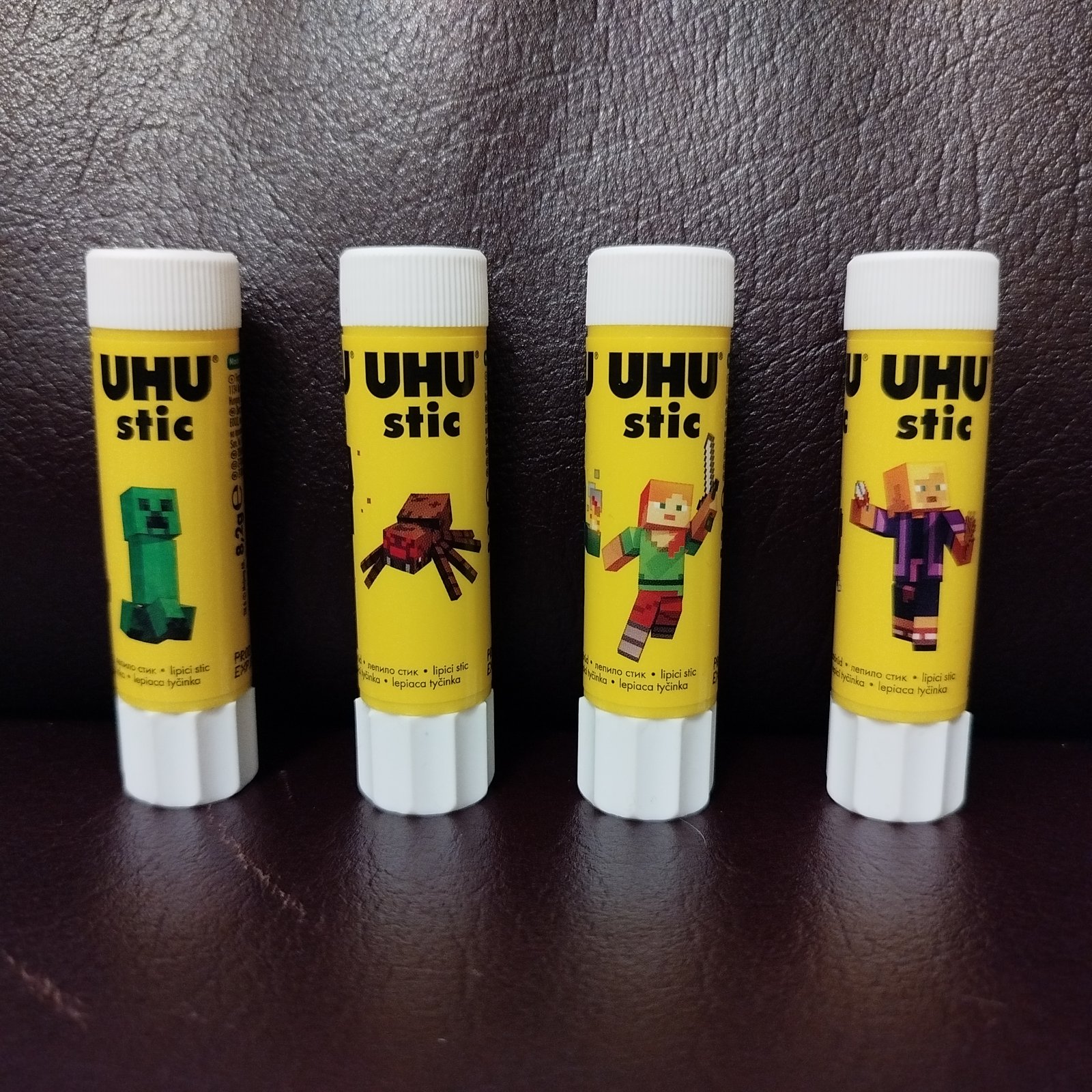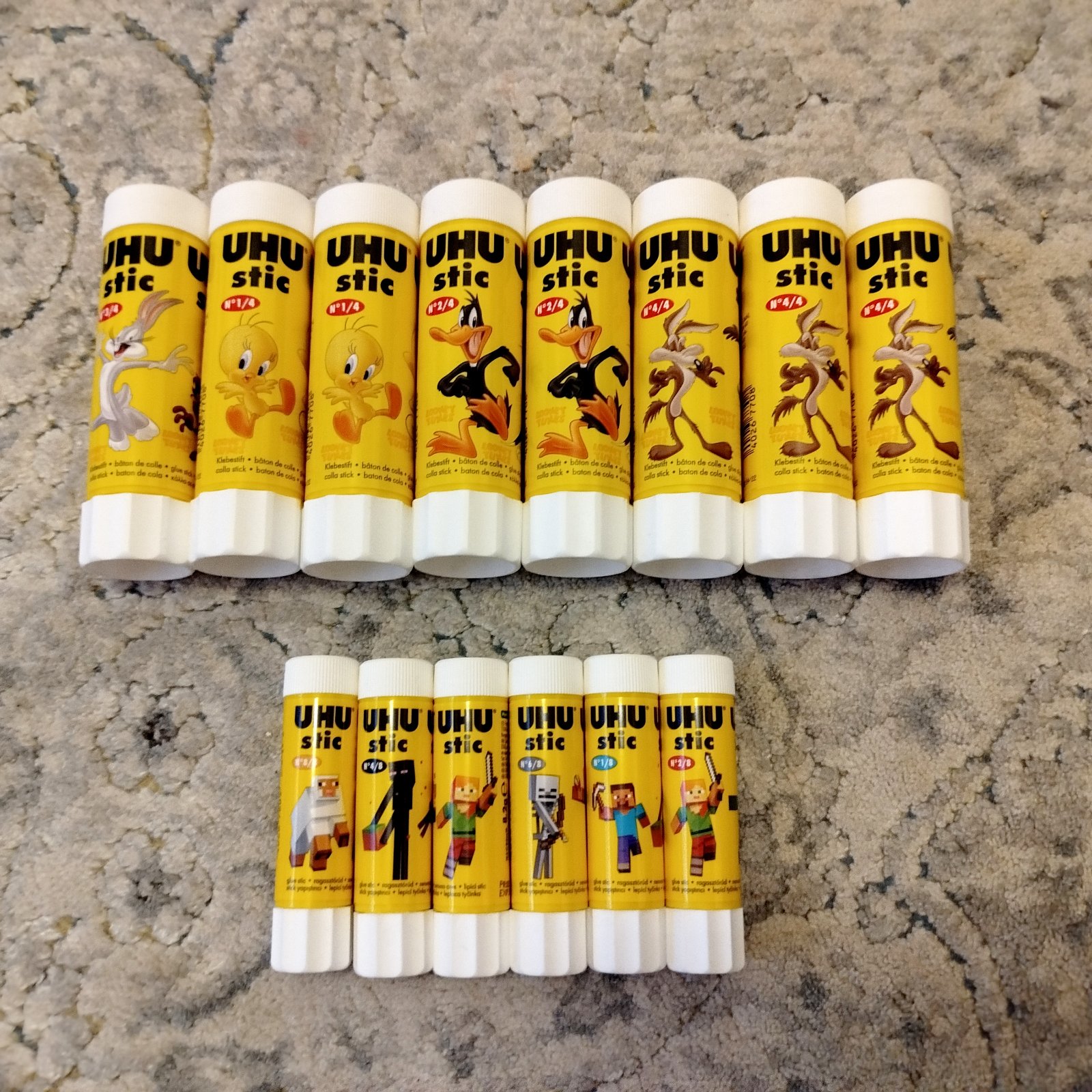 Lepidlá UHU Stic originál, nové. Veľké 40gr s motívom Looney Tunes. Malé 8,2gr s motívom Minecraft. Na každom sú dva obrázky, z každej strany jeden, viď foto. Cena + pošta.