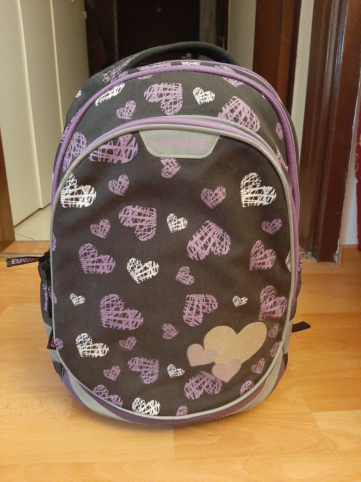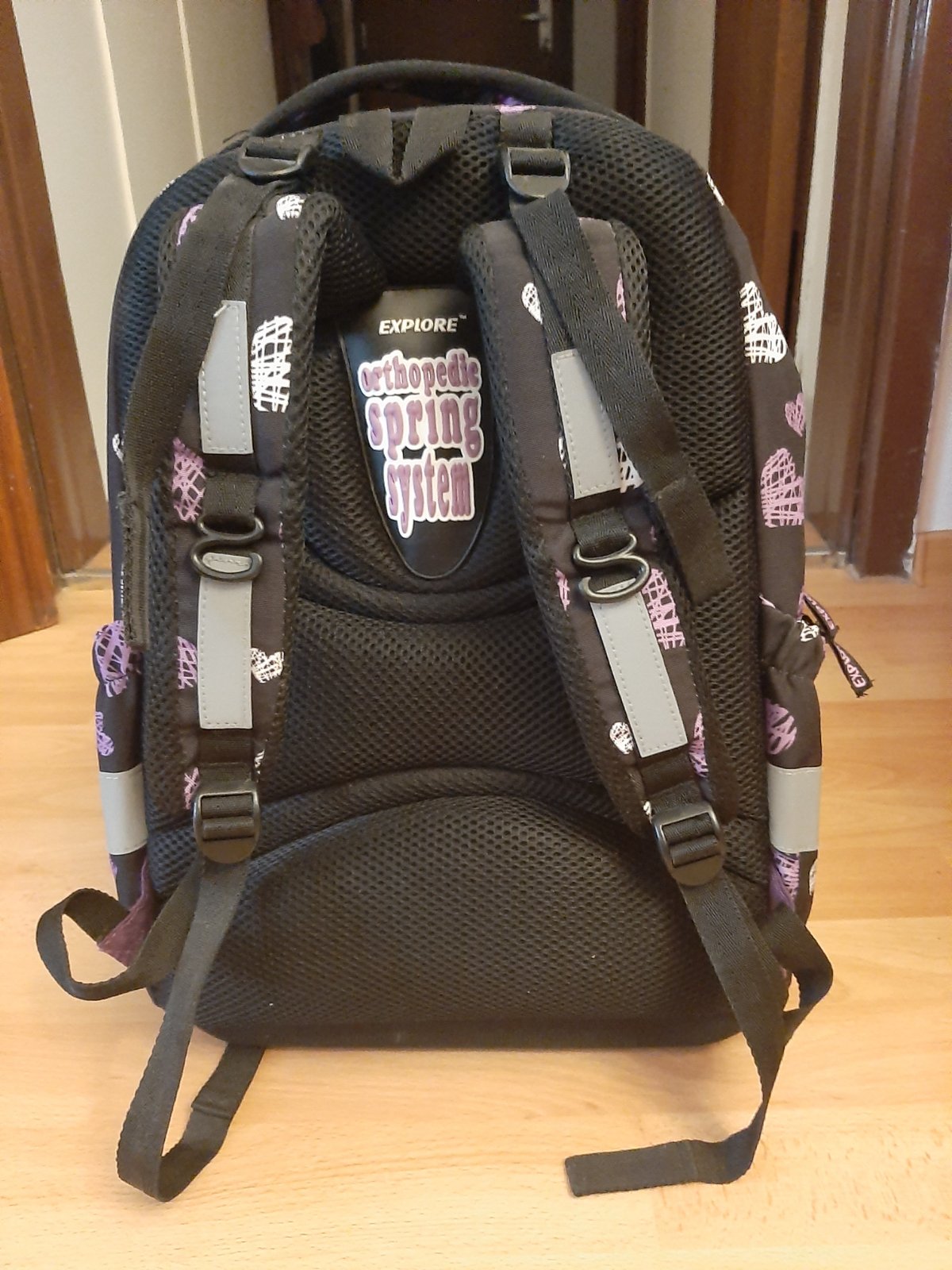 Školská taška trojkomorová, značka Explore (orthopedic spring system) vo veľmi dobrom stave. Ergonomicky tvarovaná chrbtová časť, nastaviteľné popruhy, reflexné prvky, 2 bočné vrecká na fľašu s pitím alebo dáždnik, ucho na prenášanie a pútko na zavesenie na lavici. Pravdaže nepremokavá.