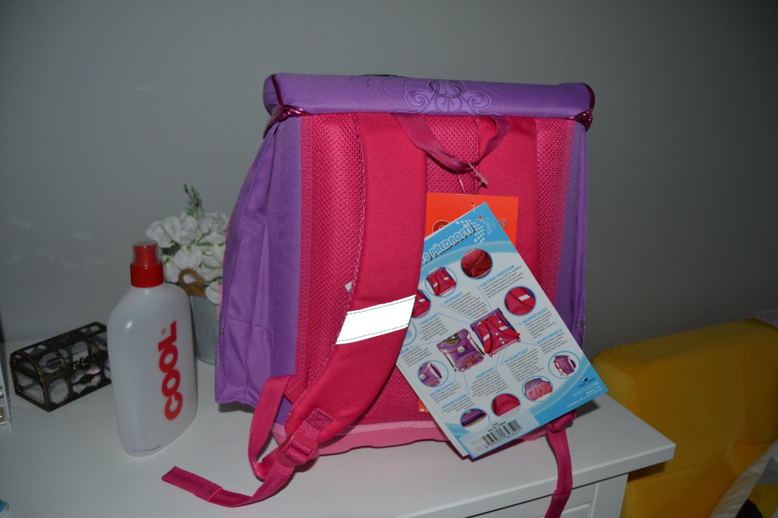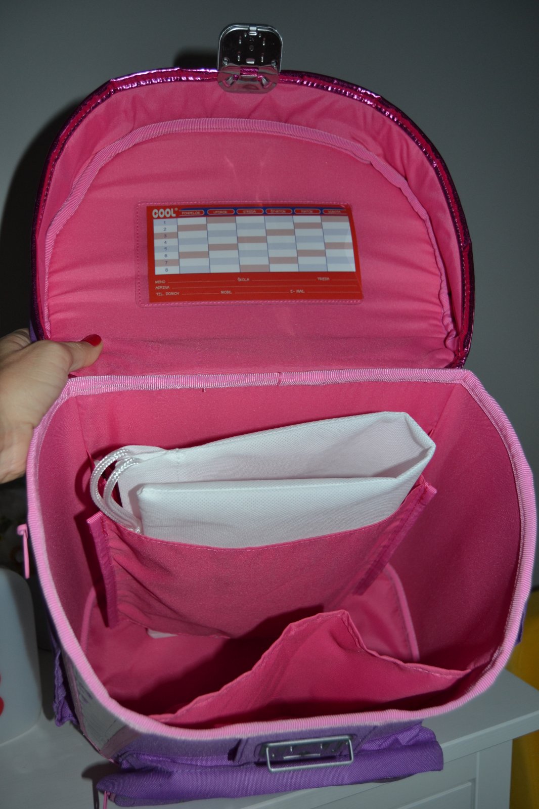 Dievčenská školská taška, NOVÁ s visačkou fialovej farby s doplnkami - fľaška a vrecko, má 10 predností: