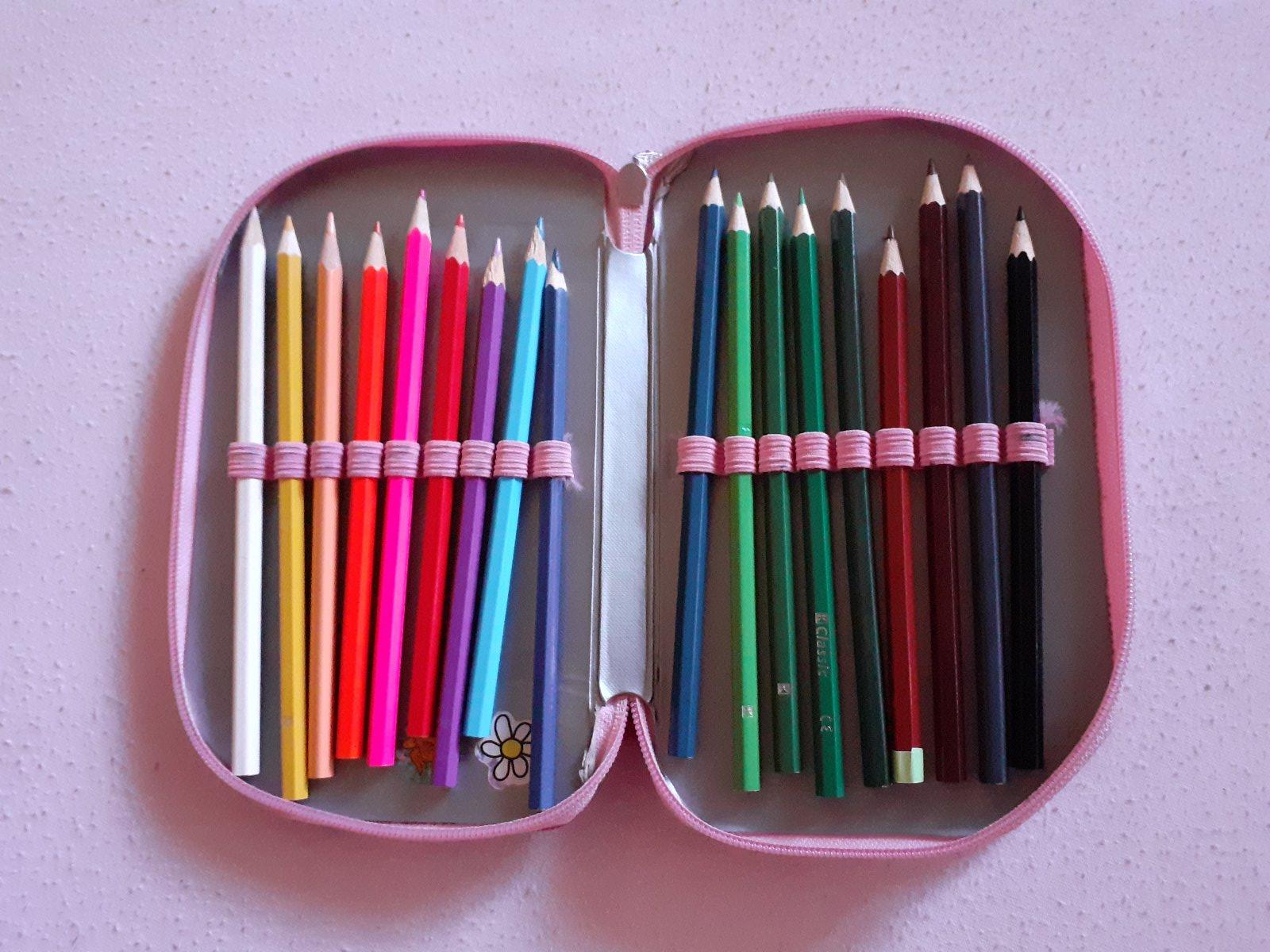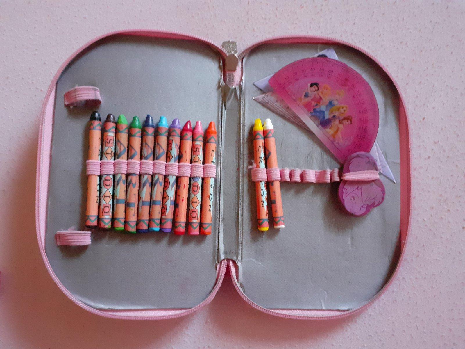 peračník naplnený - funkčný, len treba vyčistiť. Všetko používané. Obsahuje pastelky, gumu, pravítka, voskovky