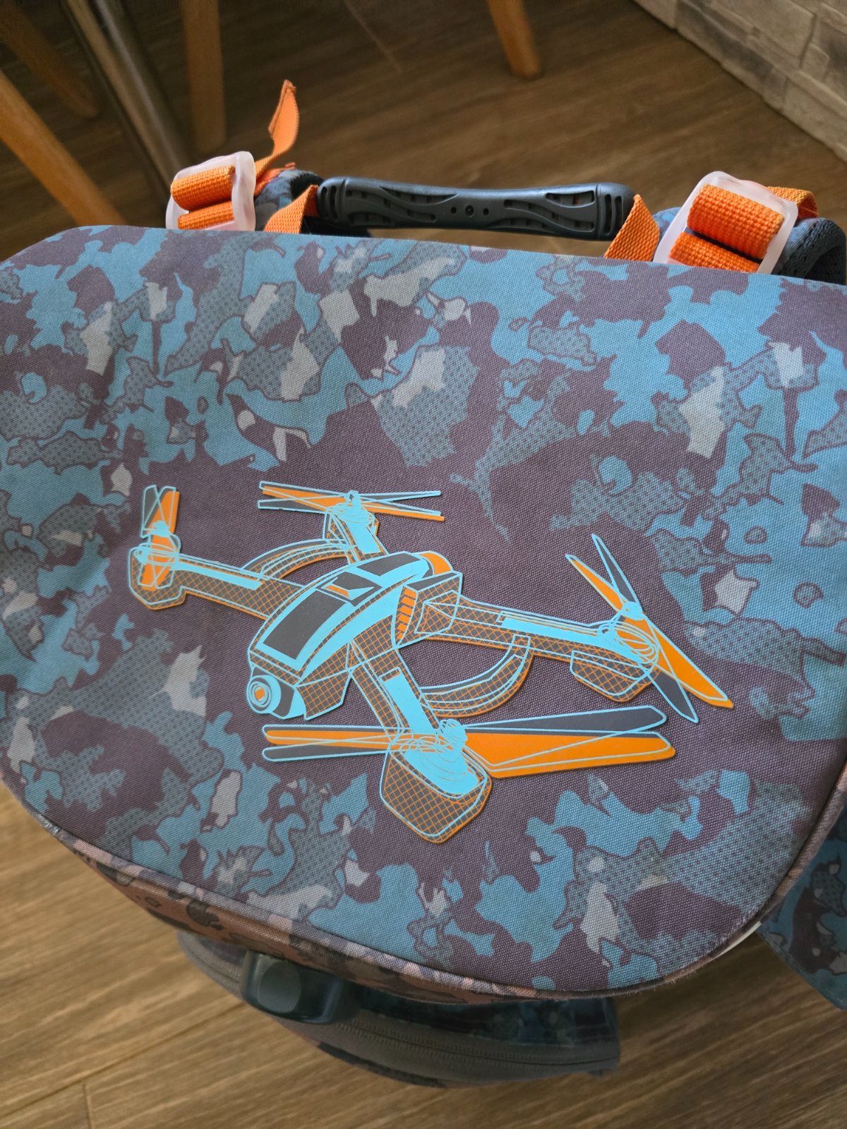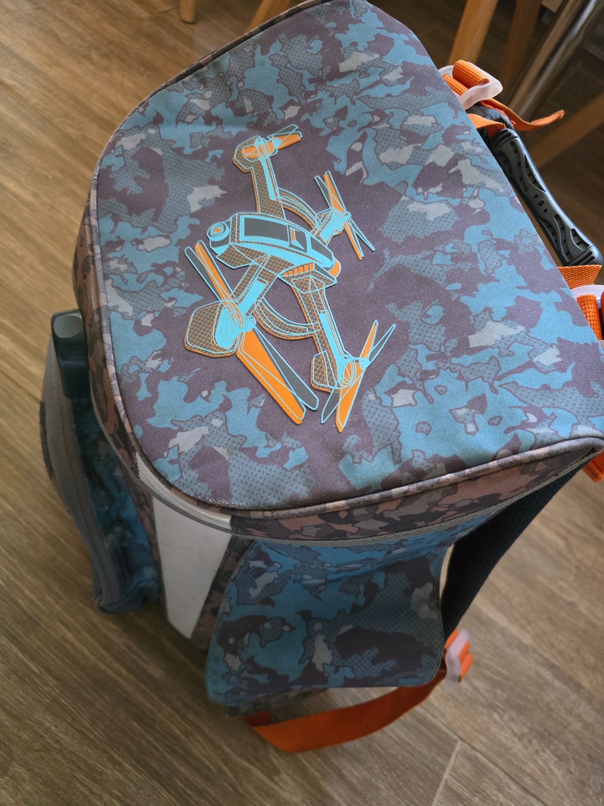 Minimálne nosená školská aktovka, pôvodná cena 40 e. Rozmery: 44 x 37 x 20 Tvarovaná, vzadu polstrovaná, s reflexnými prvkami. s bočnými vreckami. Motív: dinosaur.
