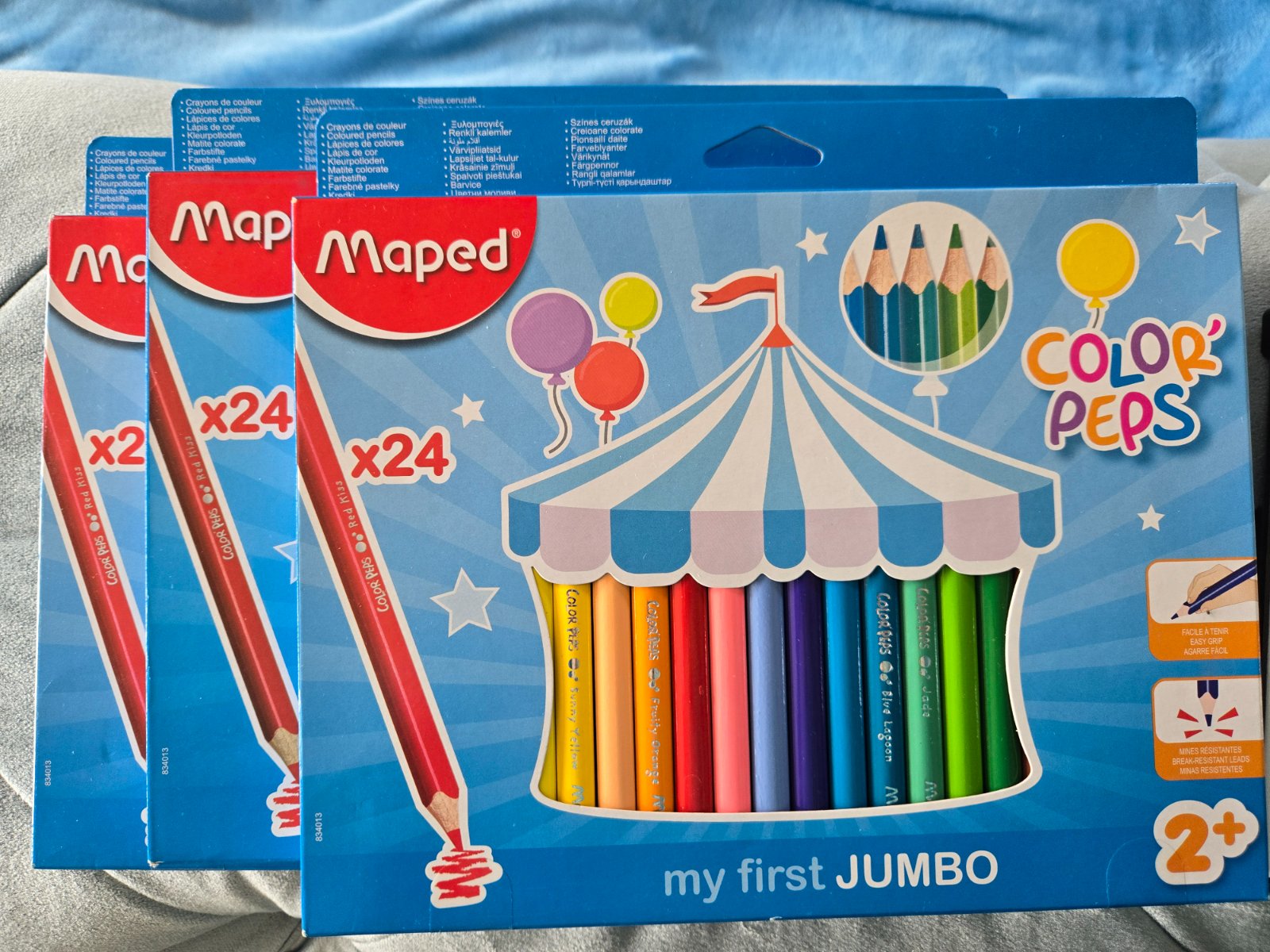 Tieto pastelky sú z radu Maped Color'Peps "My First" Jumbo, čo je najvyššia (a najdrahšia) kategória detských pasteliek od tejto značky. Sú určené pre tie najmenšie deti (2+), pretože sú extra hrubé a majú veľmi odolnú tuhu a sú super. Bežná cena cca 14 eur.