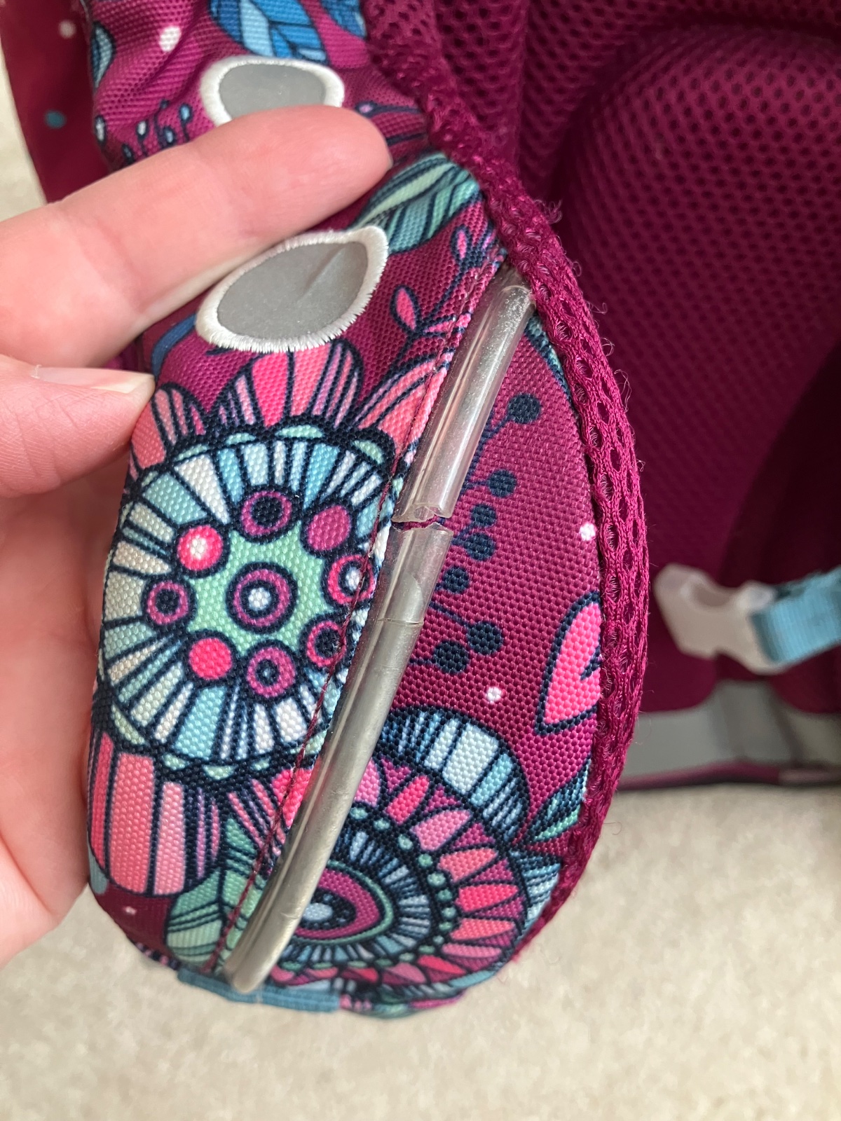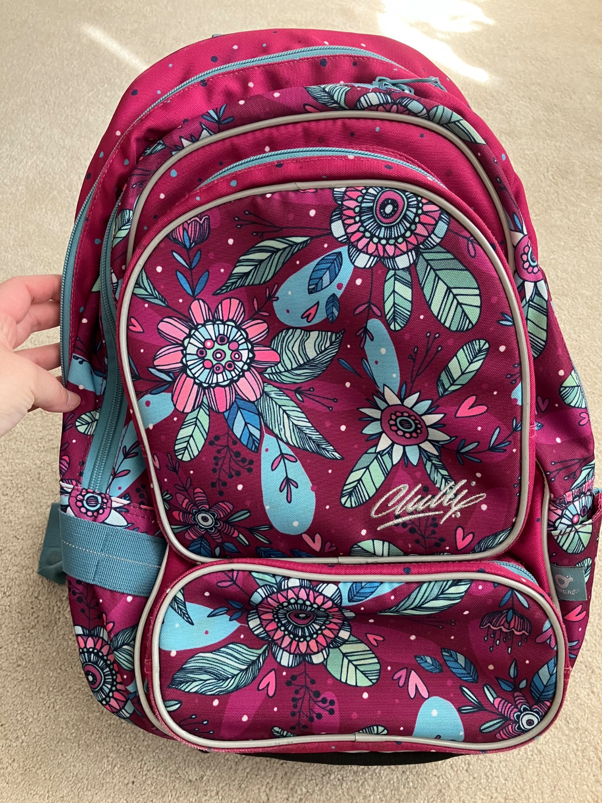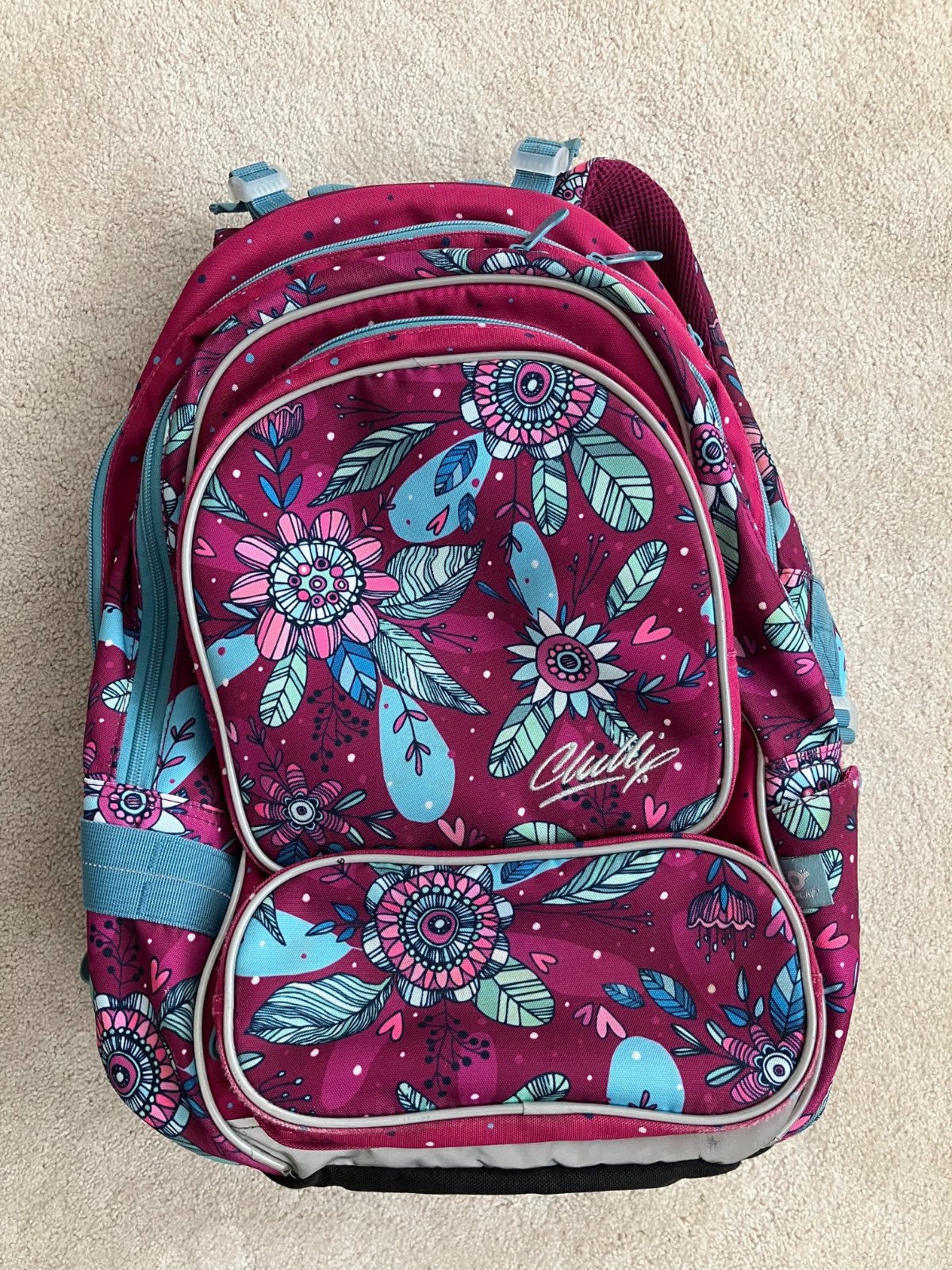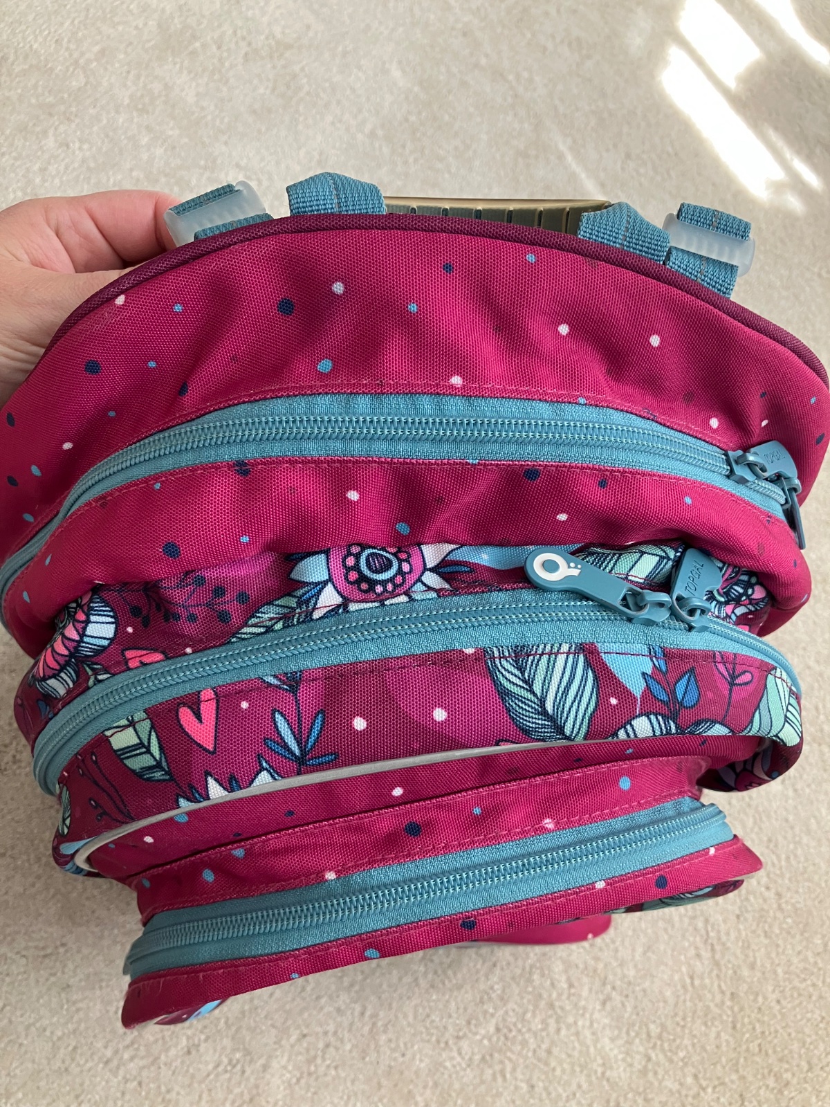Predám veľmi zachovalú školskú tašku pre dievča, nosenú jeden rok. Široká, velky objem. Bez vyblednutí, flakov a inych poškodení. Jediná chybička: prasknuta plastová časť (viď posledné foto), vidieť iba z blízka a po zohnutí.