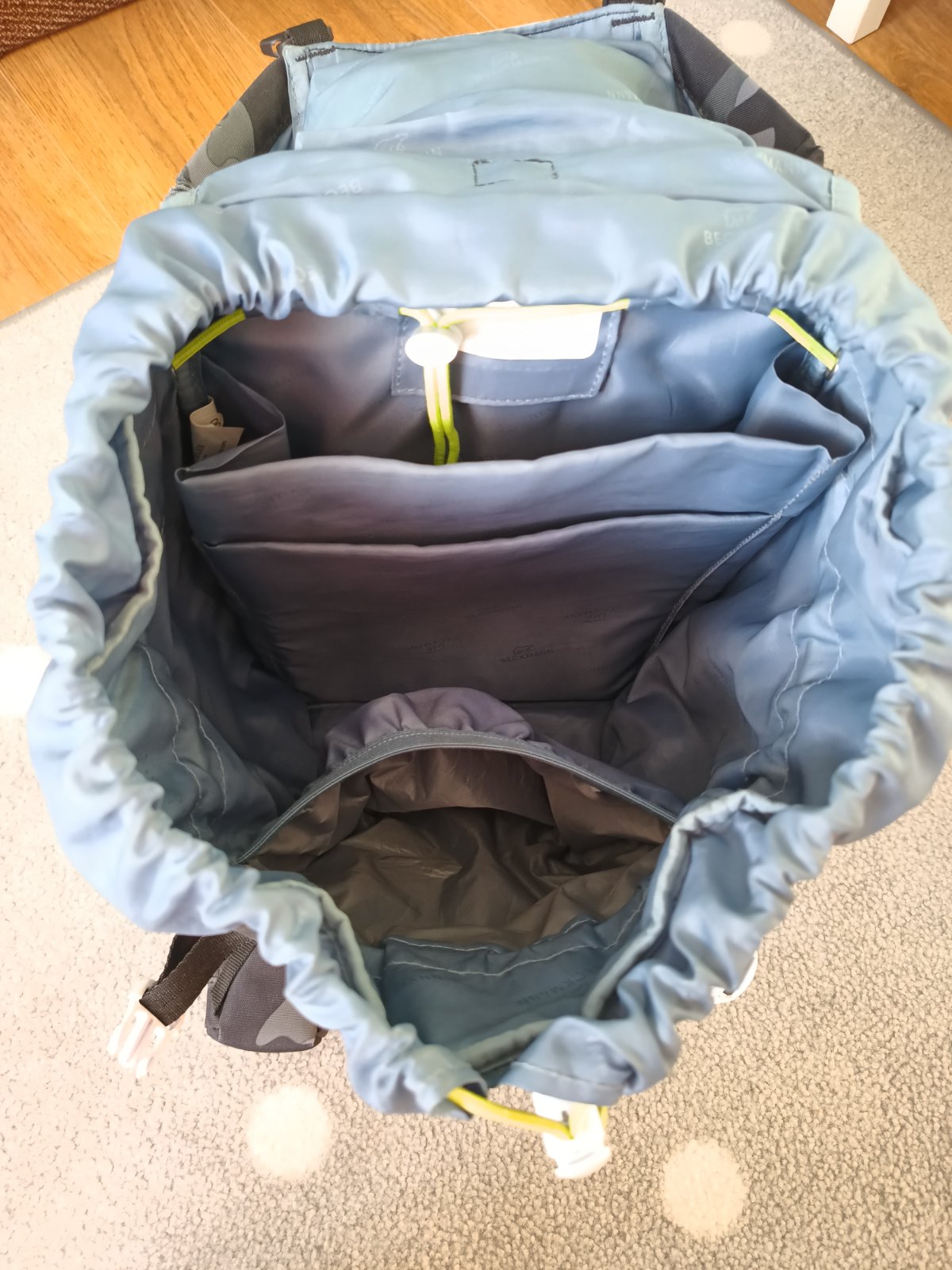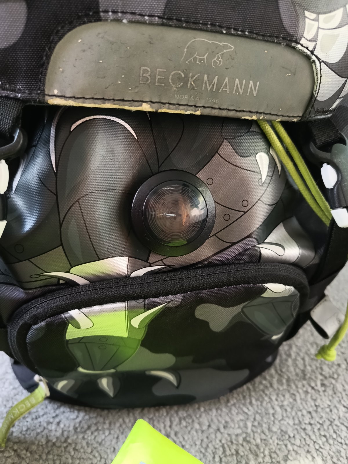 Školská taška Beckmann. Plne funkčná. S prsiplastom do dažďa. So svetlom - bliká alebo svieti. Treba vymeniť baterky. Reflexný pás vpredu osuchany - viď foto. Ináč neposkodena. Ľahká. Bedrový pás.