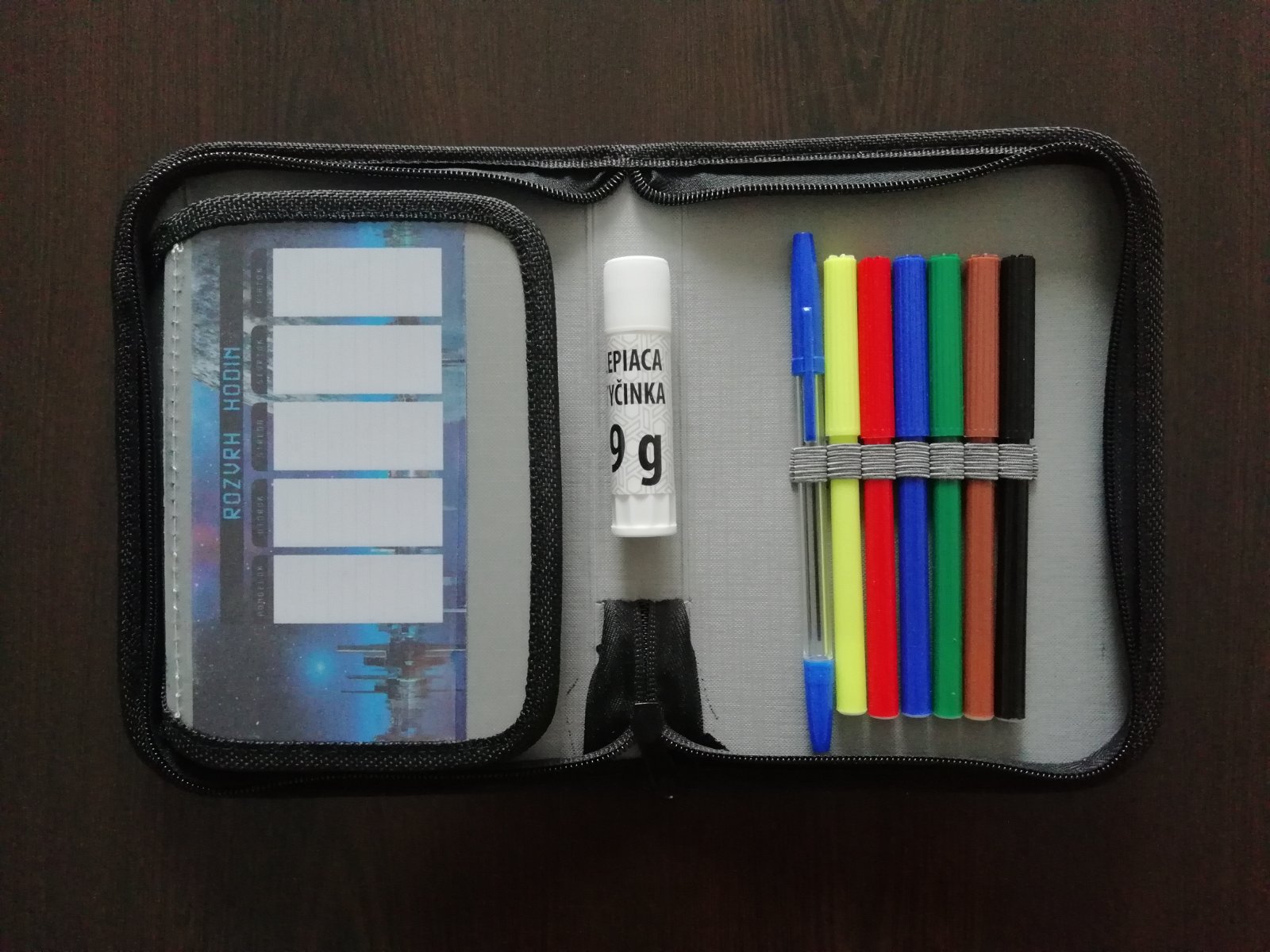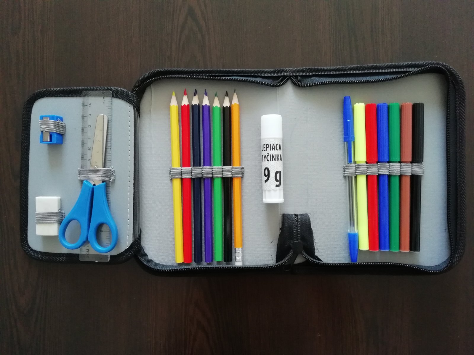 farebné pastelky - 6 ks, fixky - 6ks, obyčajná ceruzka, guľôčkové pero, detské nožnice, lepiaca tyčinka, pravítko 15 cm, strúhadlo na ceruzky, guma
