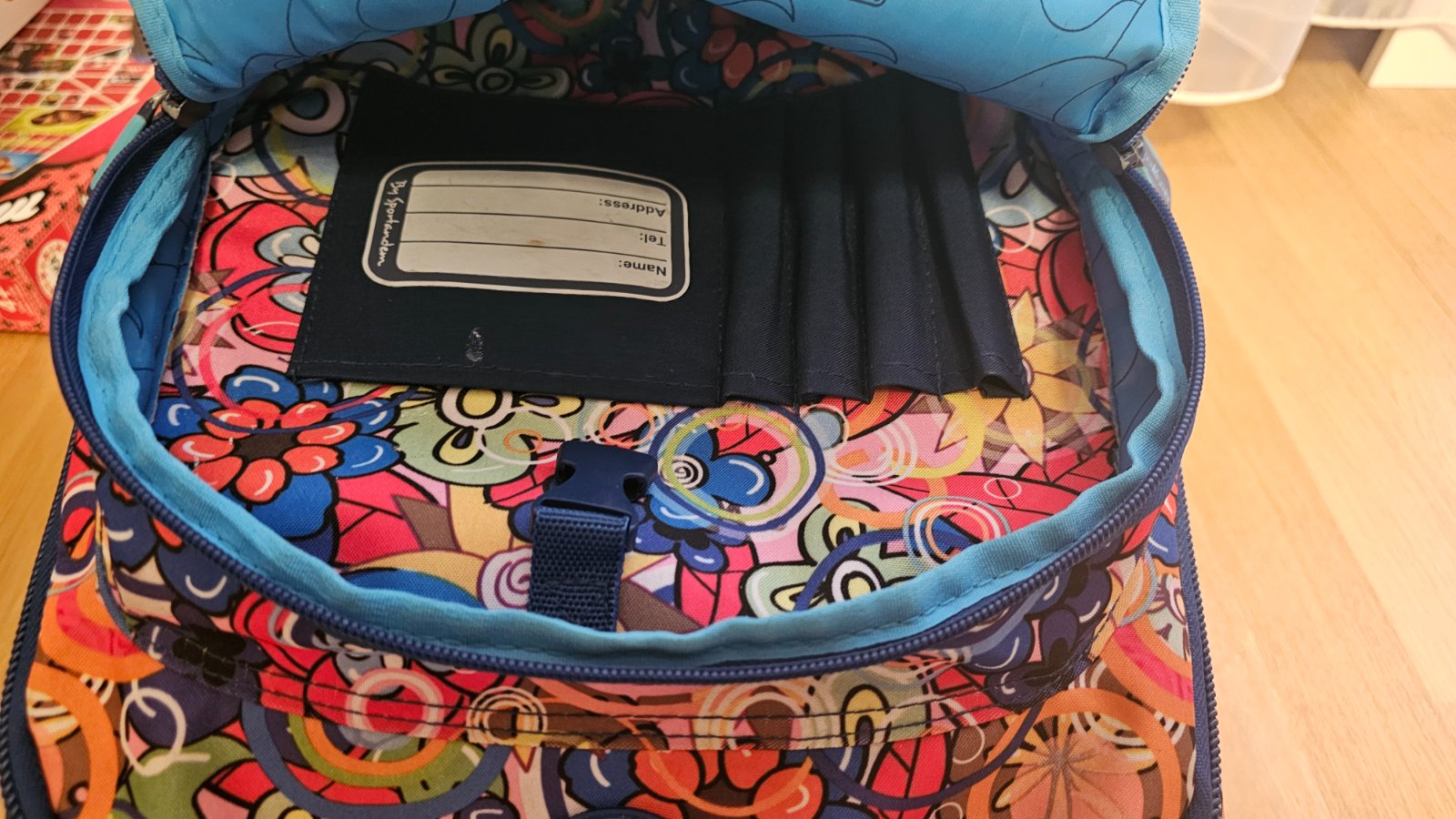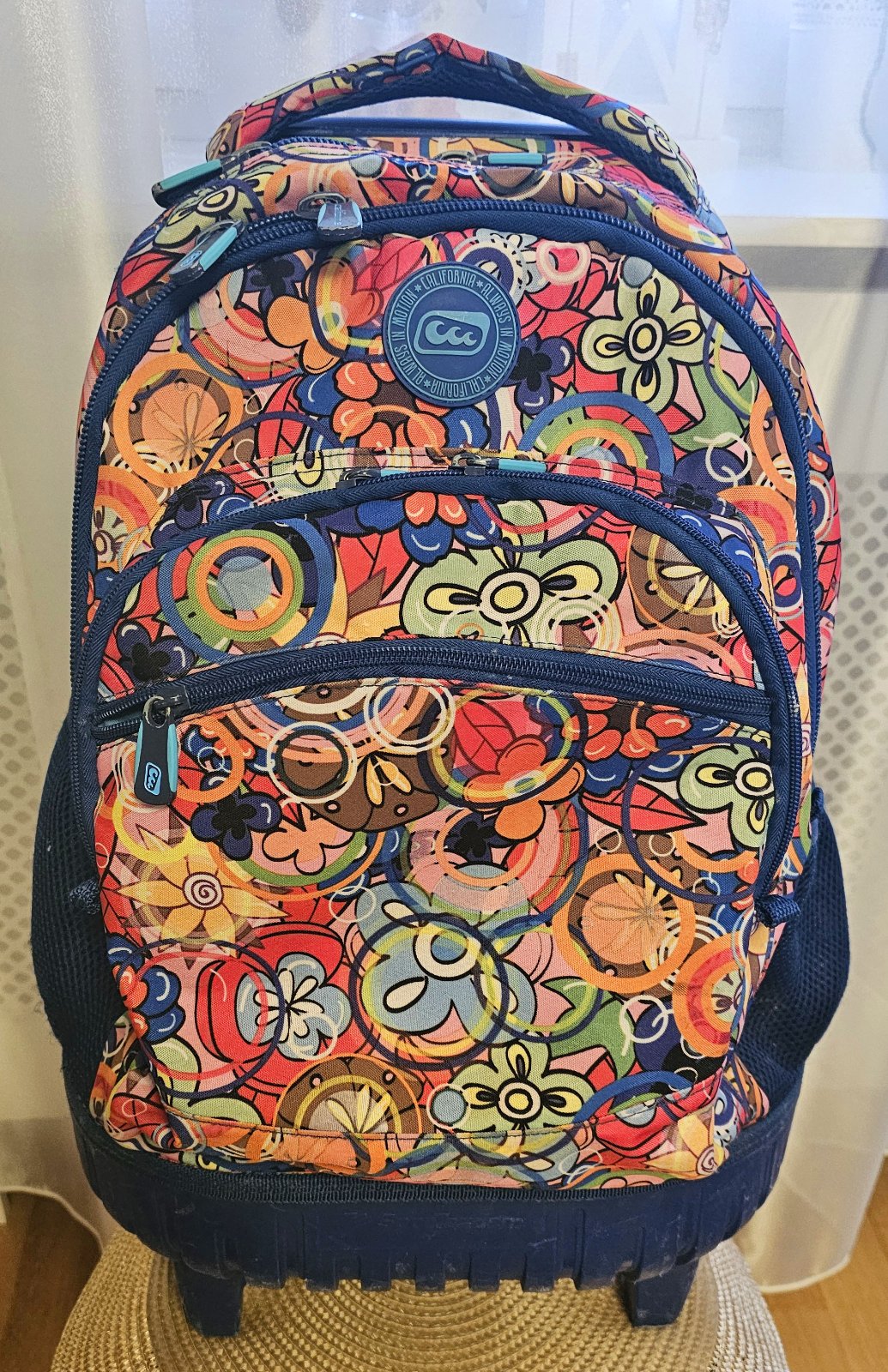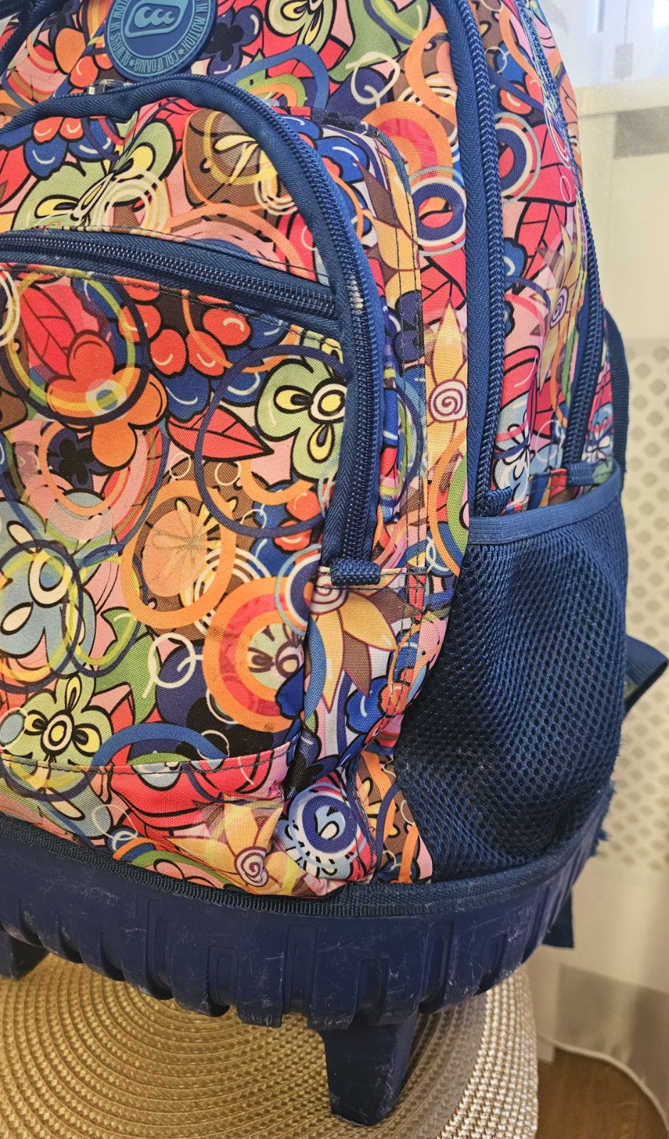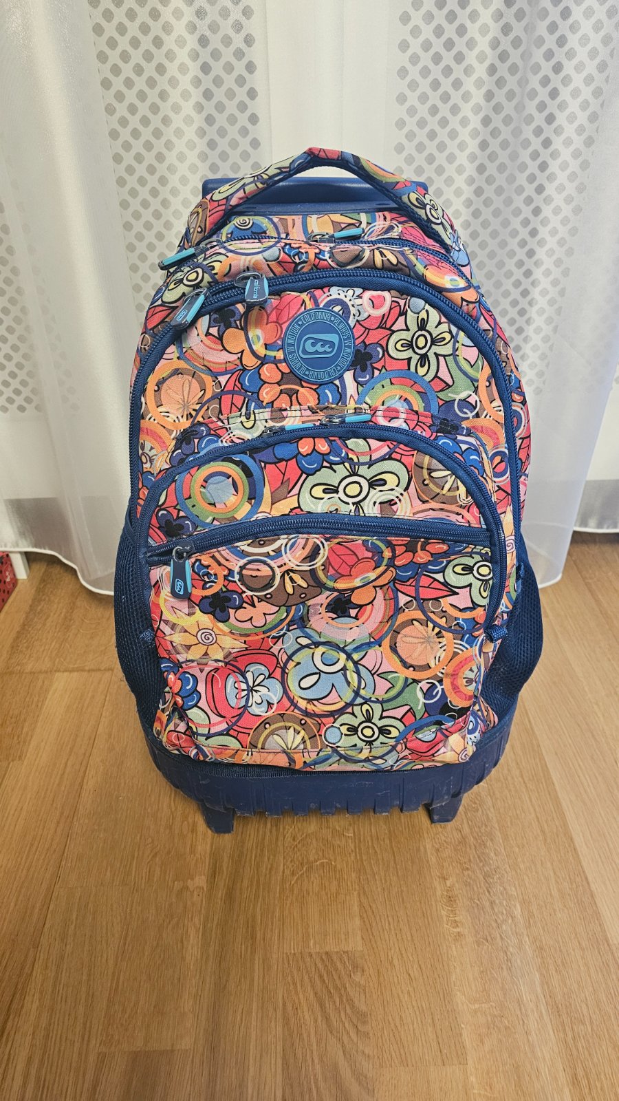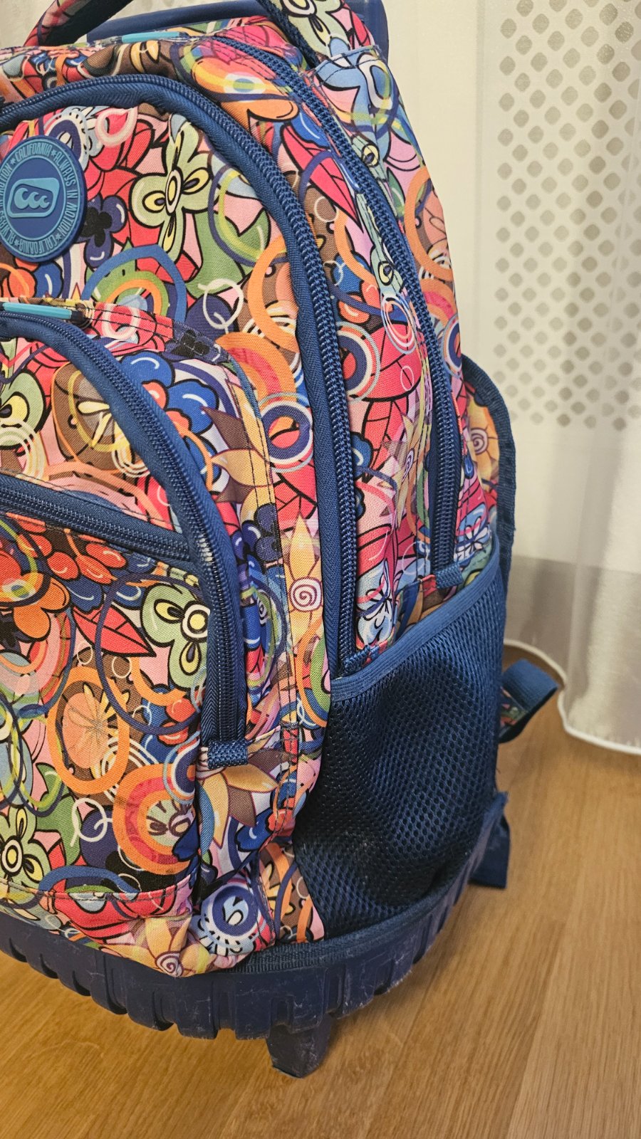 Výborný používaný stav. Školský batoh na kolieskach s teleskopickou tyčou. Batoh je rozdelený viacerými komorami pre stabilné uloženie školských potrieb a doplnkových potrieb. Na oboch stranách batohu sú voľne dostupné vrecká na odkladanie fľaše s pitím, vreckoviek a pod. Chrbtová časť ukrýva ramenné popruhy pre prípad nosenia na chrbte. Kryje ich spevnená látka uzatvorená na suchý zips. Nosenie na chrbte by malo byť len príležitostné - batoh má vyššiu hmotnosť a nie je ergonomicky tvarovaný. Pri chôdzi po schodoch je nutné batoh niesť v ruke.