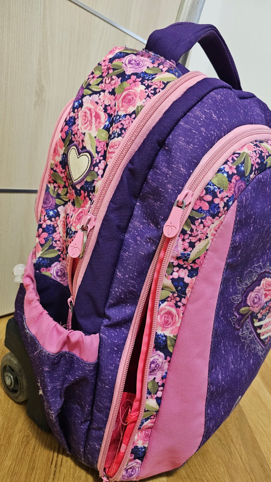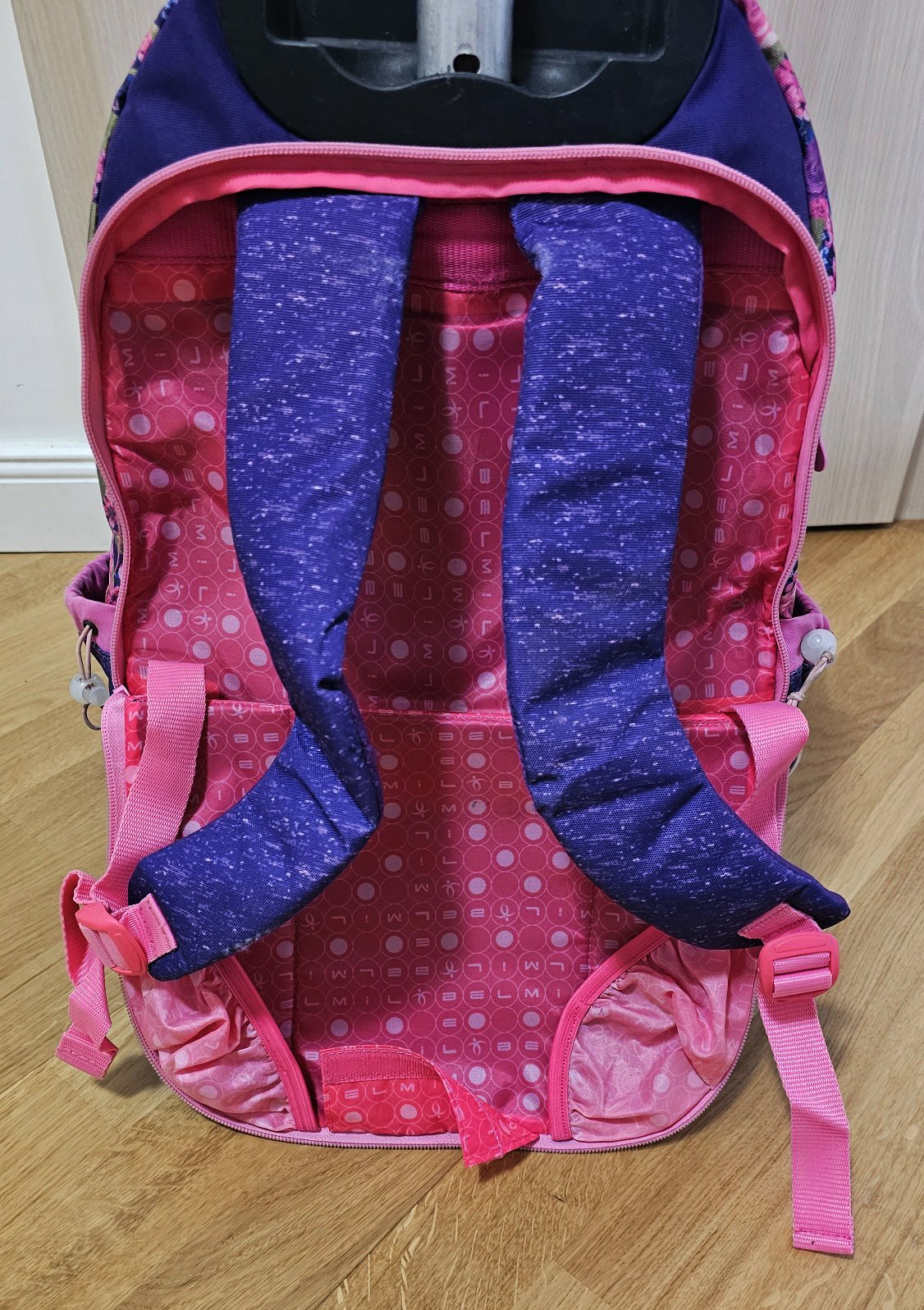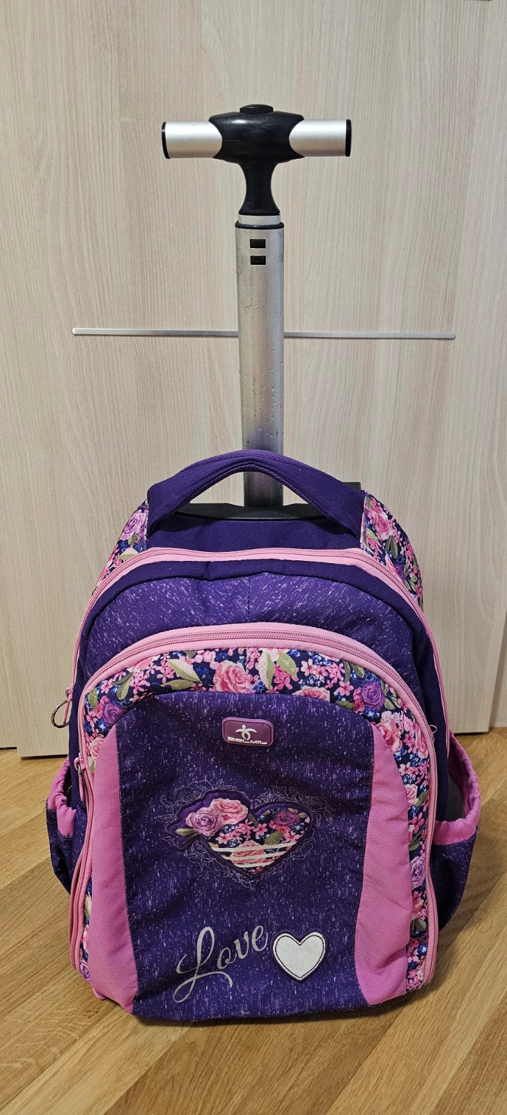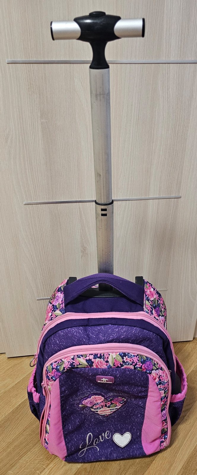 Výborný používaný stav. Školský batoh na kolieskach s teleskopickou tyčou. Hlavná komora batohu je rozdelená dvoma prepážkami pre stabilné uloženie školských potrieb, jedna z nich je polstrovaná pre notebook. V prednom vrecku nájdete organizér na drobnosti a sieťovanú kapsičku so zipsom. Na oboch stranách batohu sú voľne dostupné vrecká na odkladanie fľaše s pitím, vreckoviek a pod.Chrbtová časť ukrýva ramenné popruhy pre prípad nosenia na chrbte. Kryje ich spevnená látka uzatvorená na zips, ktorú v prípade využitia popruhov zahnete naspodok batohu a uchytíte na suchý zips. Zakryjete tým kolieska, aby nedošlo k zašpineniu oblečenia. Nosenie na chrbte by malo byť len príležitostné - batoh má vyššiu hmotnosť a nie je ergonomicky tvarovaný. Pri chôdzi po schodoch je nutné batoh niesť v ruke.