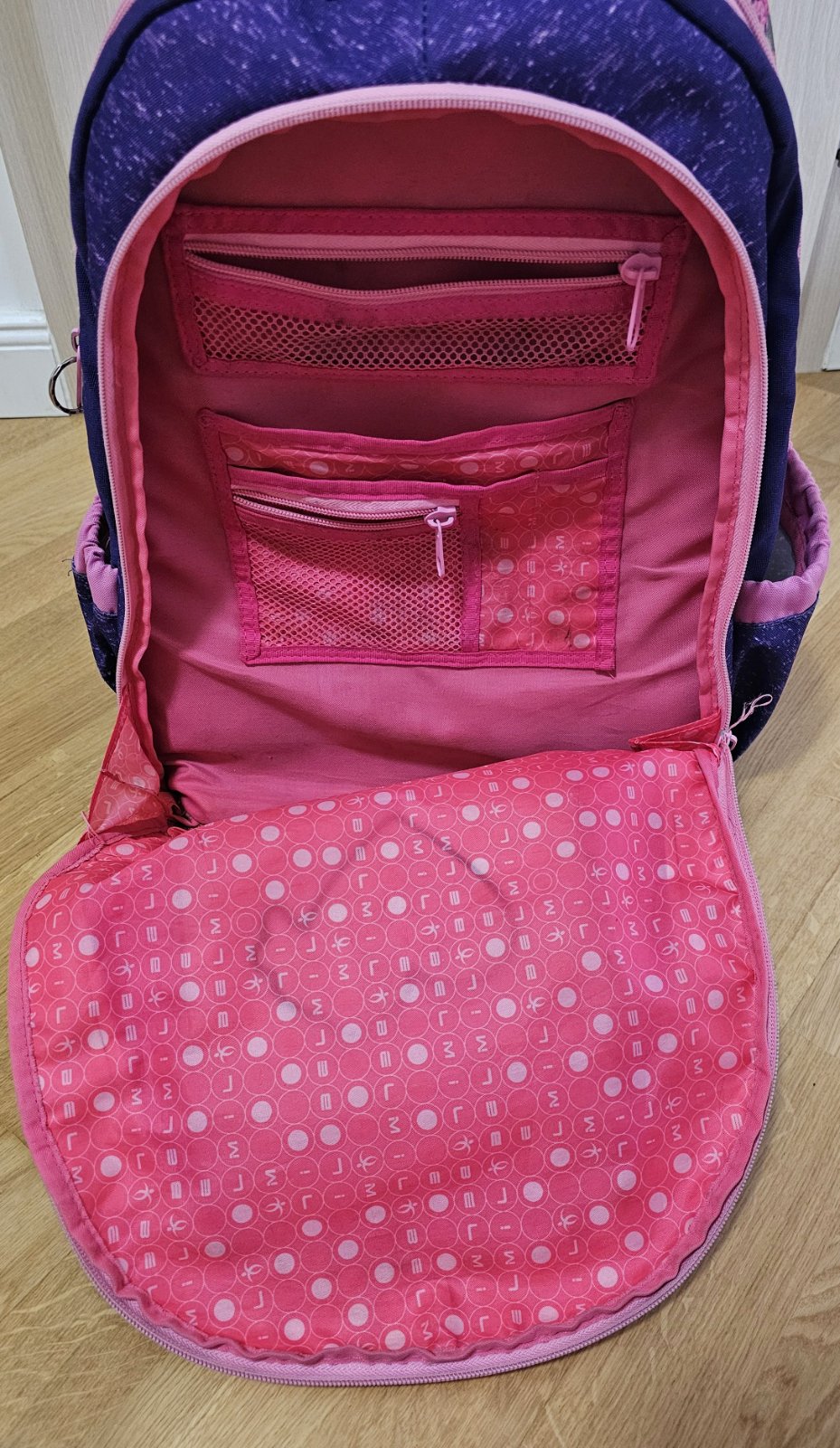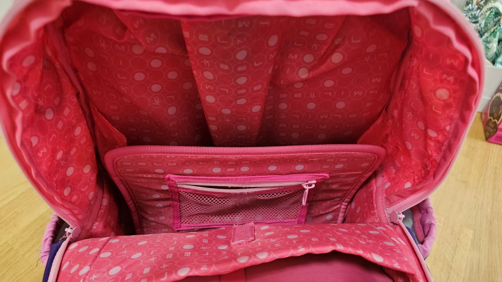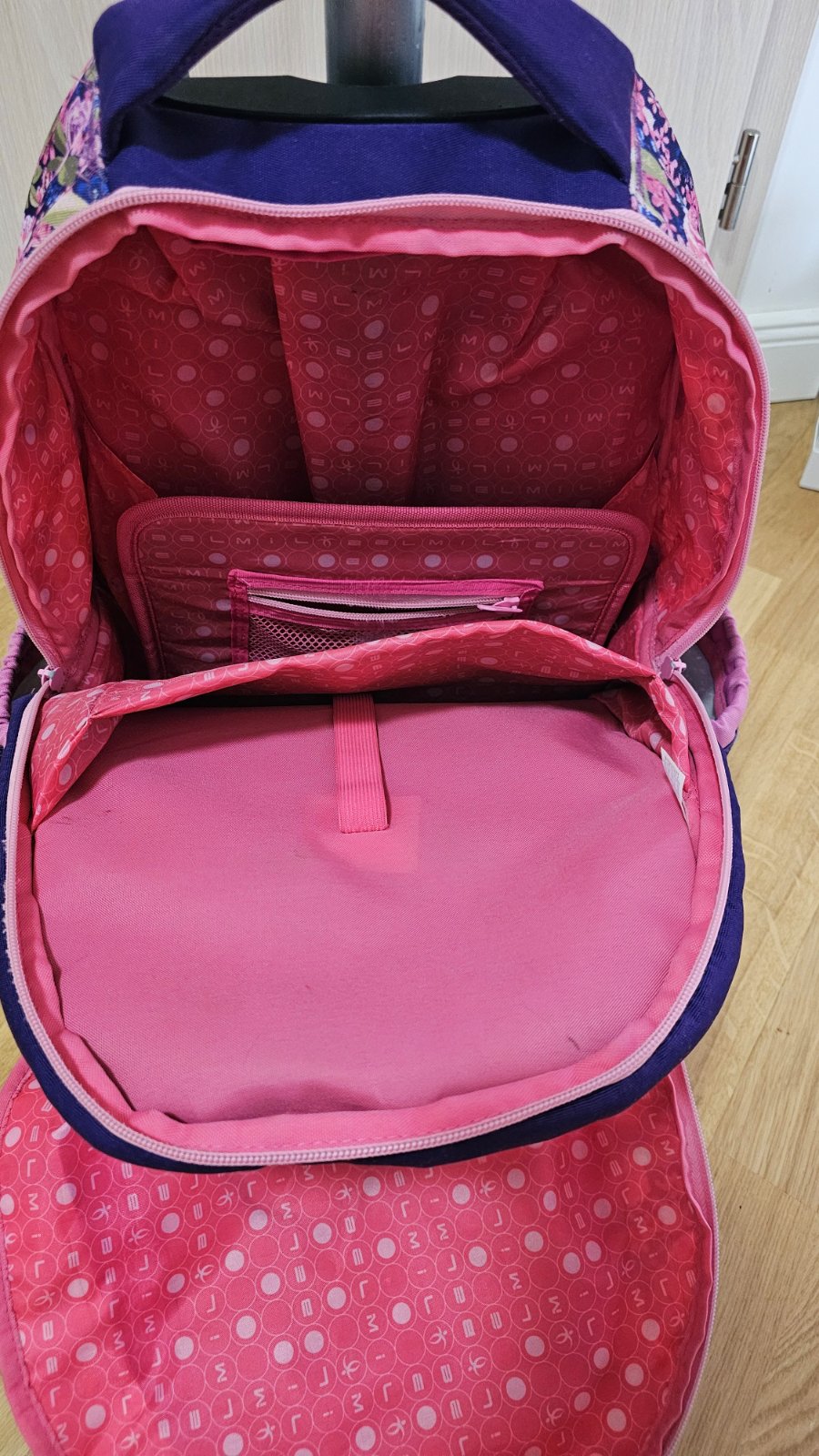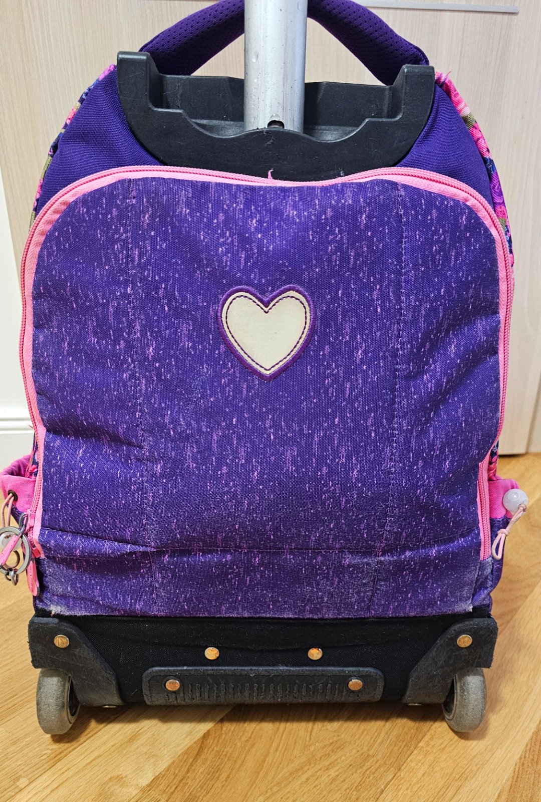 Výborný používaný stav. Školský batoh na kolieskach s teleskopickou tyčou. Hlavná komora batohu je rozdelená dvoma prepážkami pre stabilné uloženie školských potrieb, jedna z nich je polstrovaná pre notebook. V prednom vrecku nájdete organizér na drobnosti a sieťovanú kapsičku so zipsom. Na oboch stranách batohu sú voľne dostupné vrecká na odkladanie fľaše s pitím, vreckoviek a pod.Chrbtová časť ukrýva ramenné popruhy pre prípad nosenia na chrbte. Kryje ich spevnená látka uzatvorená na zips, ktorú v prípade využitia popruhov zahnete naspodok batohu a uchytíte na suchý zips. Zakryjete tým kolieska, aby nedošlo k zašpineniu oblečenia. Nosenie na chrbte by malo byť len príležitostné - batoh má vyššiu hmotnosť a nie je ergonomicky tvarovaný. Pri chôdzi po schodoch je nutné batoh niesť v ruke.