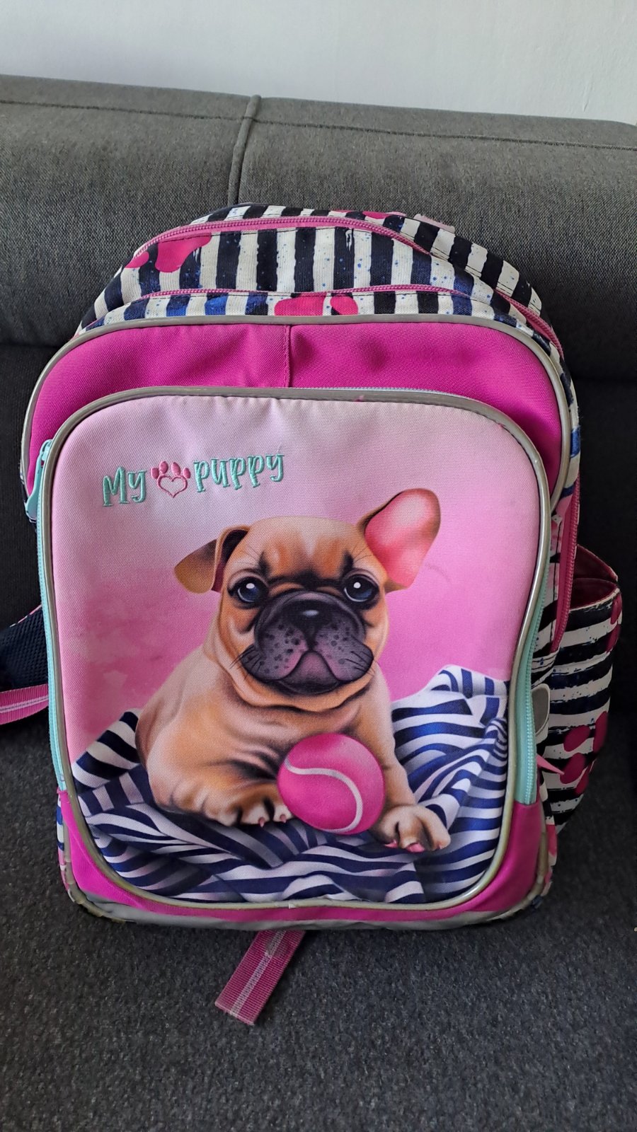 Ruksak, vhodný aj ako školská taška. Má tri úložné priehradky, dve bočné vrecká a nastaviteľné mäkké popruhy. Materiál: 100% polyester Rozmer: 42 x 32 x 20 cm Mám skladom Poštovné 4€