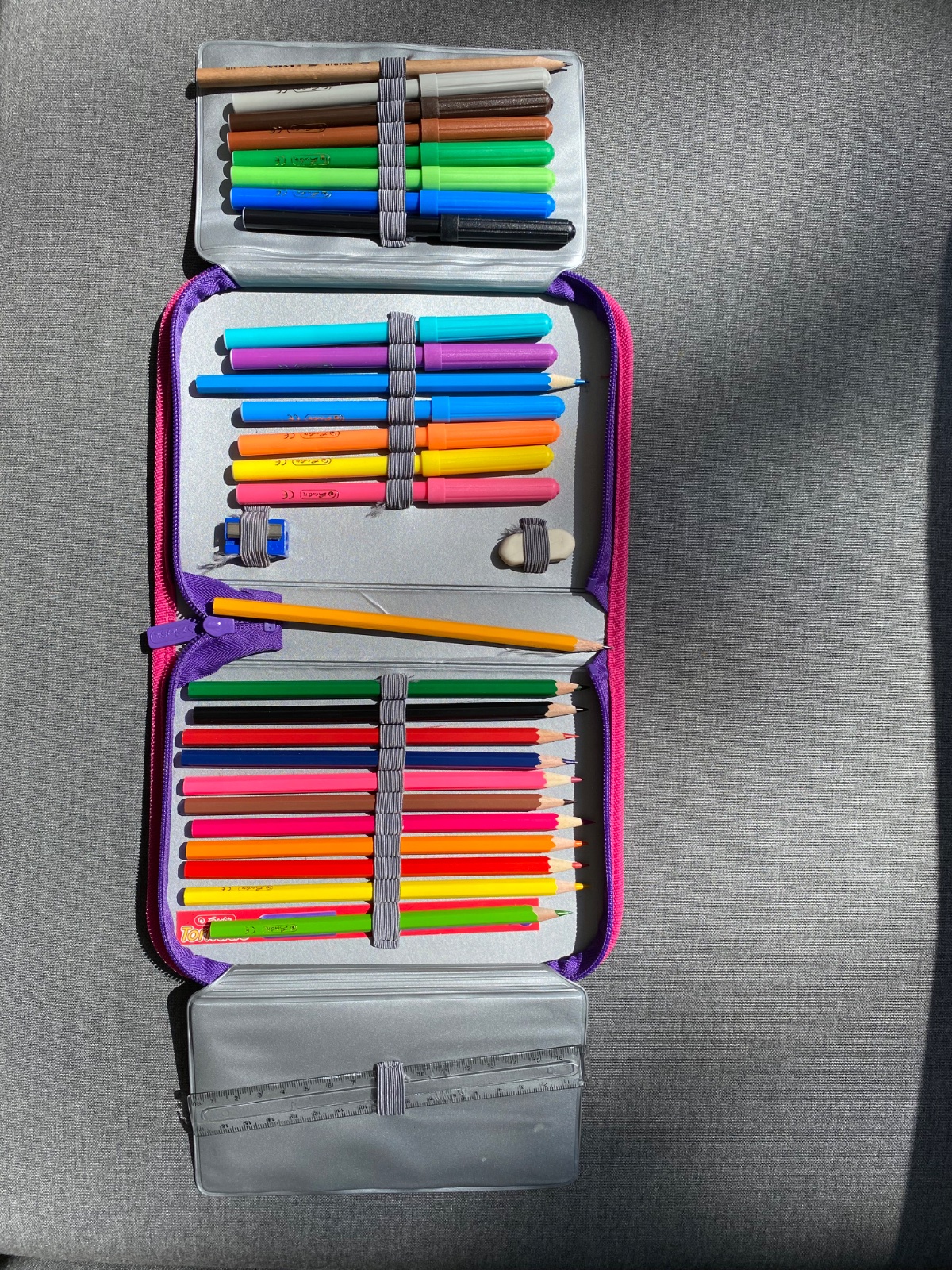Predám kompletne vybavený detský školský peračník v motíve s hviezdami. Dvojchlopňový peračník má zatváranie na zips a obsahuje kompletnú 31-dielnu výbavu, ktorú žiak bude v škole potrebovať. Použitý materiál je ľahko umývateľný. ( 5 ks fixiek v ľavej chlopni nepíšu- vyschnú). Peračník je naozaj ako nový. Tento sme mali raz na výlete. Do školy mala iný.