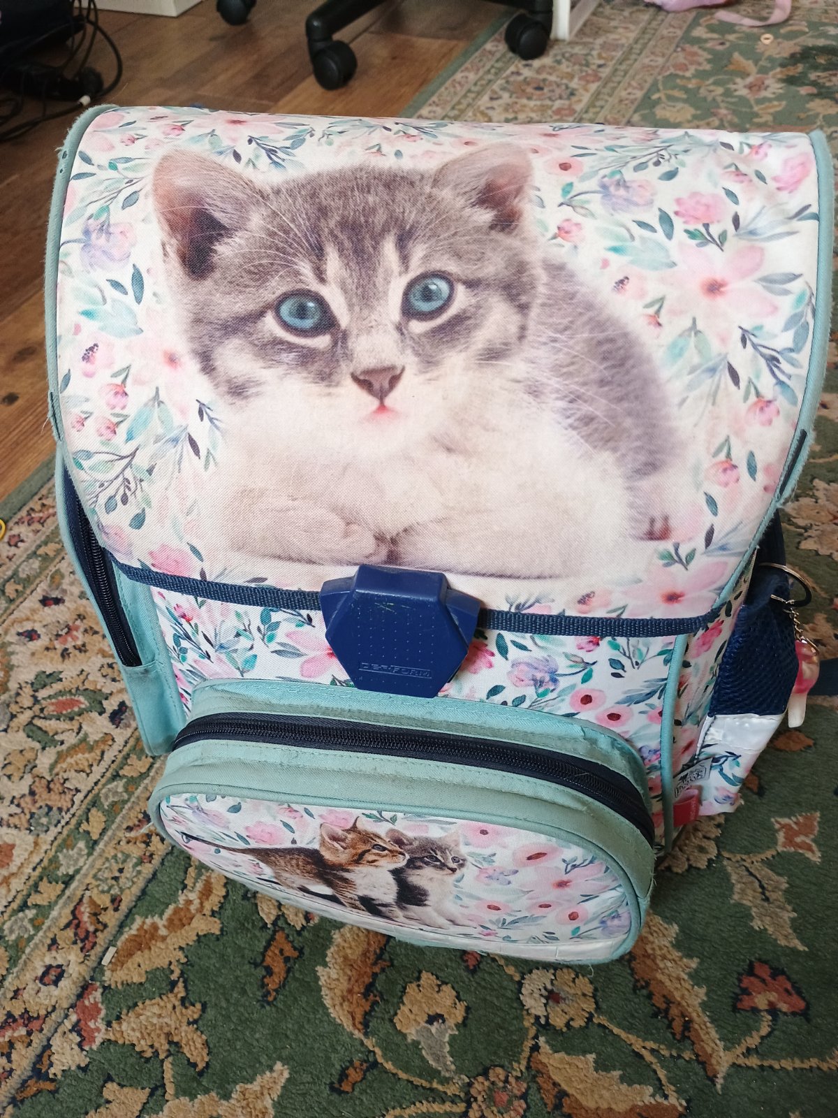 Rok používaná školská aktovka. Je ergonomická, stojí sama, drží tvar a je plne funkčná, okrem 1 natrhnutia (viď . predposledná foto) bez poškodení.