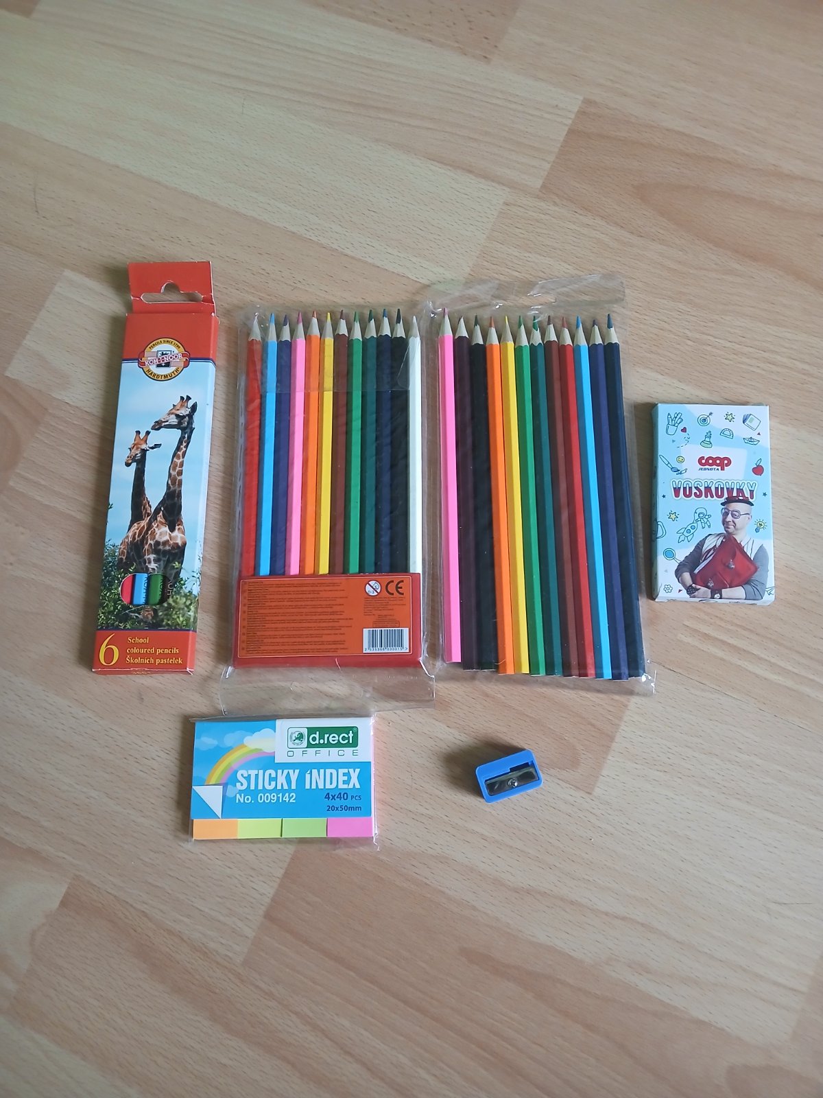 Predam drevené farebné pastelky, viaceré sady, 2 sady po 12 ks, 1 sada po 6 ks, voskovky, strúhadlo a označovanie pásiky zdarma. Nové a nepoužité.
