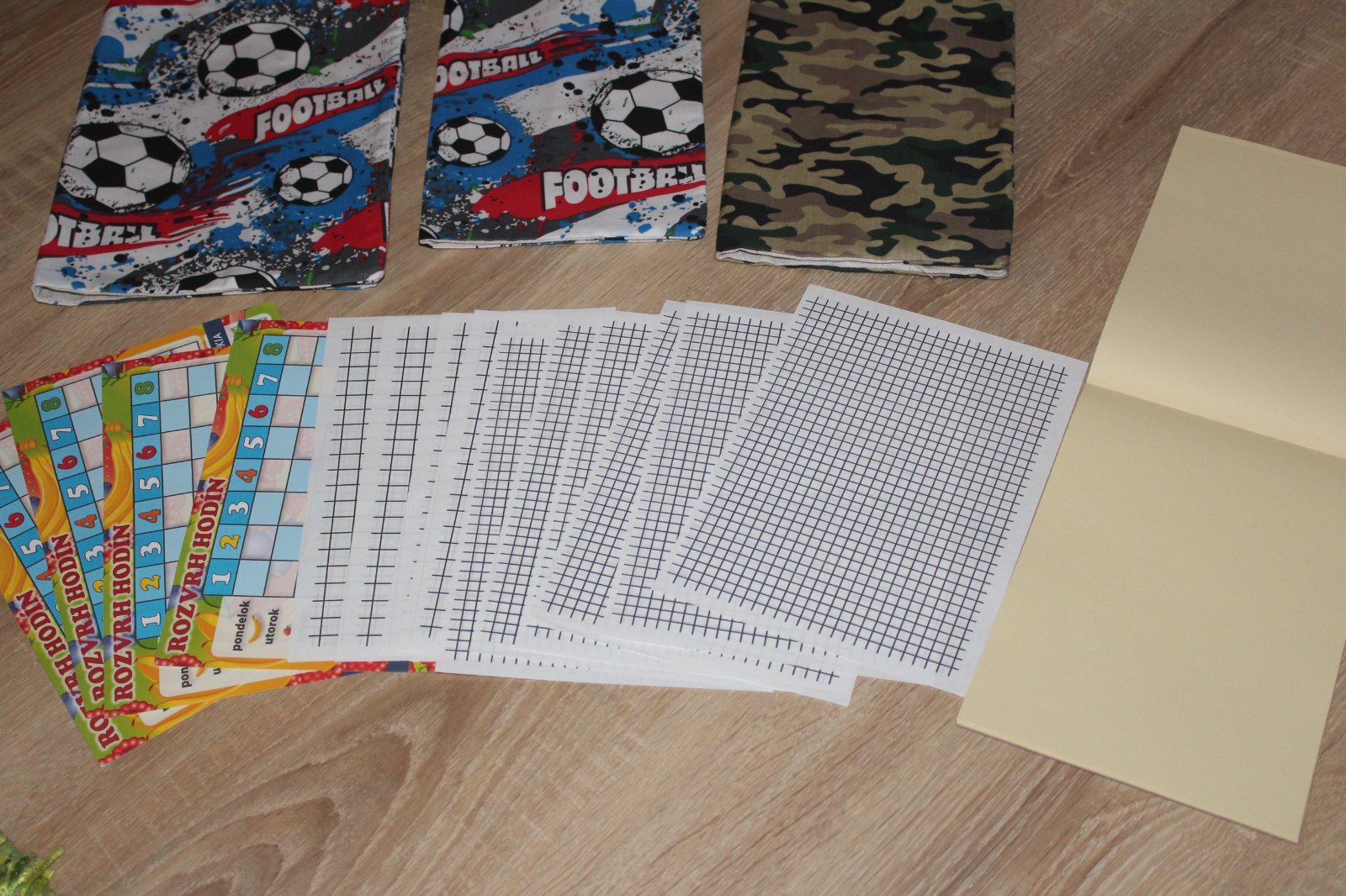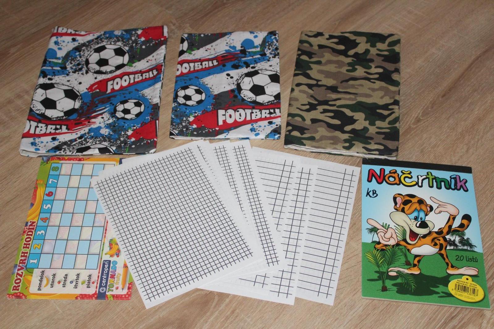Šité obaly na knihy/zošity, teda sú trvalejšie a aj prírodu chránia (nepotrebujete obaly z umelej hmoty). Pridávam k nim 10 kusov riadkovačov, rozvrhy hodín a náčrtník, všetko vo výbornom stave.